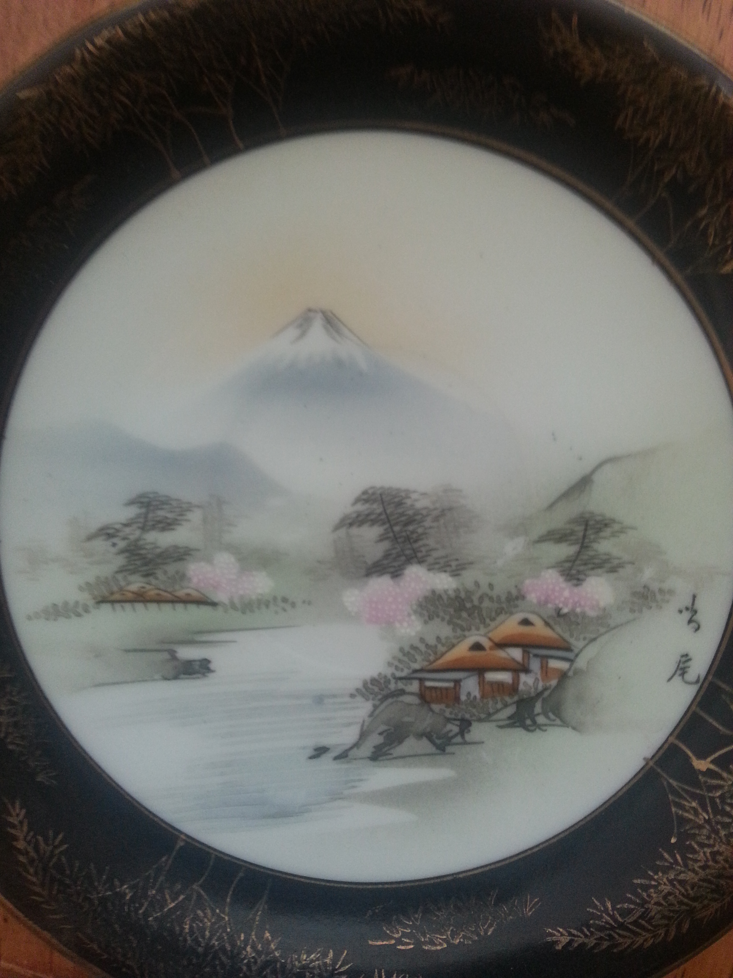 I have been unable to find information on my china set. There is NO makring on the back of any of the pieces. It apears to be hand painted? The cherryblossom trees are textured, it is a full landscape scene pattern, and the only identifying mark is two kanji symbols on the lower right hand side of the image. I will upload a photo for viewing. The material is this, so thin I worry about breaking it and keep the entire set boxed up safely.