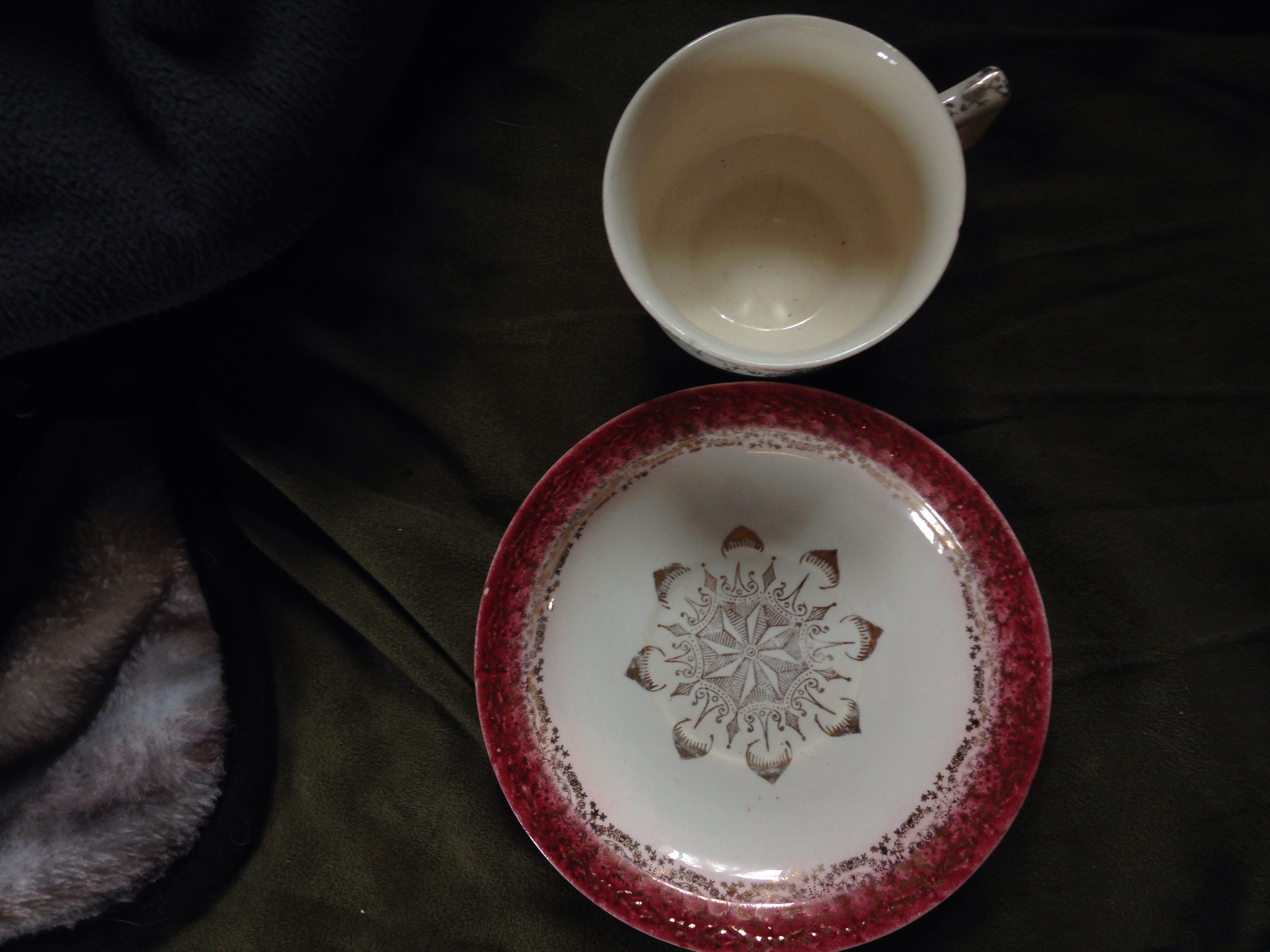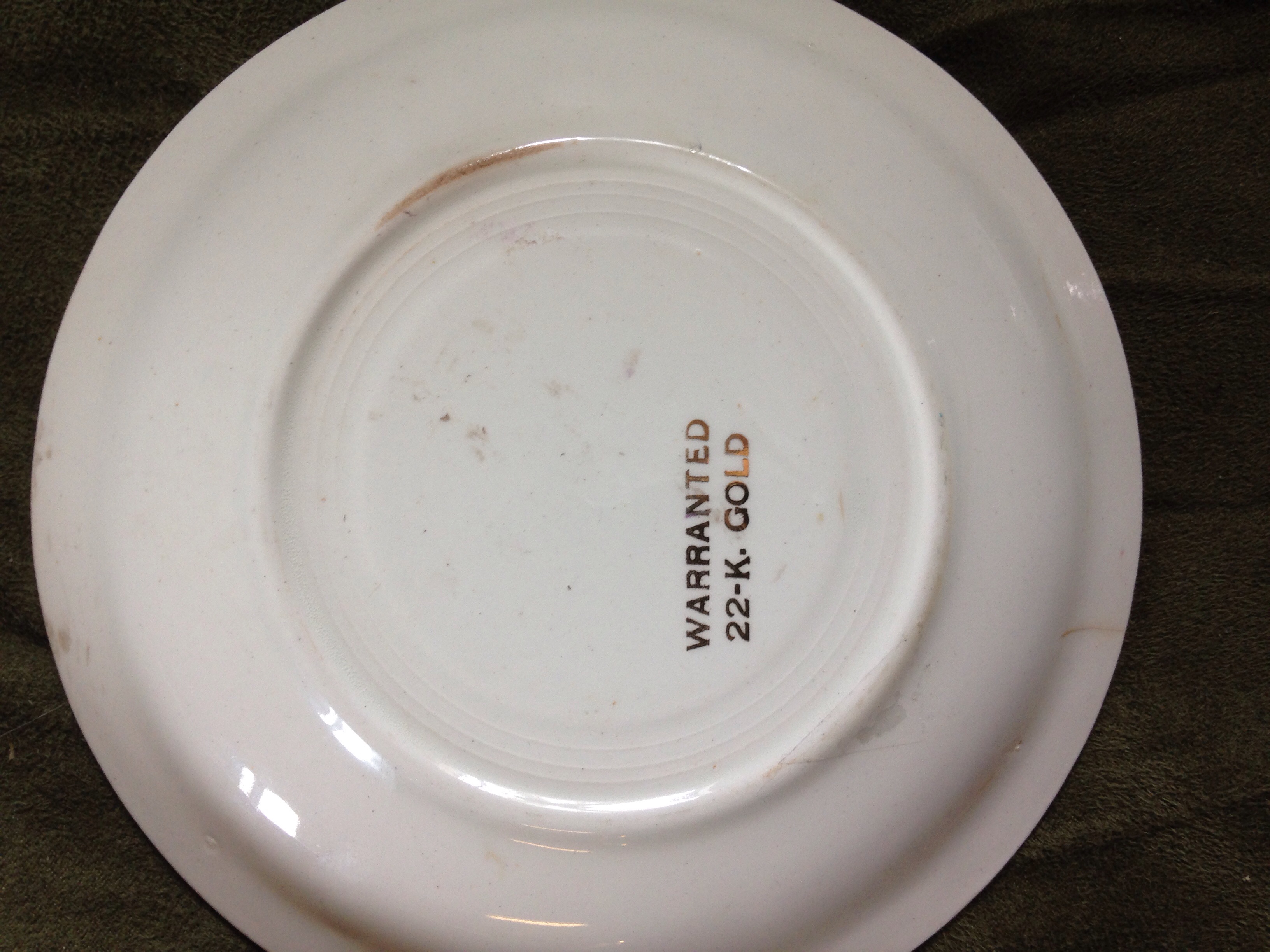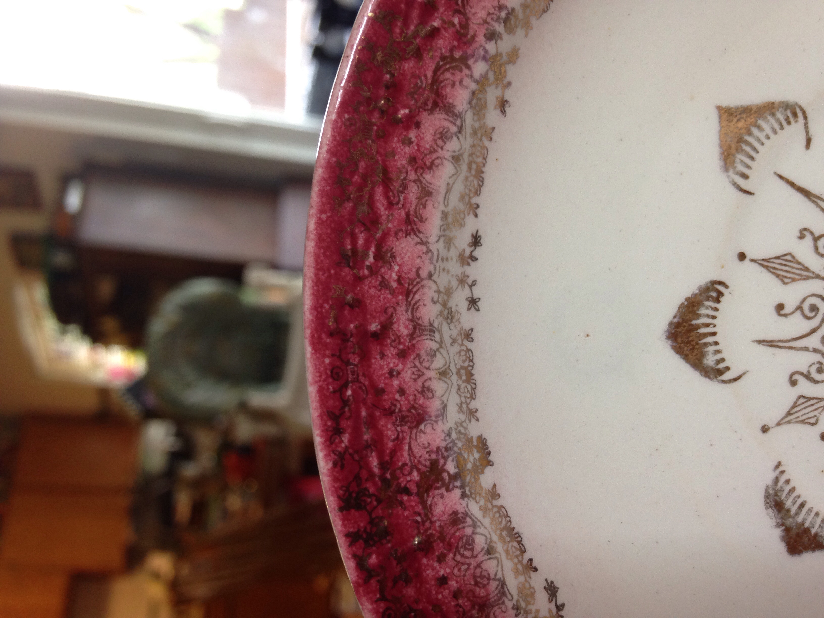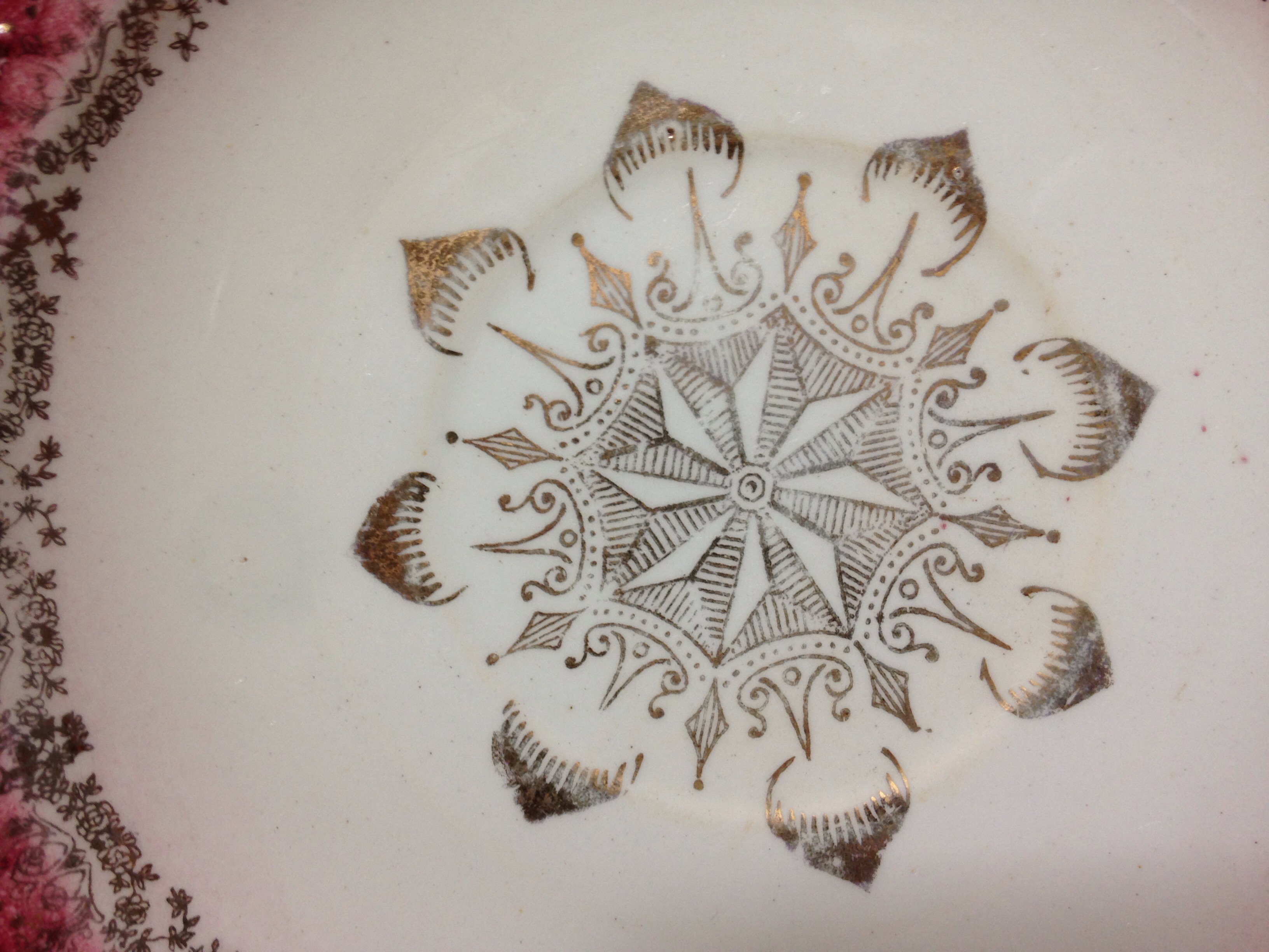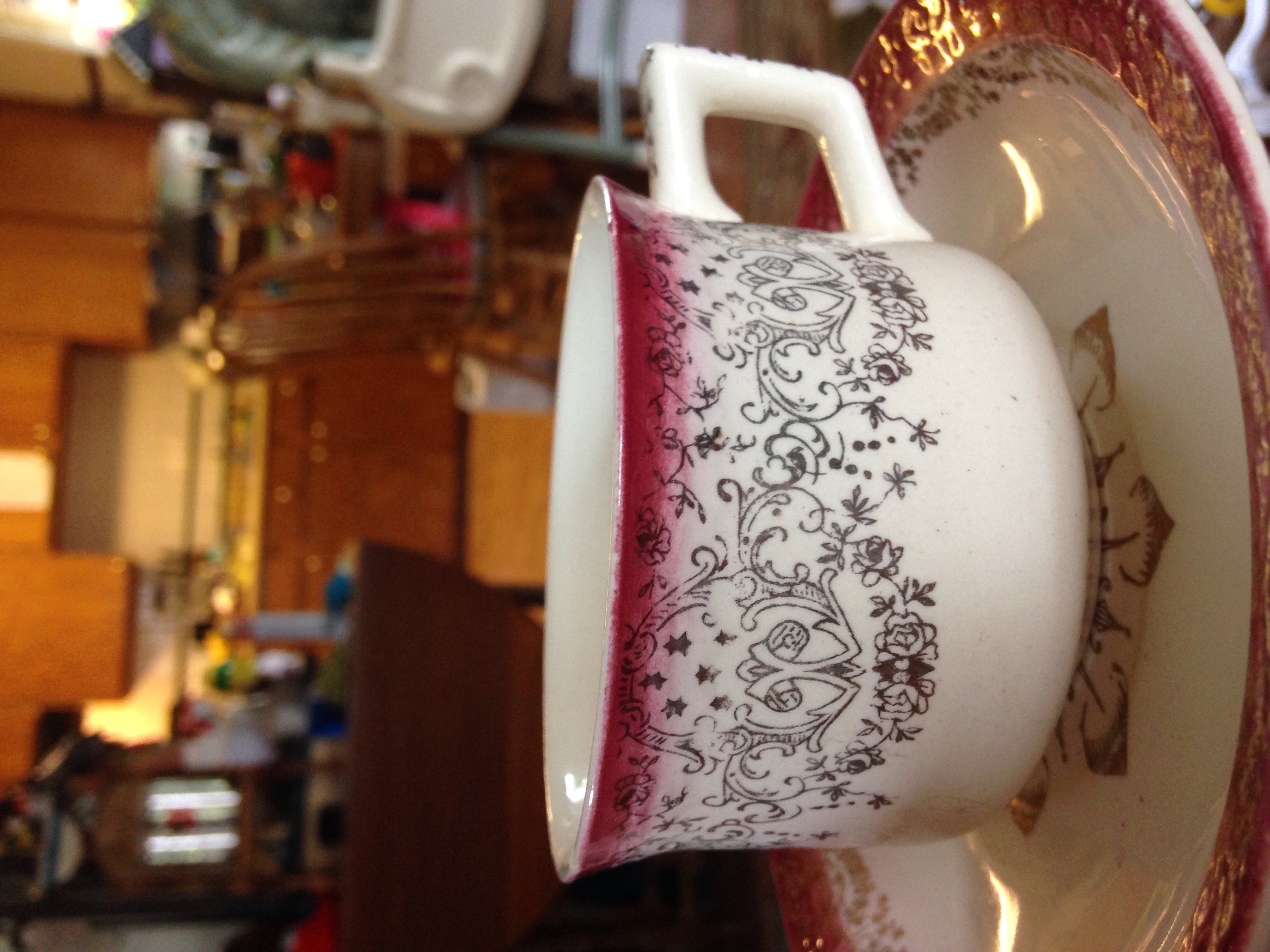 There's only one marking on the saucer states "Warranted 22-K. Gold" they're a darker pink endge with fine gold designs the saucer border is about a 1/2" of dark pink with very fine detailed gold design the center has a star like pattern again in gold both bolder and fine lines and design. the cup has a 1/4" dark pink with about a 2" fine gold designs