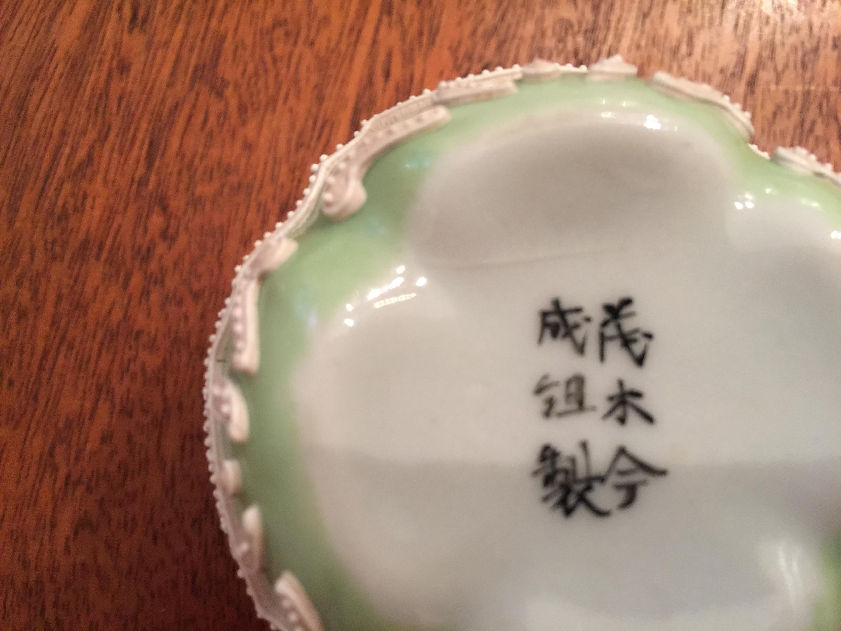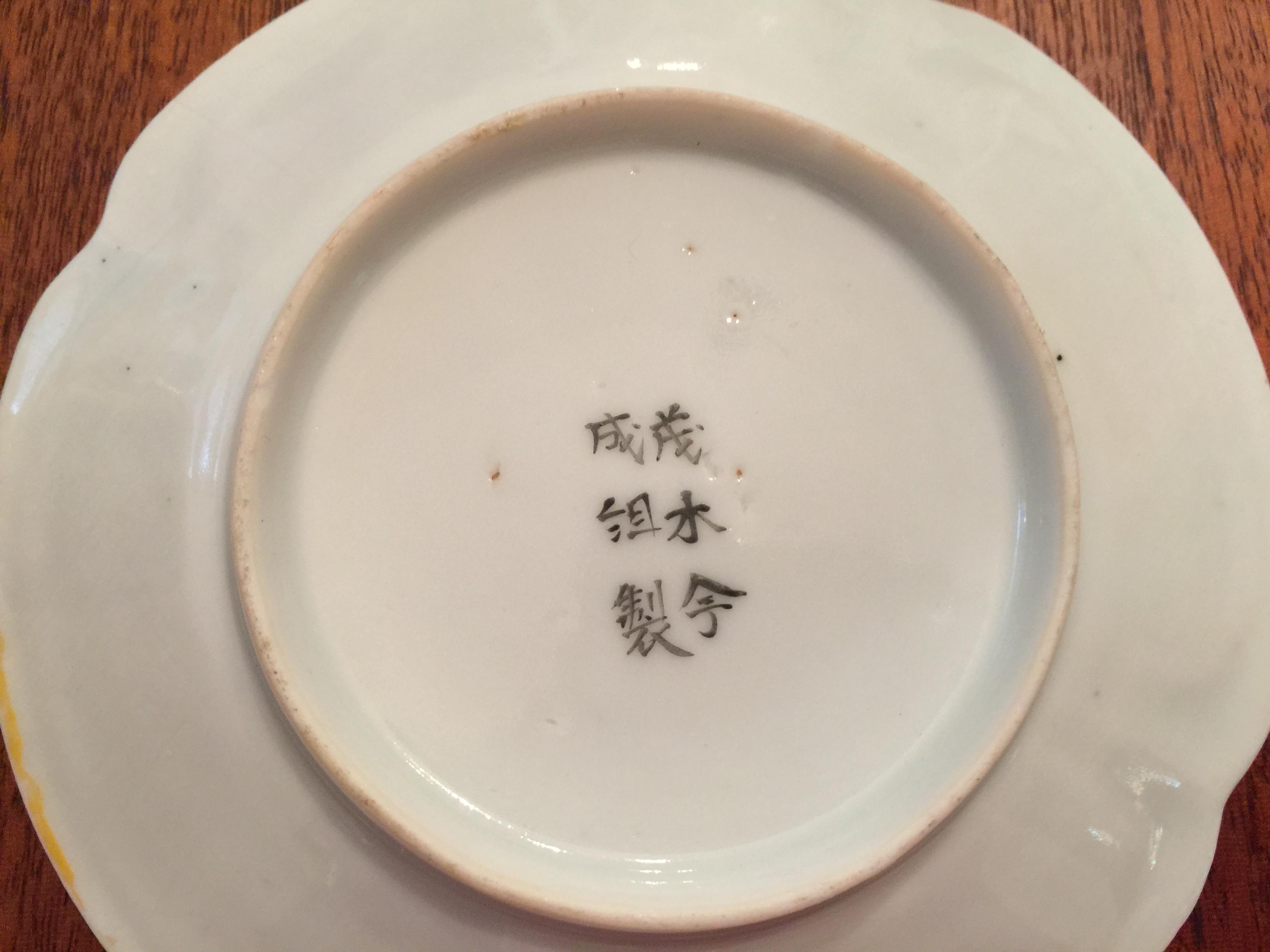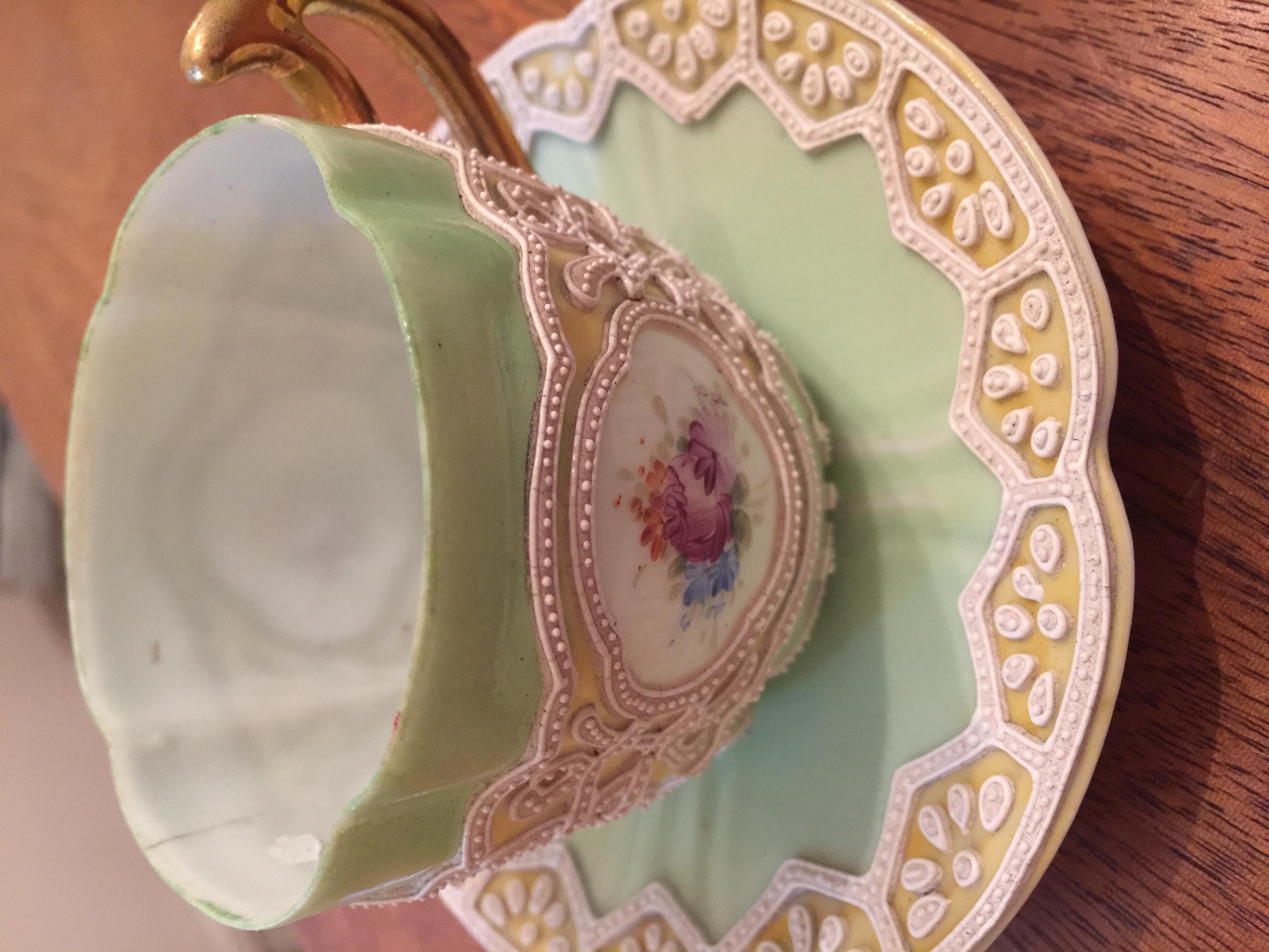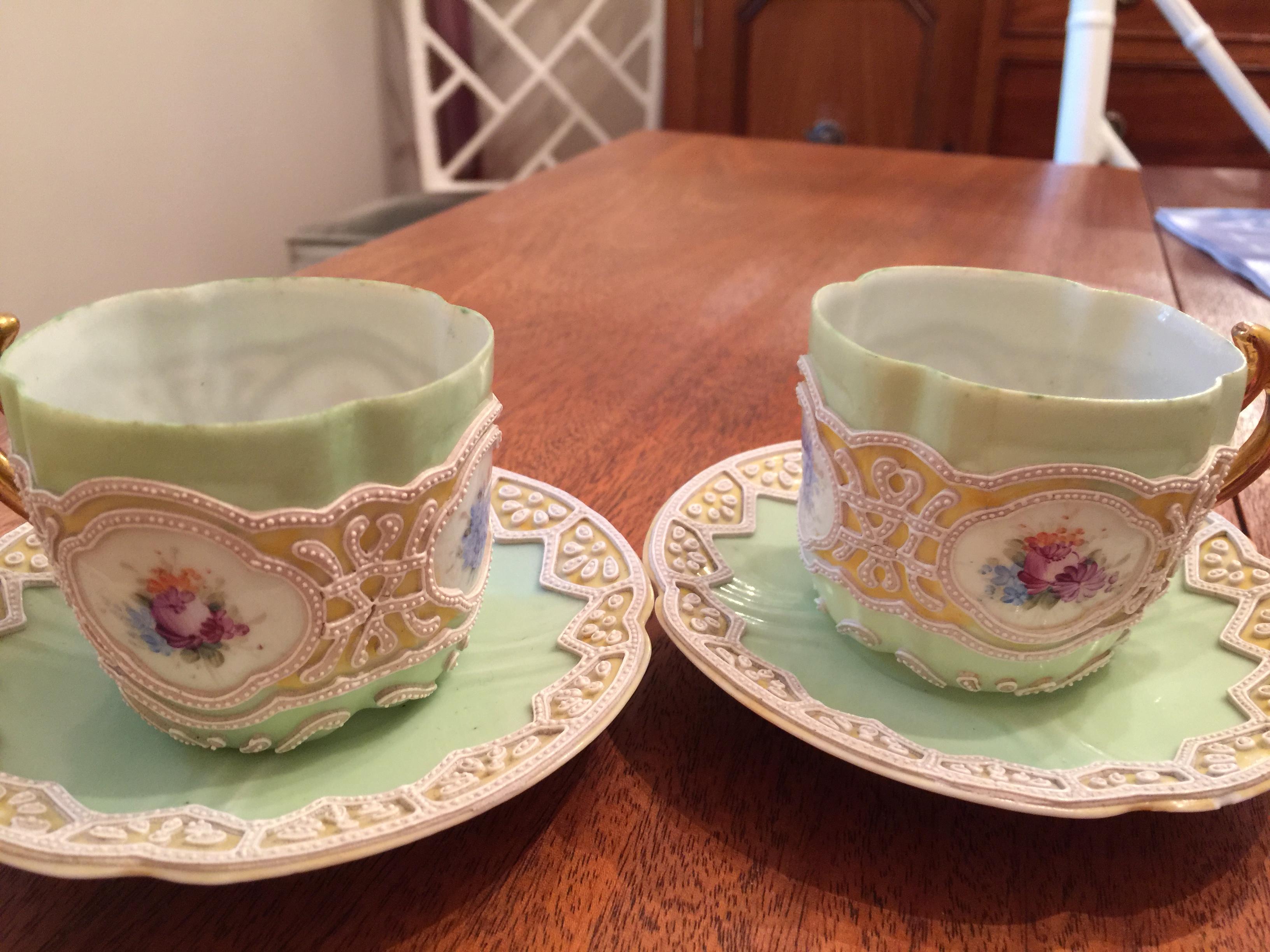Two tea cups with elaborate filigree. The cups are thin and feel like plastic to me. The saucers are China. Marking on bottom.