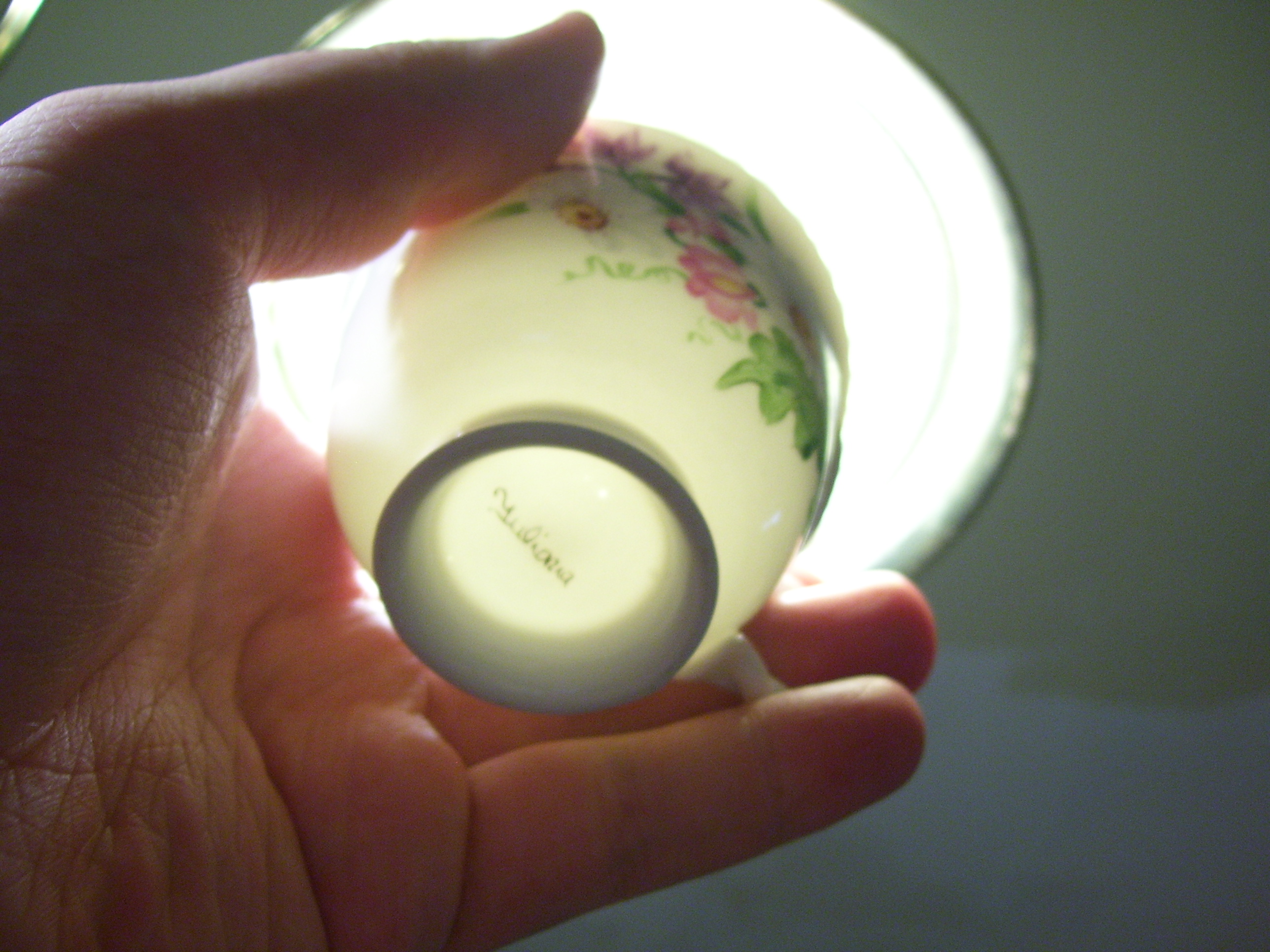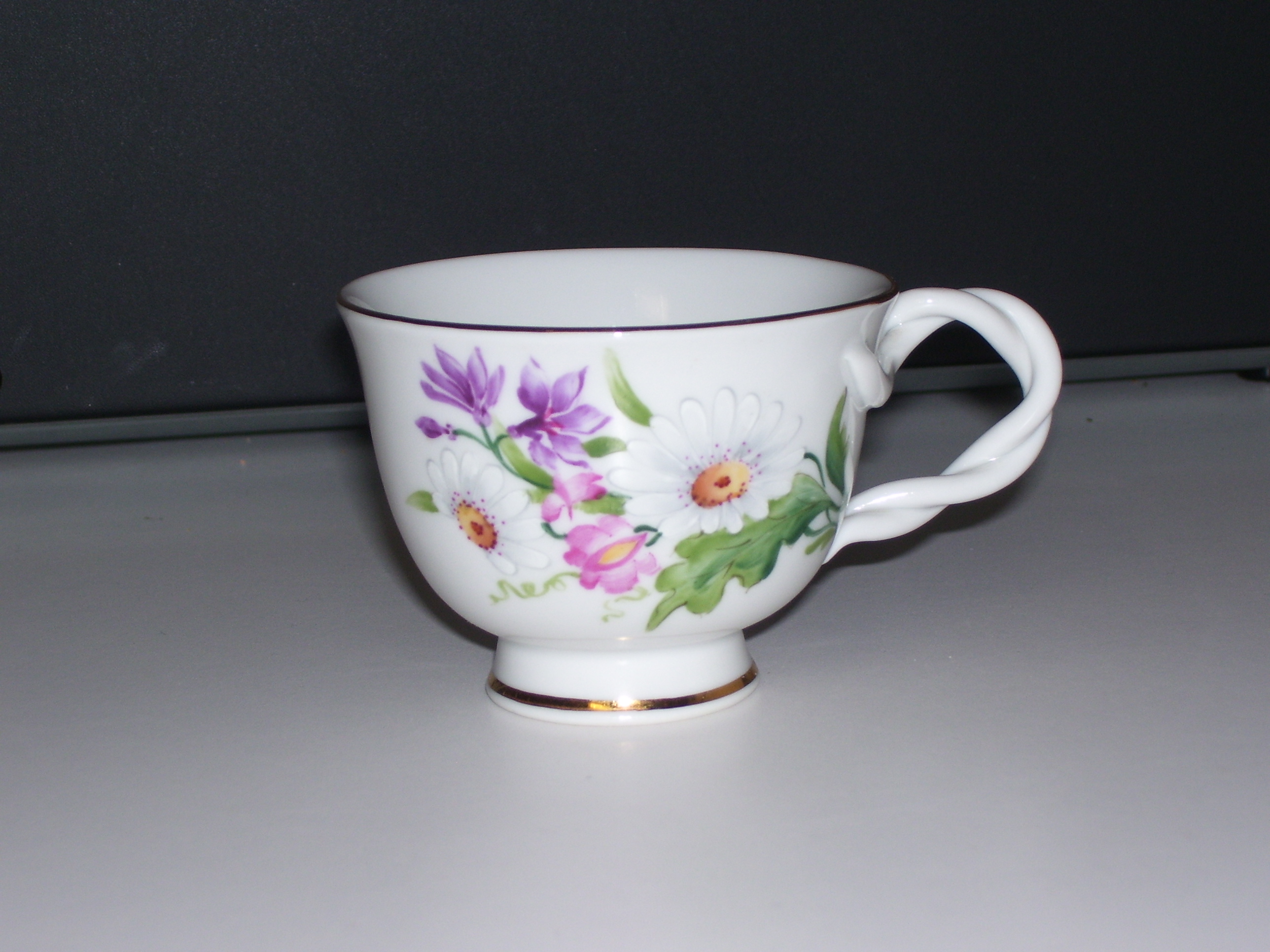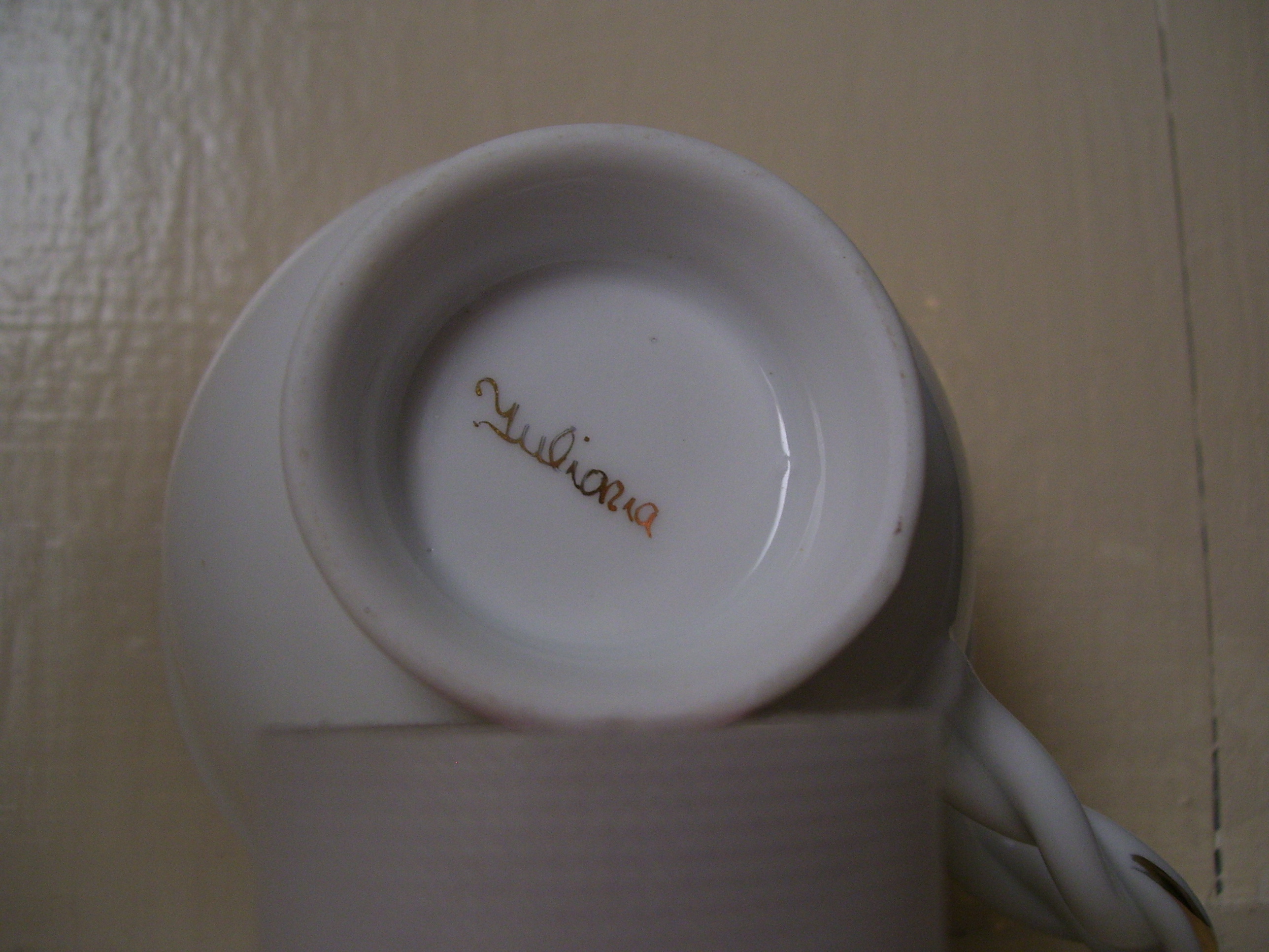 White Tea Cup with 2 Daisy's, a set of pink and purple flowers, and a touch of leaves (only on the one side)with gold trim on the rim and base, Rope handle with some gold on the outter part of the handle. On the bottom shows the makers's tag in gold, but is difficult to make out, no other markings on it. No chips or cracks that are visable to the untrained eye. I have searched on the net for diferent makers ie. Yuliania, Juliania, Guliania, Suliania, ect