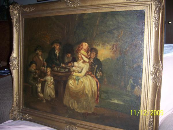 The dimensions above are in frame dimensions. The frame is elaborate gilded gold in color. The canvas measurements are 24.5 W x 19"H. This oil is entitled "A Tea Garden." Through some research, I found this painting was originally painted by George Morland and I also have the print of the same title by George Morland. Print dimensions in frame 27" W x 23" H.  Photo's of Oil and Print are below.   I am interested in the value (of both) as I would like to sell them. Thank you for your time and consideration. Lynn Watters