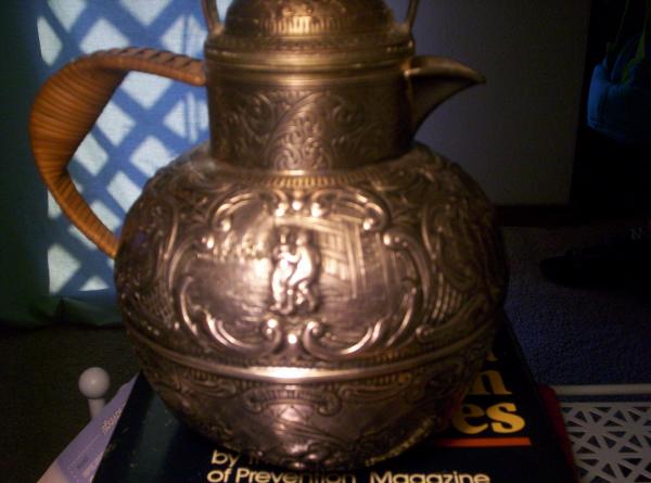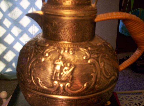 Very ornate.Handle is wicker. Lid had flower designs on handle on top 3 flowers with vine like designes. the base has several designes incliding 2 scenes one of dancing couple on the other 2 people playing instruments.several birds surrounded by flowers and below the handle a basket with flowers. 90% of it is covered in some kind of designs.