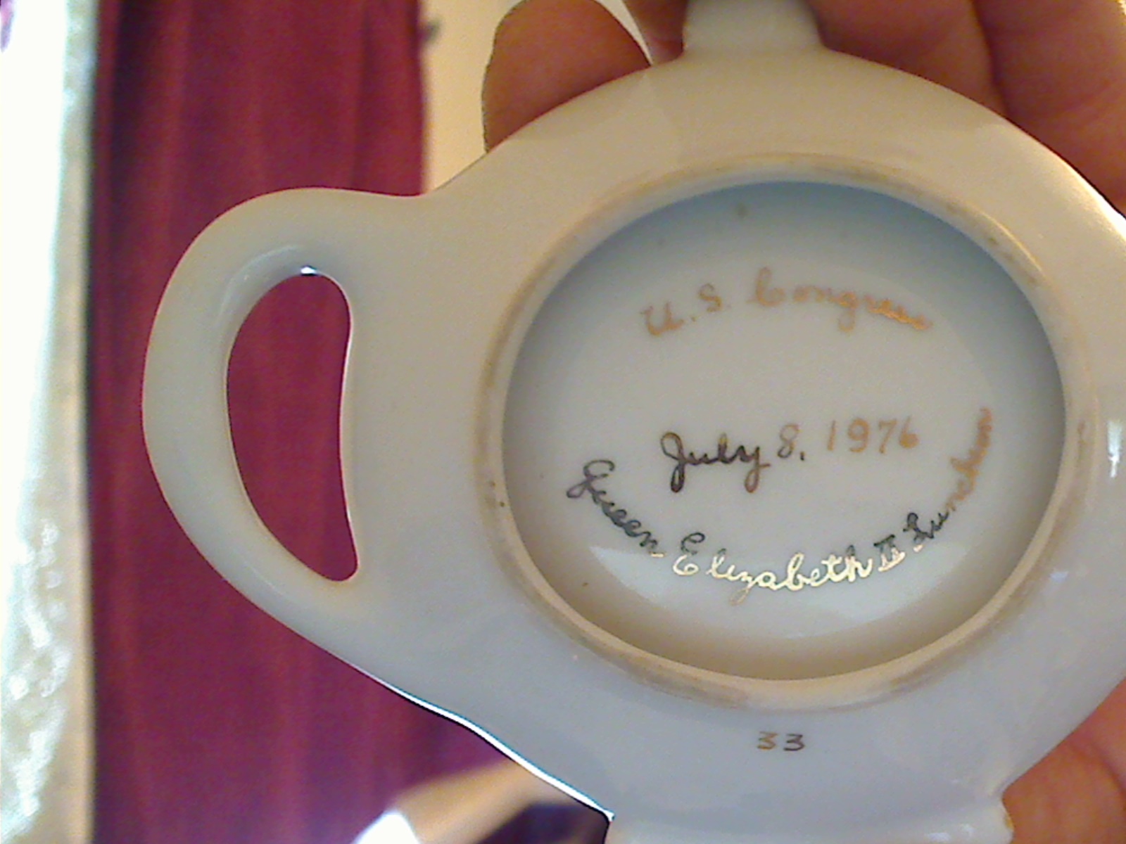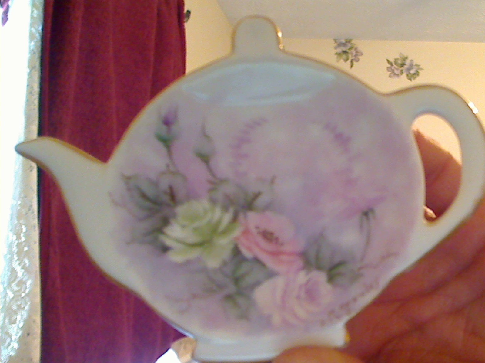 Tea pot shaped saucer with a floral print(roses). It is signed M.Crowley,and thr back reads: U.S.Congress
