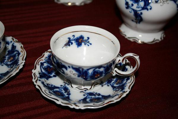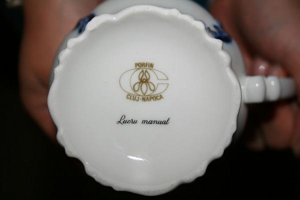 Gold mark on bottom in the shape of an outlined C with a funny looking mark in the middle. Says porfin on top of the C and below it says Clug-Napoca. In black cursive below that it says Lucru manual.