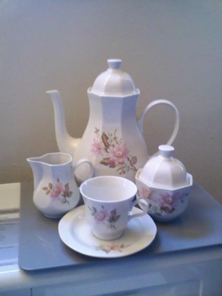 Tea pot, creamer, sugar bowl, 6 saucers, 6 cups