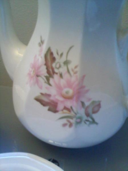 White porcelain with pink flowers, very plain.