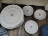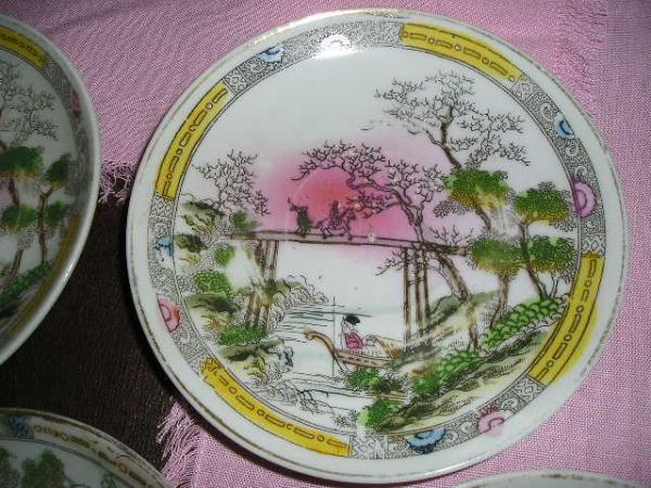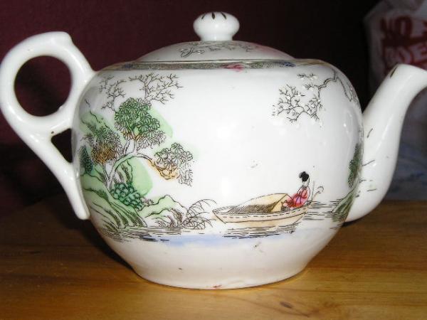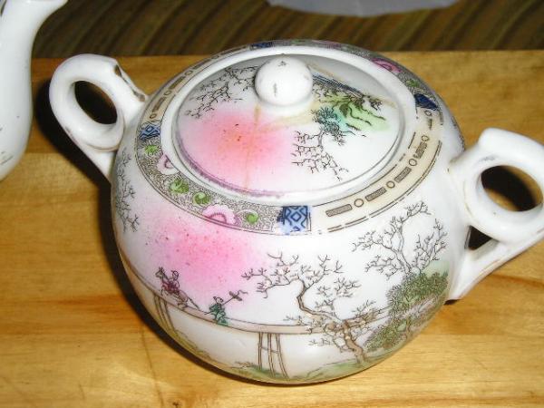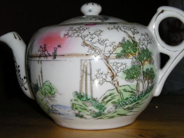 Tea Set. Has 9 saucers, 6 tea cups, 1 tea pot, 1 sugar bowl. 3 of the tea cups are missing. No distinguishing marks or signature except on the bottom of each piece it says, "Made in Japan". Would like to know what it is worth approx. and if I can get replacement tea cups for it.