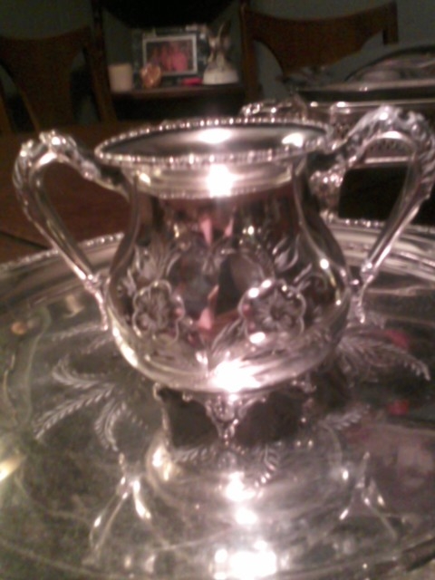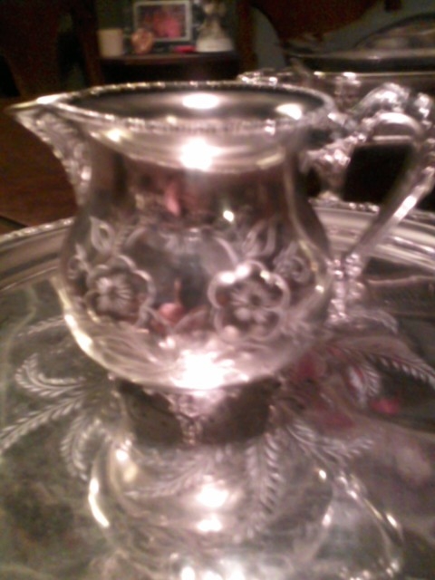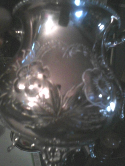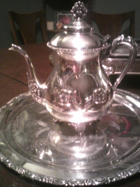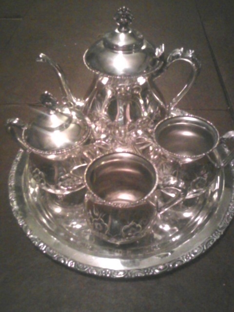 all 4 pieces have the same design on the front of them there is a ding on the lid to the tea pot