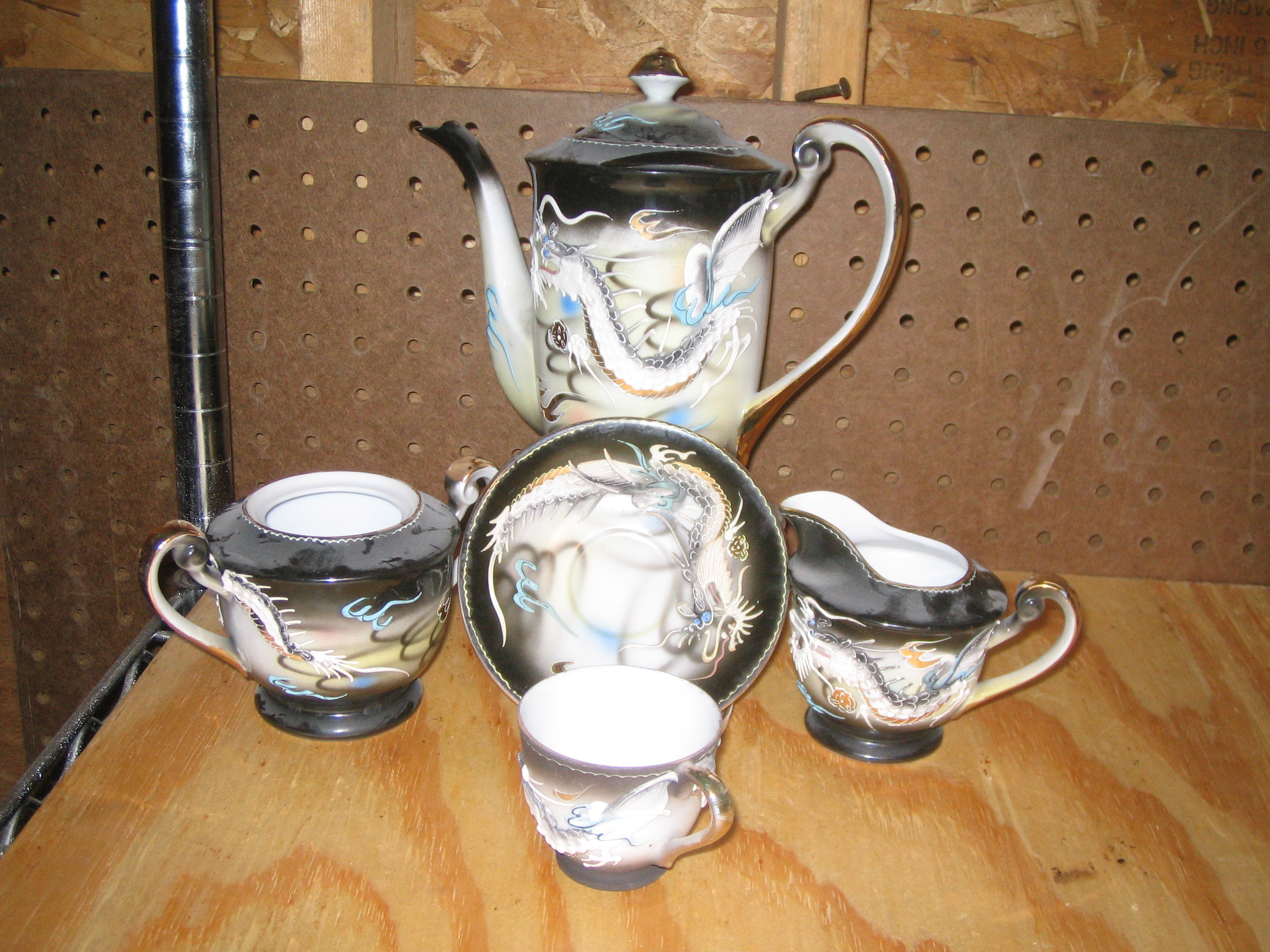 Your set is what's called Dragonware, it was made in Japan from the 1890's right through to the 1960's, your set is typical for examples made after WW2. It was made in huge numbers and brought back by American service men after WW2, Korea and Vietnam. Most full sets sell for under $200.00.