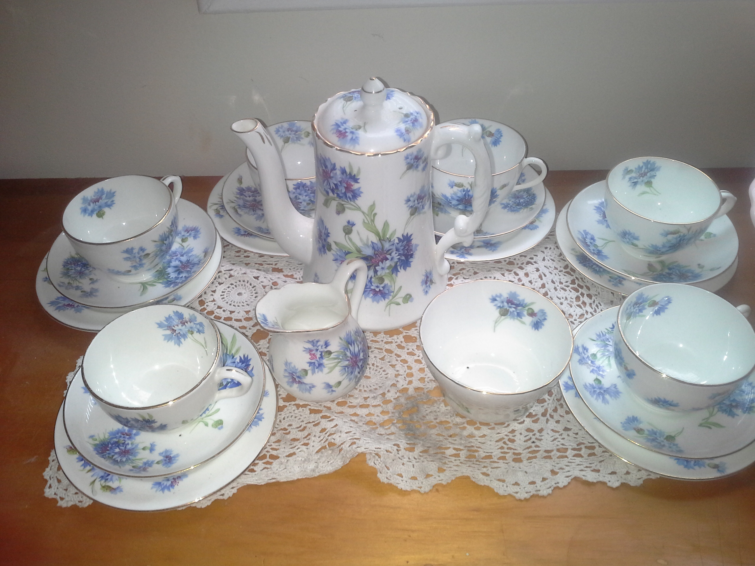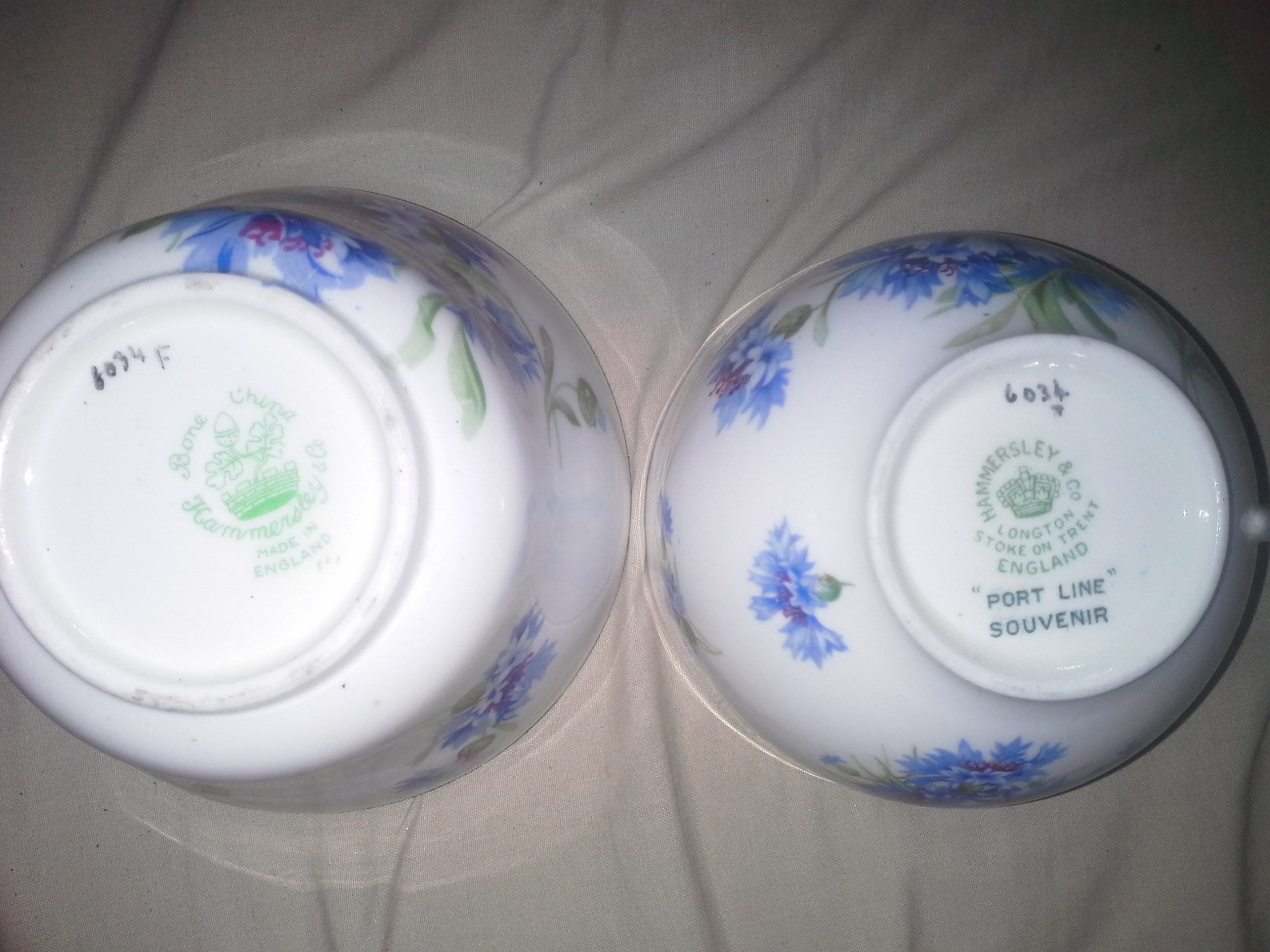 I'm interested in the history and value of this tea set. It appears to be two sets, the teapot, milk jug and sugar bowl are marked " bone china Hammersley & Co made in England" the cups, saucers and plates are marked, " hammersley & Co london, stoke on trent England, port line souvenir" I believe the pattern is "corn flower".