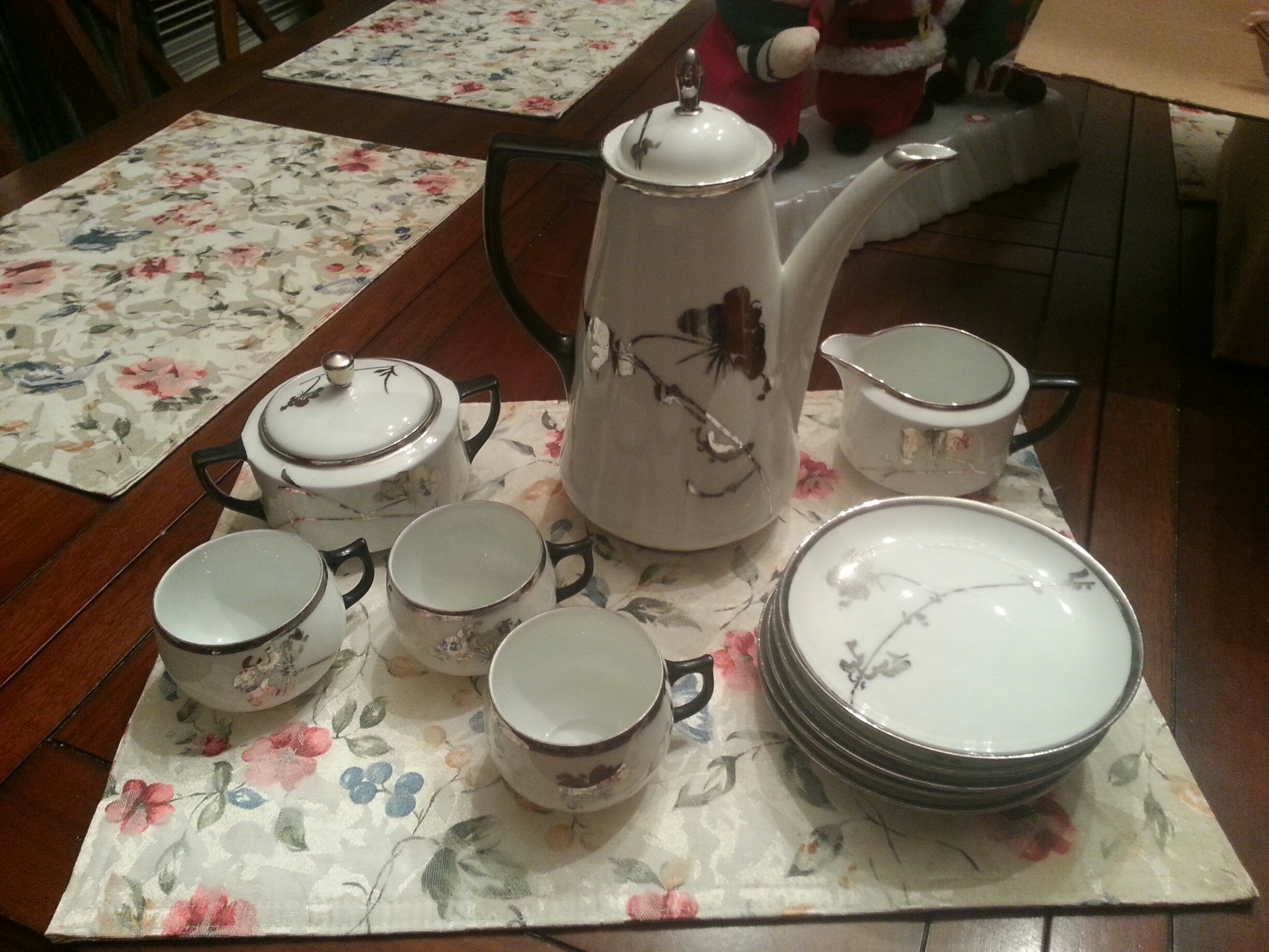 tea set with pot, creamer and sugar. 5 plates and three cups.