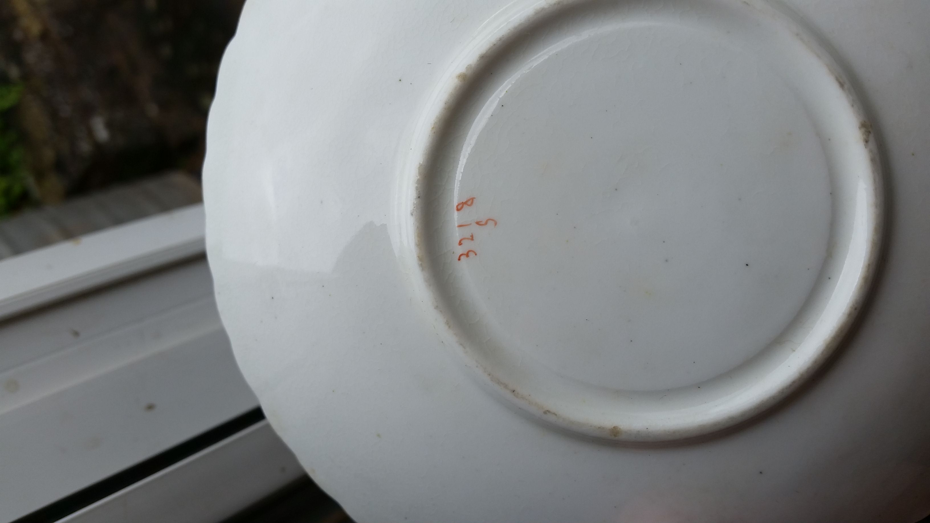I found a whole set of these thin china cups and plates etc. Some have no stamp and no writing. Others have painted numbers on the bottom. They are very thin glazed china white with blue Thorny flowers/bramble/dog rose? Gold edges.