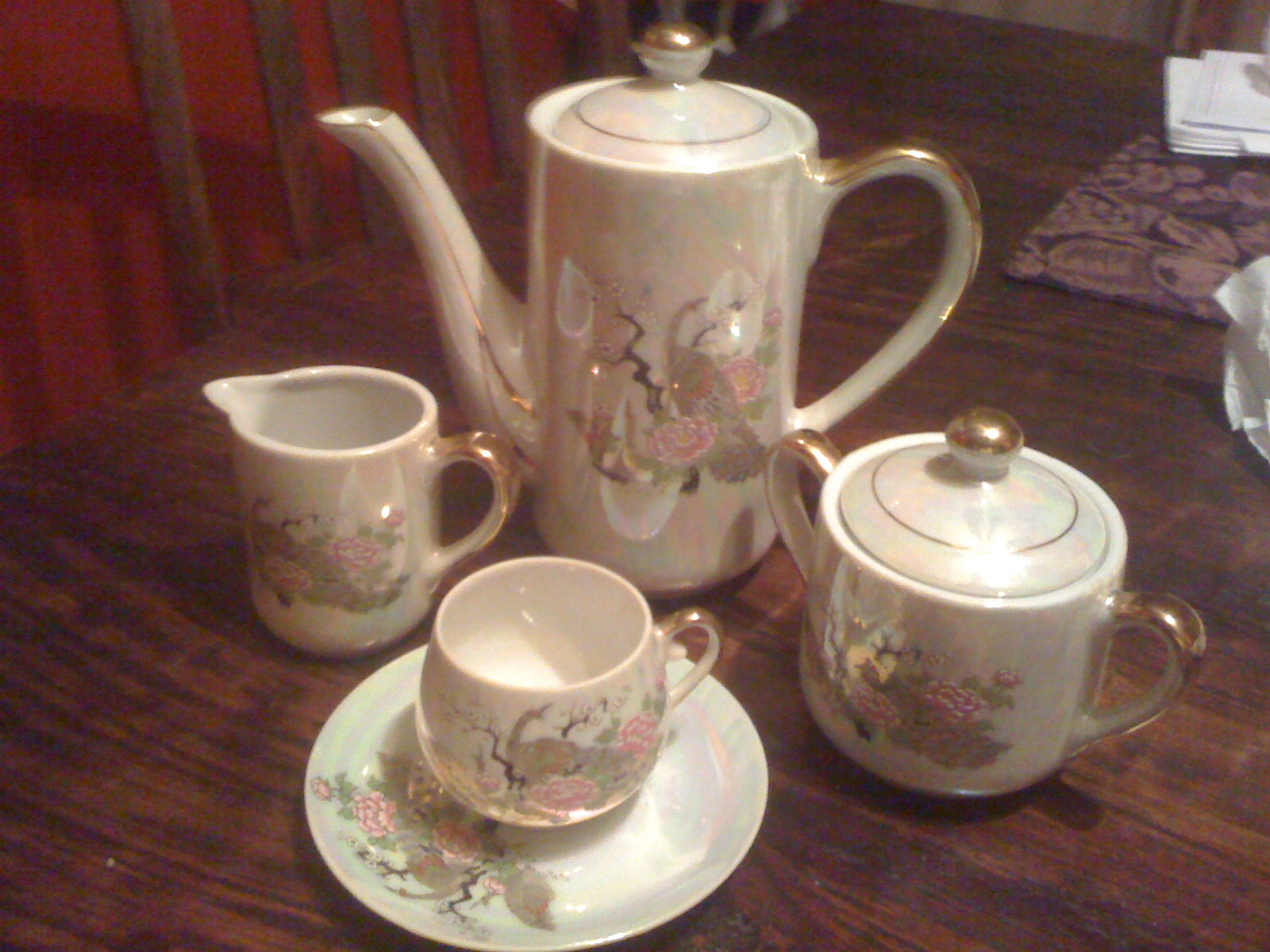 SET OF SIX TEACUPS AND SAUCERS, CREAMER, SUGAR BOWL, LARGE TEAPOT. UNQUE IN COLOR: OPAL BACKGROUND WITH GOLD HANDLES AND GOLD IN THE PICTURE OF PEACOCK. GEISHA GIRL PHOTO AT THE BOTTOM OF EACH CUP.