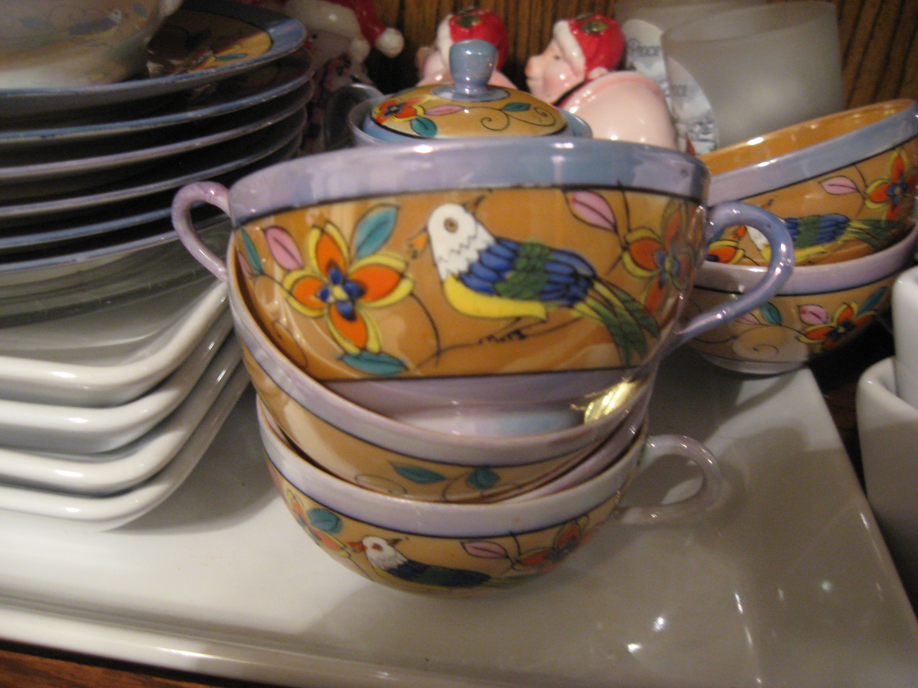 I am 54, and got these passed to me from my Great Grand Parents who lived in Huntington, WVa. Not sure of the year. Hand painted (can feel the texture when rubbed with finger). Inside of cups have gold color inside. I have dishes, saucers, teapot, sugar bowl, etc.