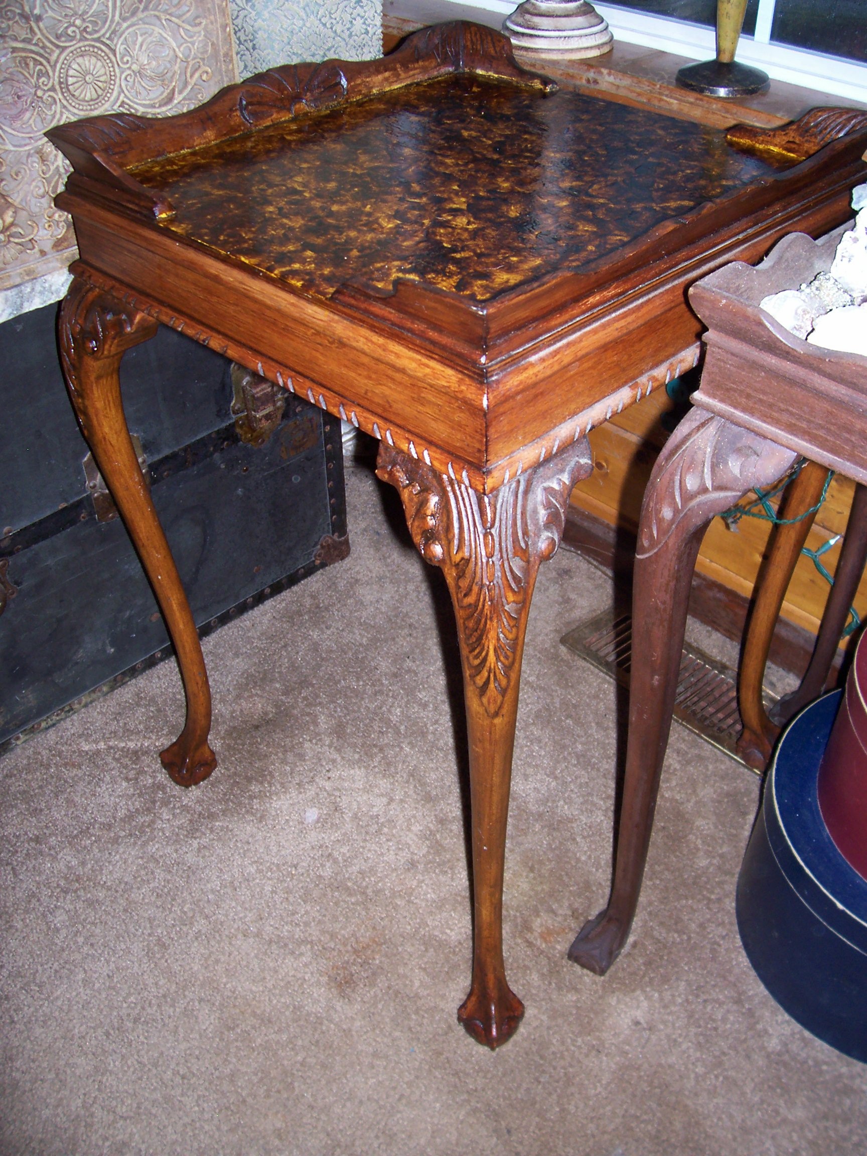 I bought this table at a garage sale and it had like 10 coats of white paint on it. I didn't even know the legs were so detailed. It took me over a week to clean out all details with paint remover. The top of the table I painted to look like burled wood. I wouldn't have done that if I realized it might be worth something. I was new at antiquing.