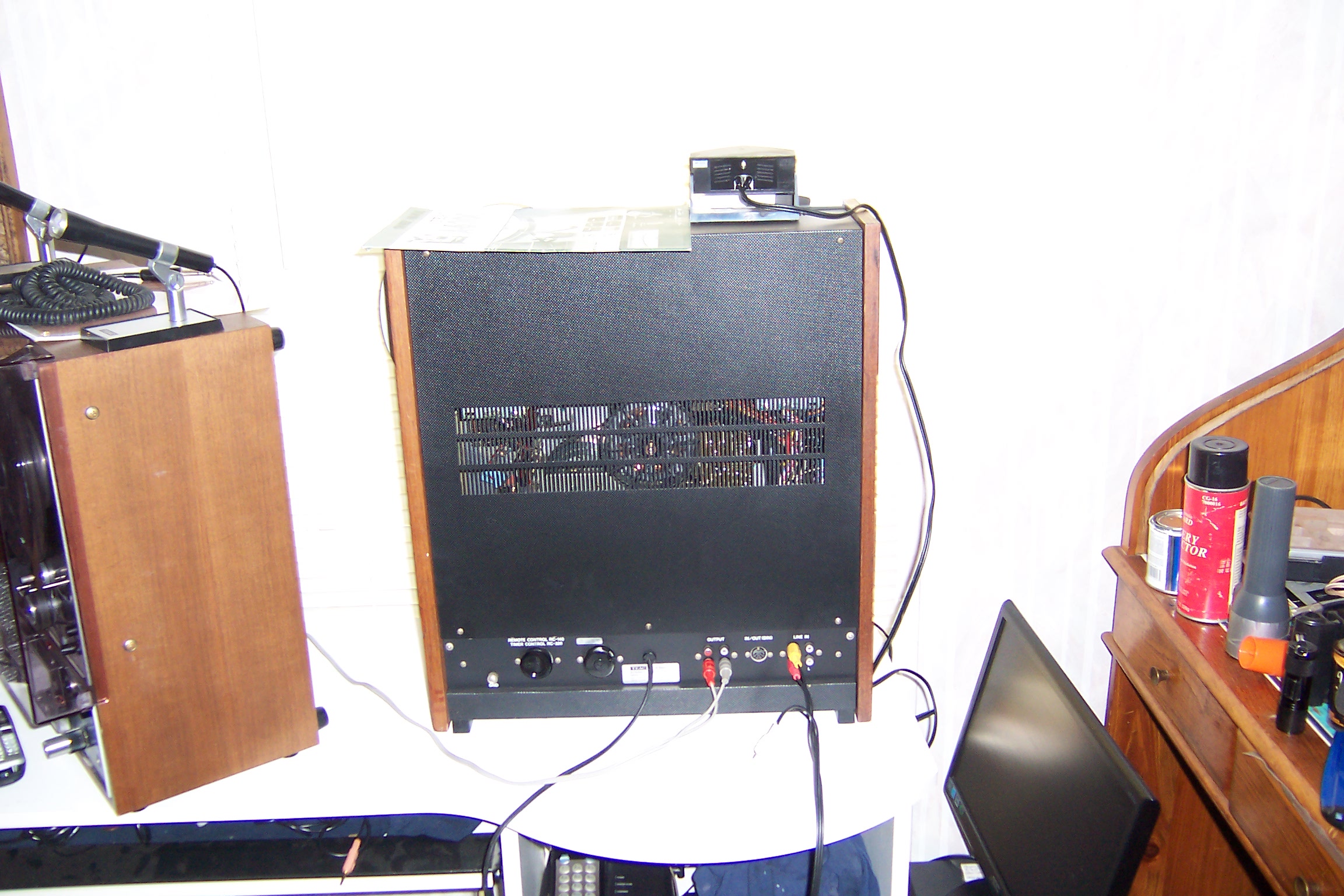 Each channel has its own Large VU meter (with all bulbs working), line input, mic input, and line output as well as level controls for each input and line output.