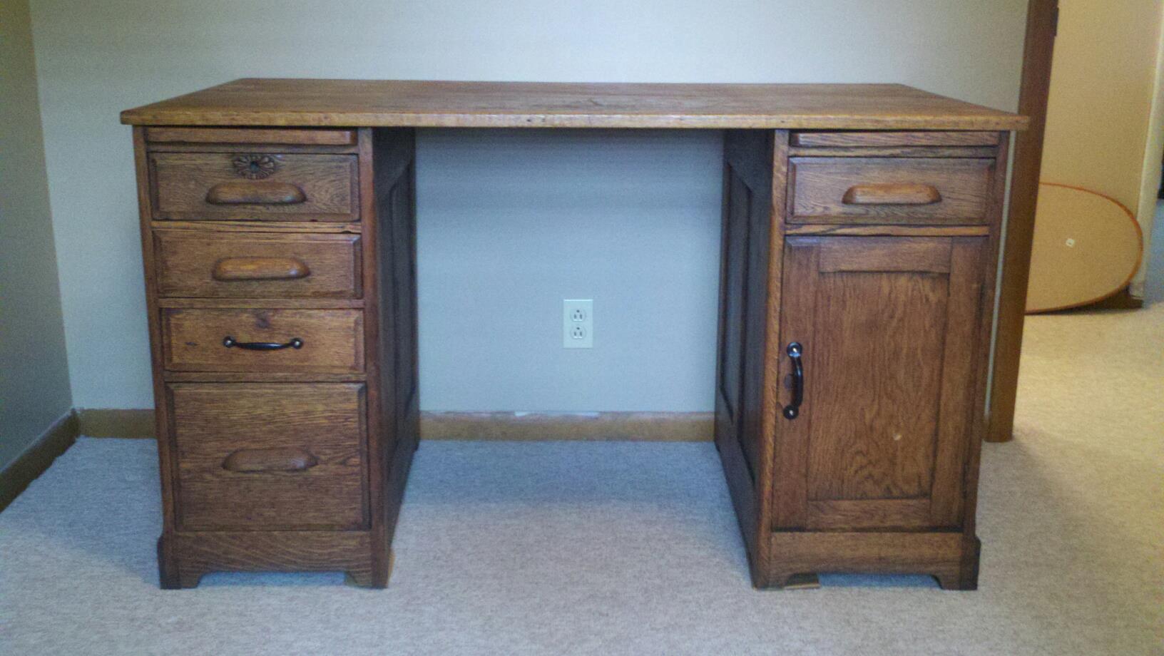 I bought this from an antique mall and they said it was a 1920's teacher's desk. It was in rough shape when I bought it and has since been stripped and stained. It is dovetailed. There is a locking mechanism on one side but it is broken. I have the curved piece that connects the two towers but it is not shown in the picture. I am trying to figure out this desk's value and history.