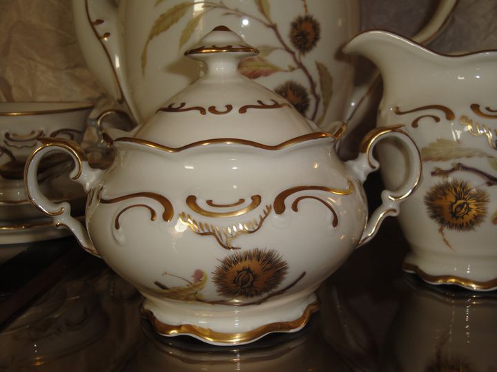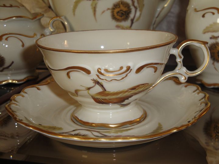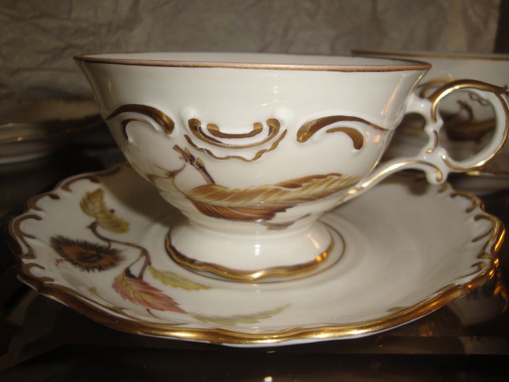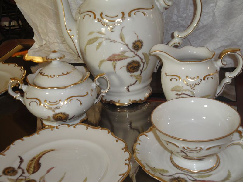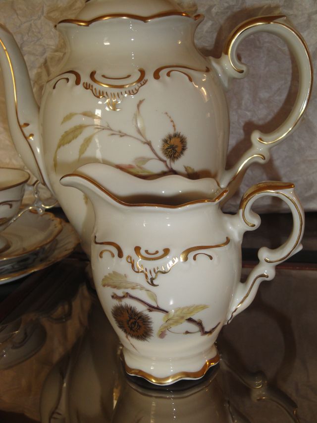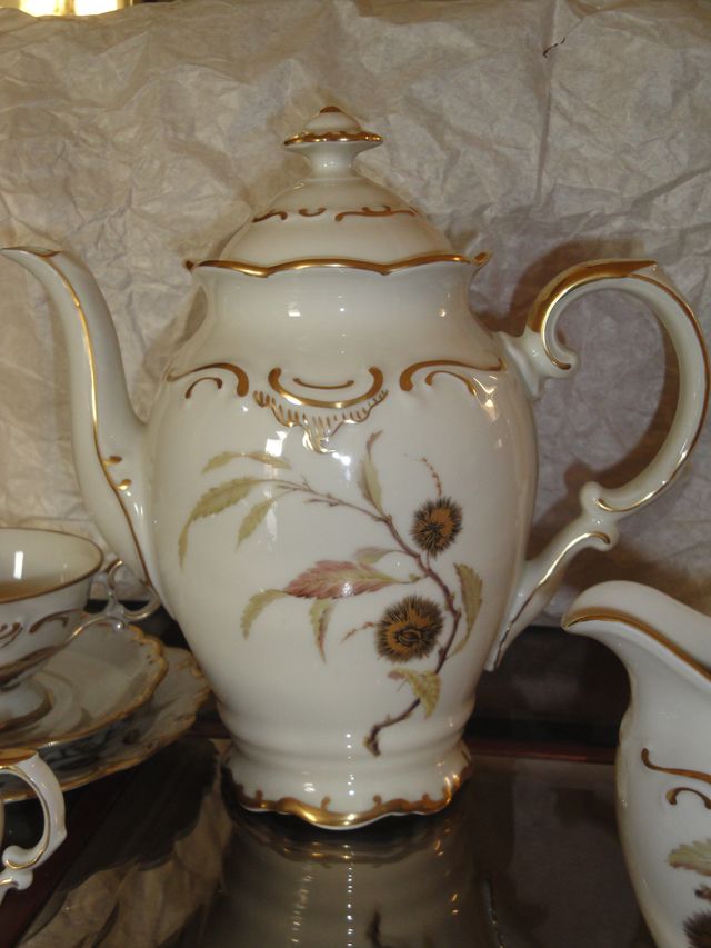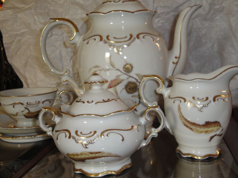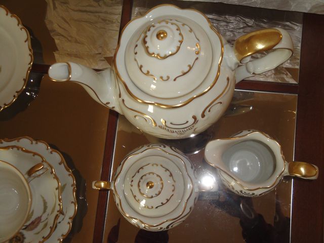 tea set 6 cups 6 saucers a milk jug a sugar bowl and a coffeepot/teapot and 6 dessert plates ALL in perfect condition used only once!