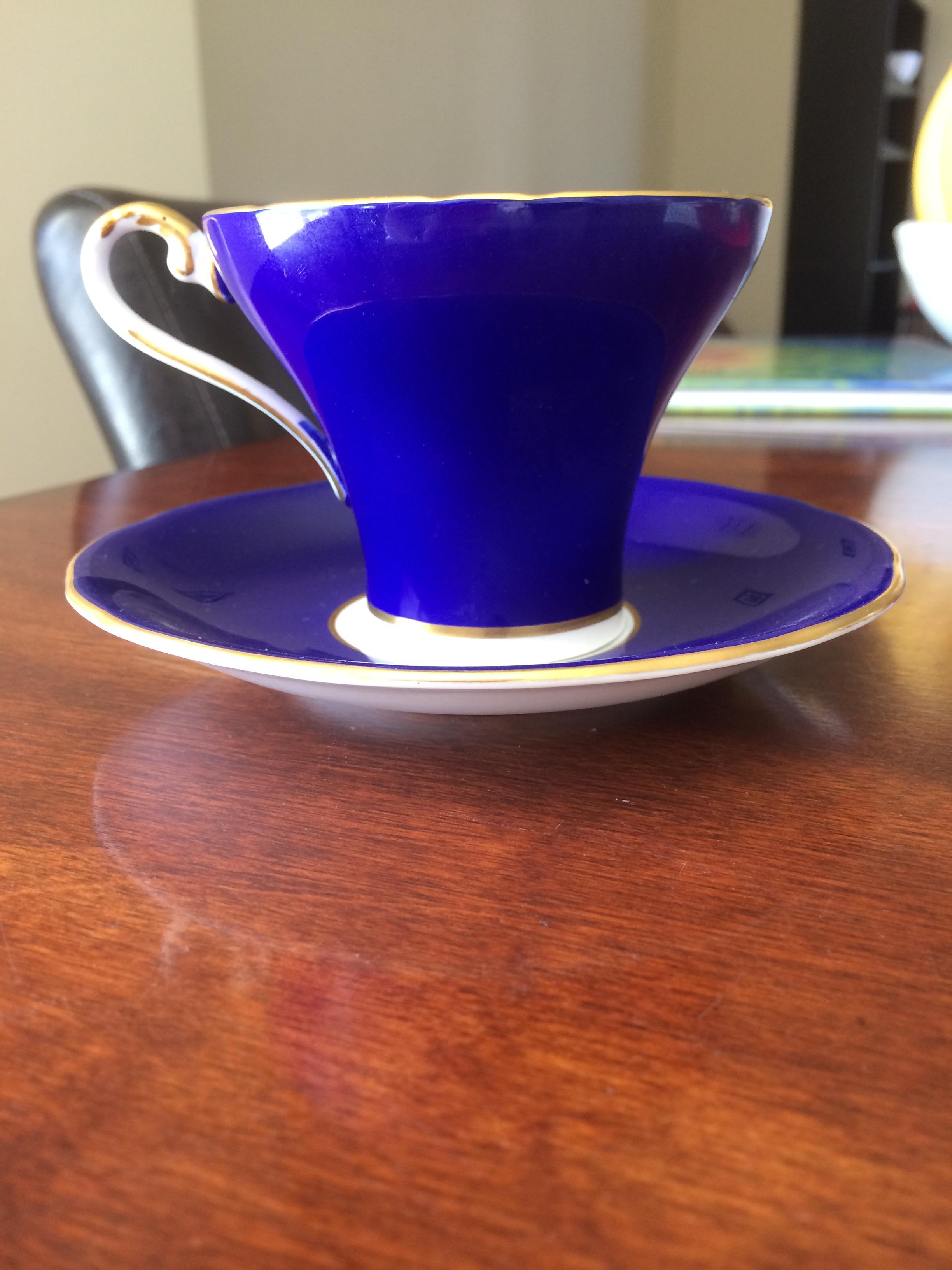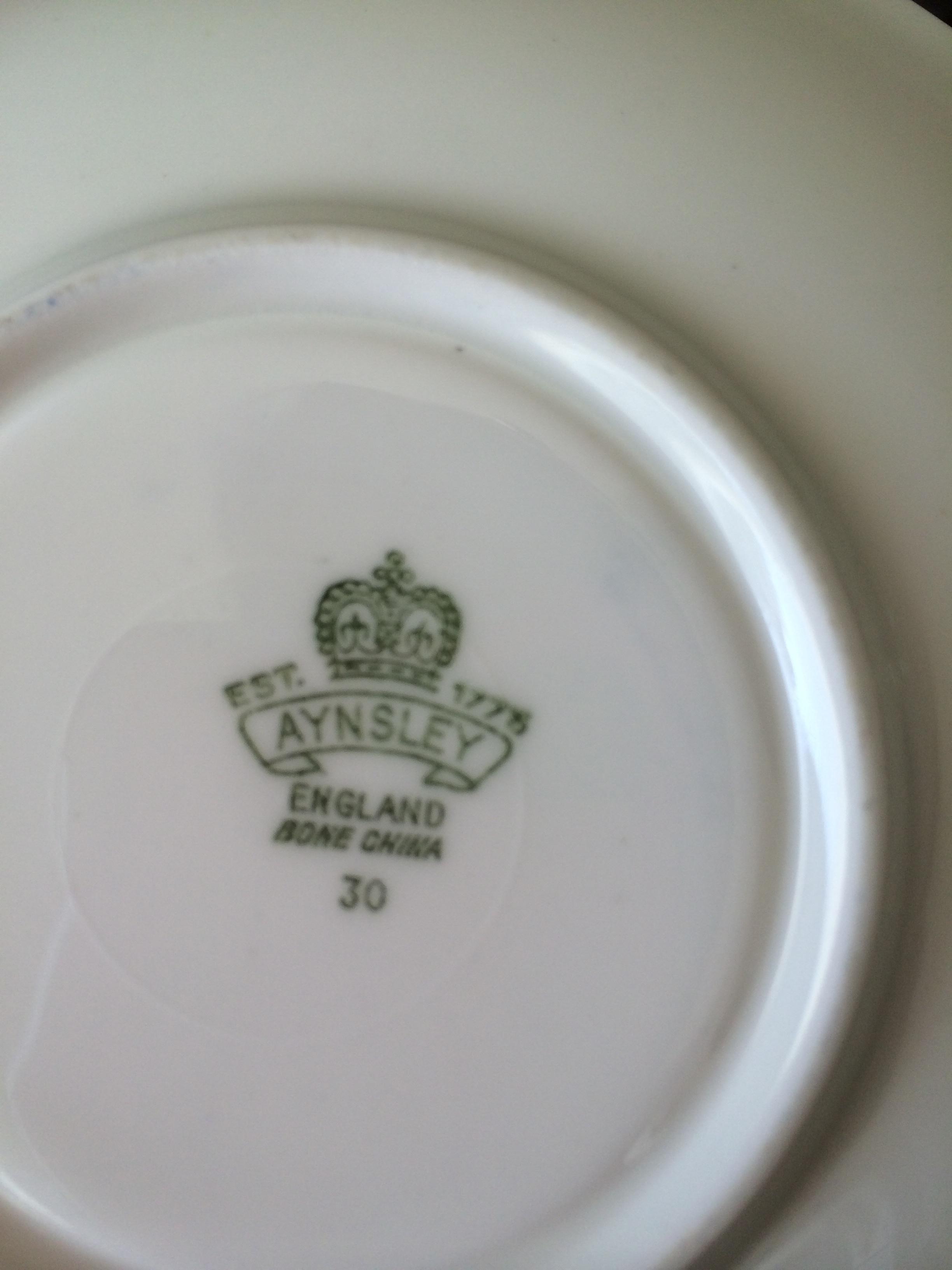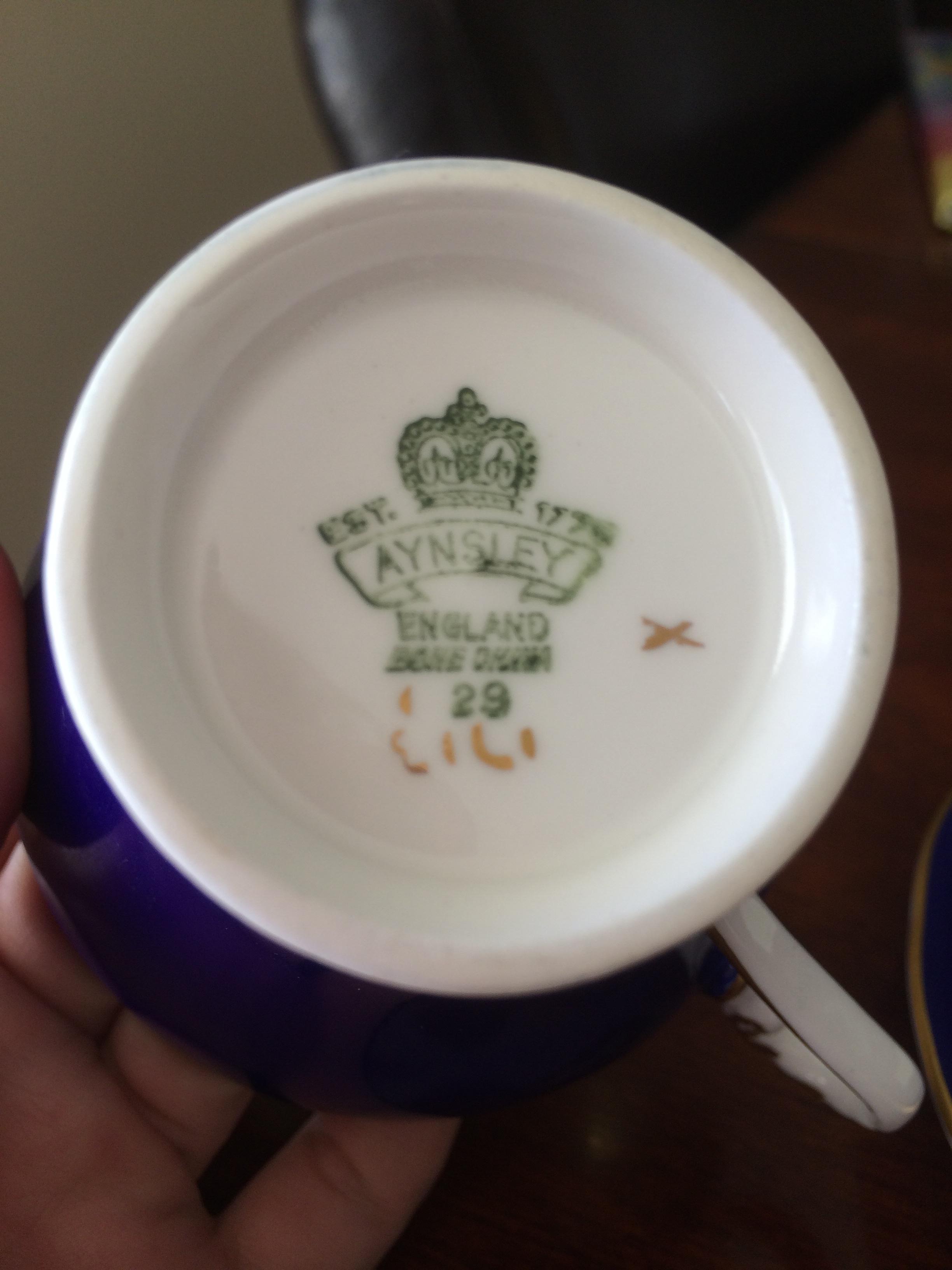 Blue and gold duo excellent condition. Marked est. 177?- last digit smudged. Aynsley england bone china. 29. Has bits of gold markings in the bottom as well. Saucer stamping is very basic.