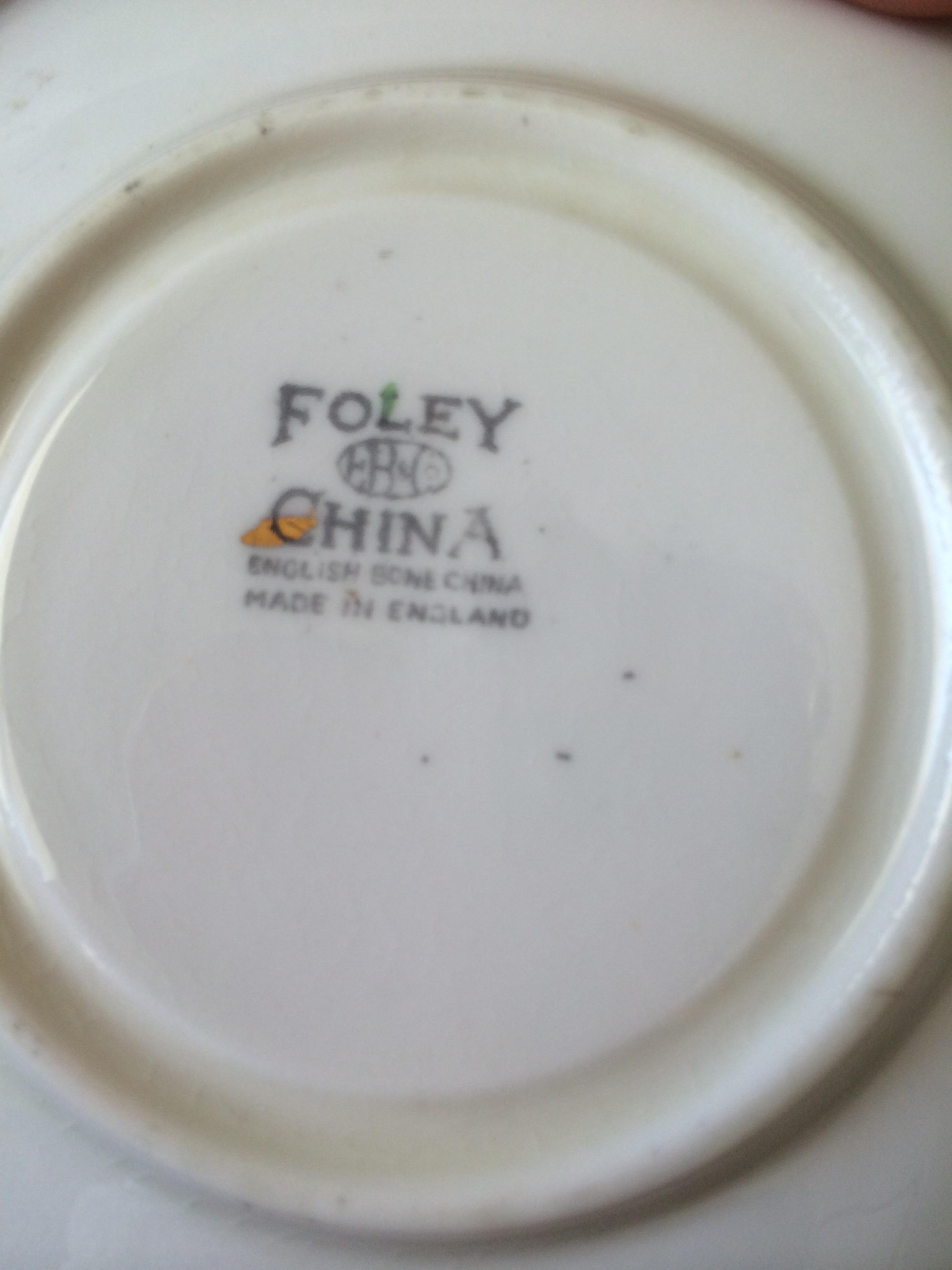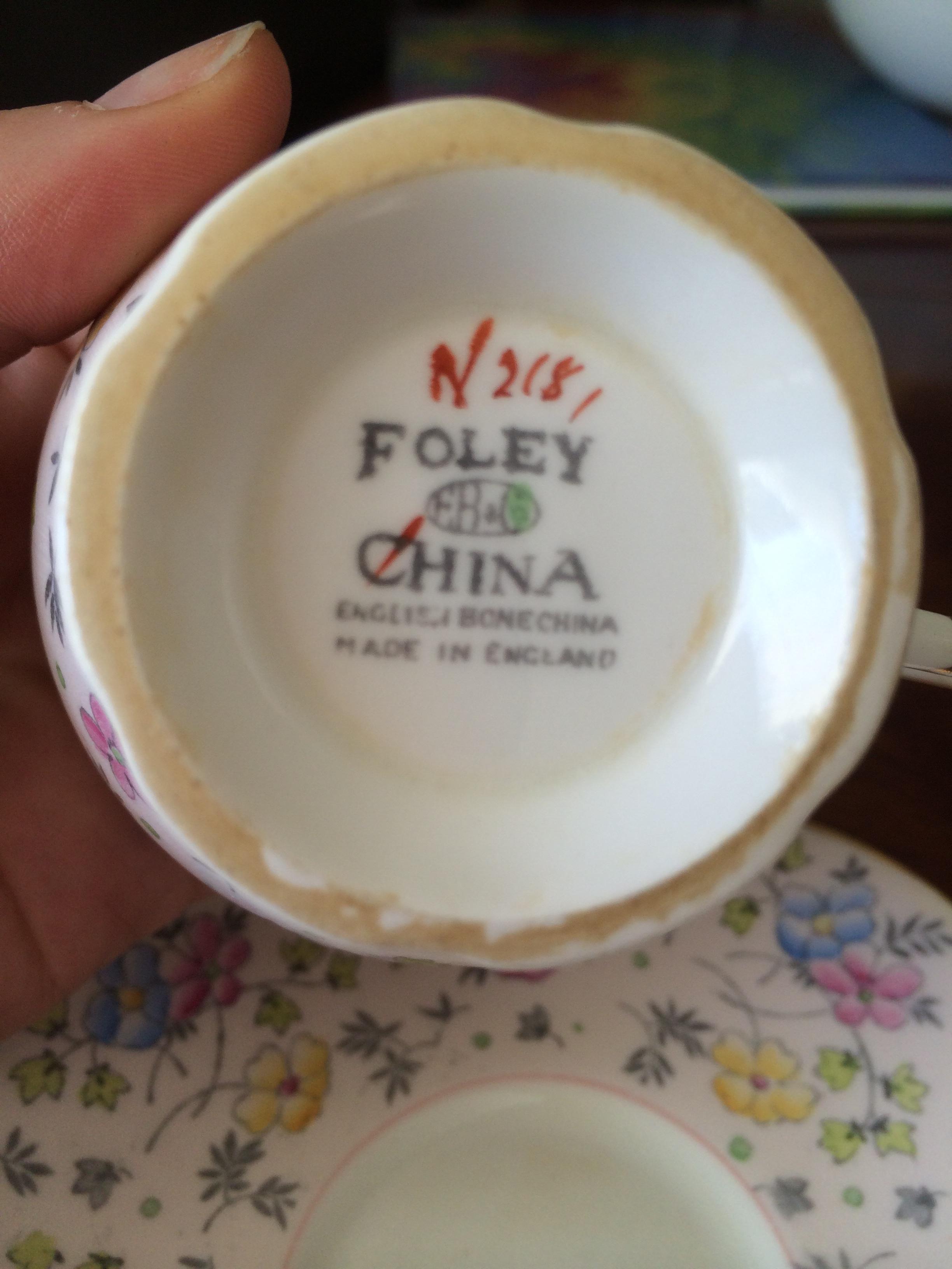 Floral set also in excellent condition. Labeled foley china. Made in England with red marking n2181 hand printed. again saucer stamping is very basic.