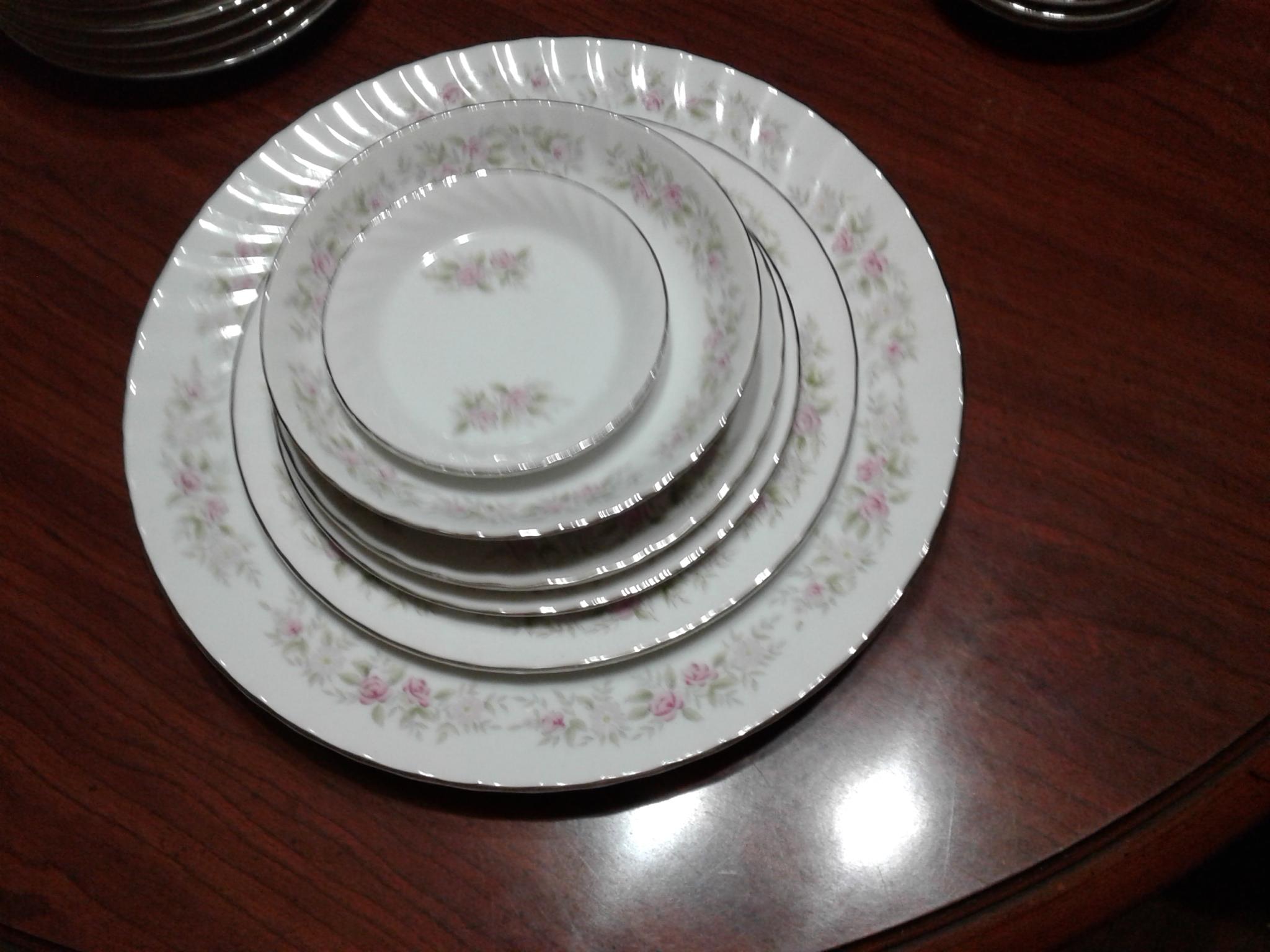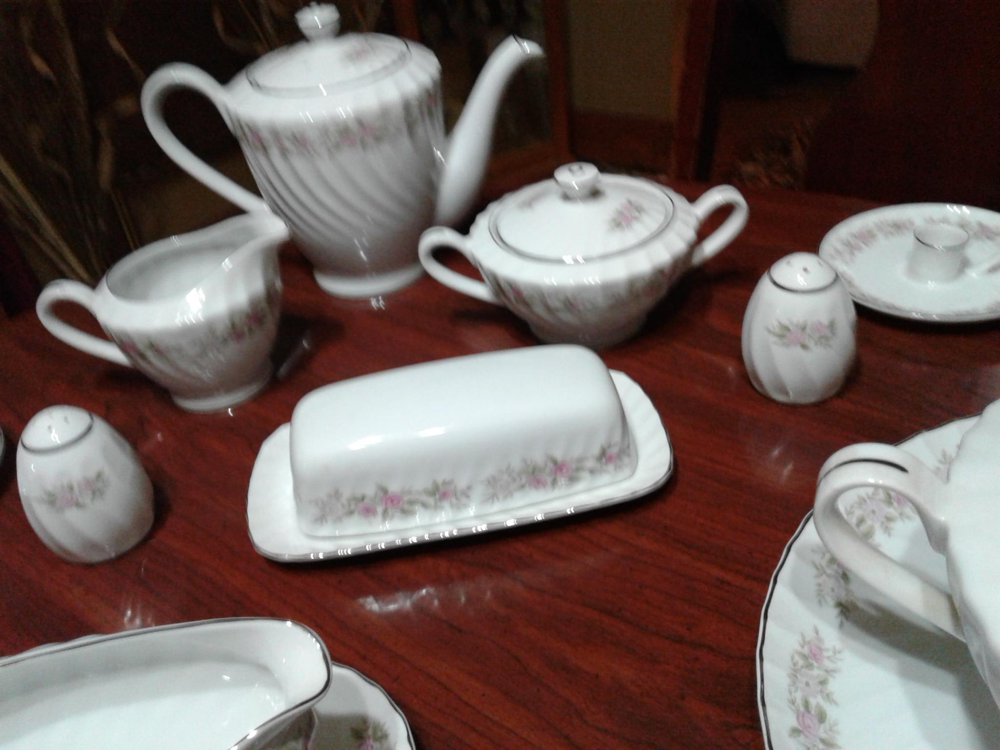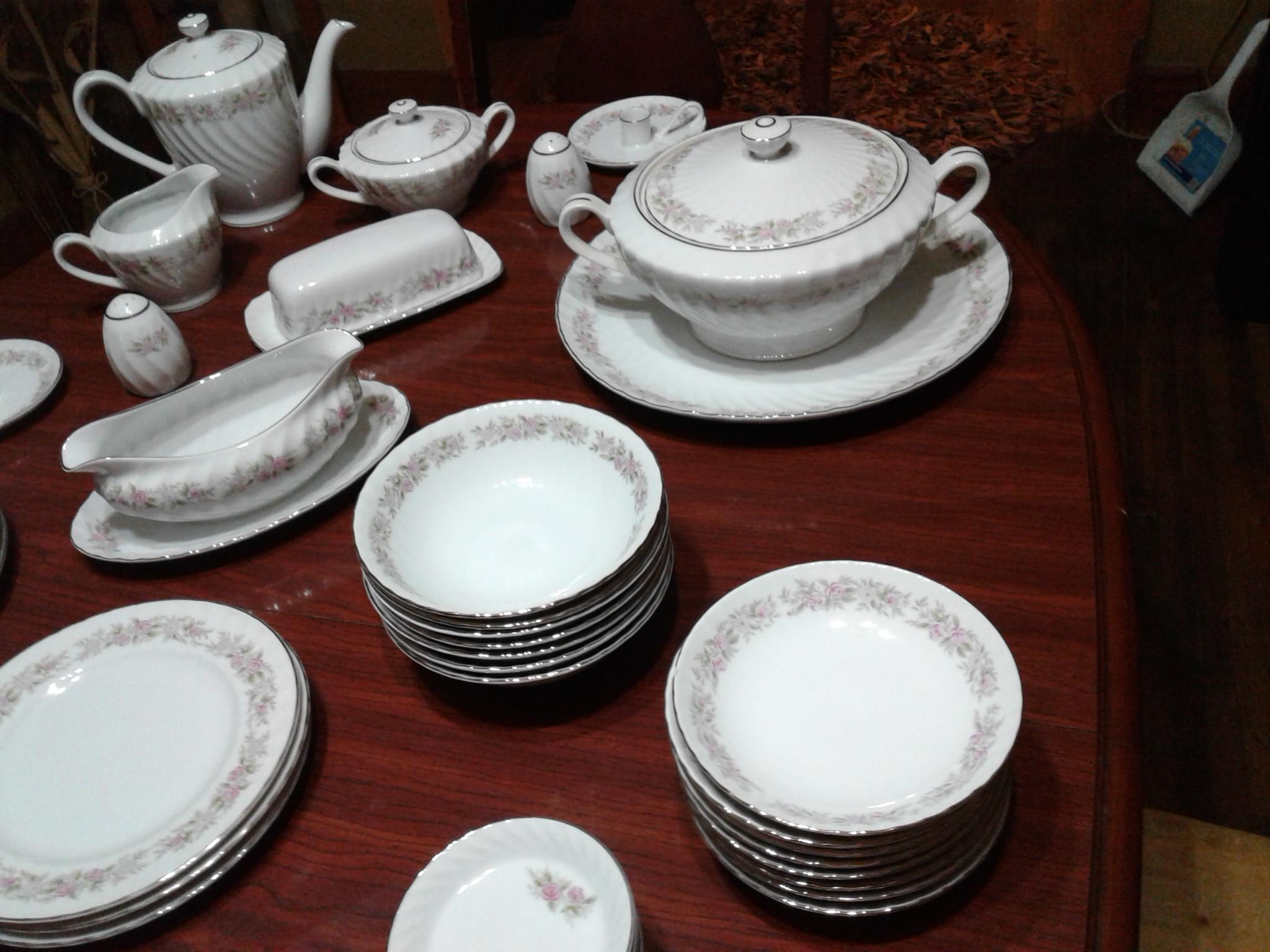I have 80 pieces of this China 1 tea pot 1 serving dish w/ lid suger bowl creamer salt and pepper shakers.butter dish w/lid gravy bowl 2 candel holders LG round platTerri 8 dinner plates 8 8 in plates 8 6 in plates 8 saucers 12 tea cups 8 small finger bowls 9 small bowls 8 bowls one of the tea cups is chipped and the LG platter is chipped.