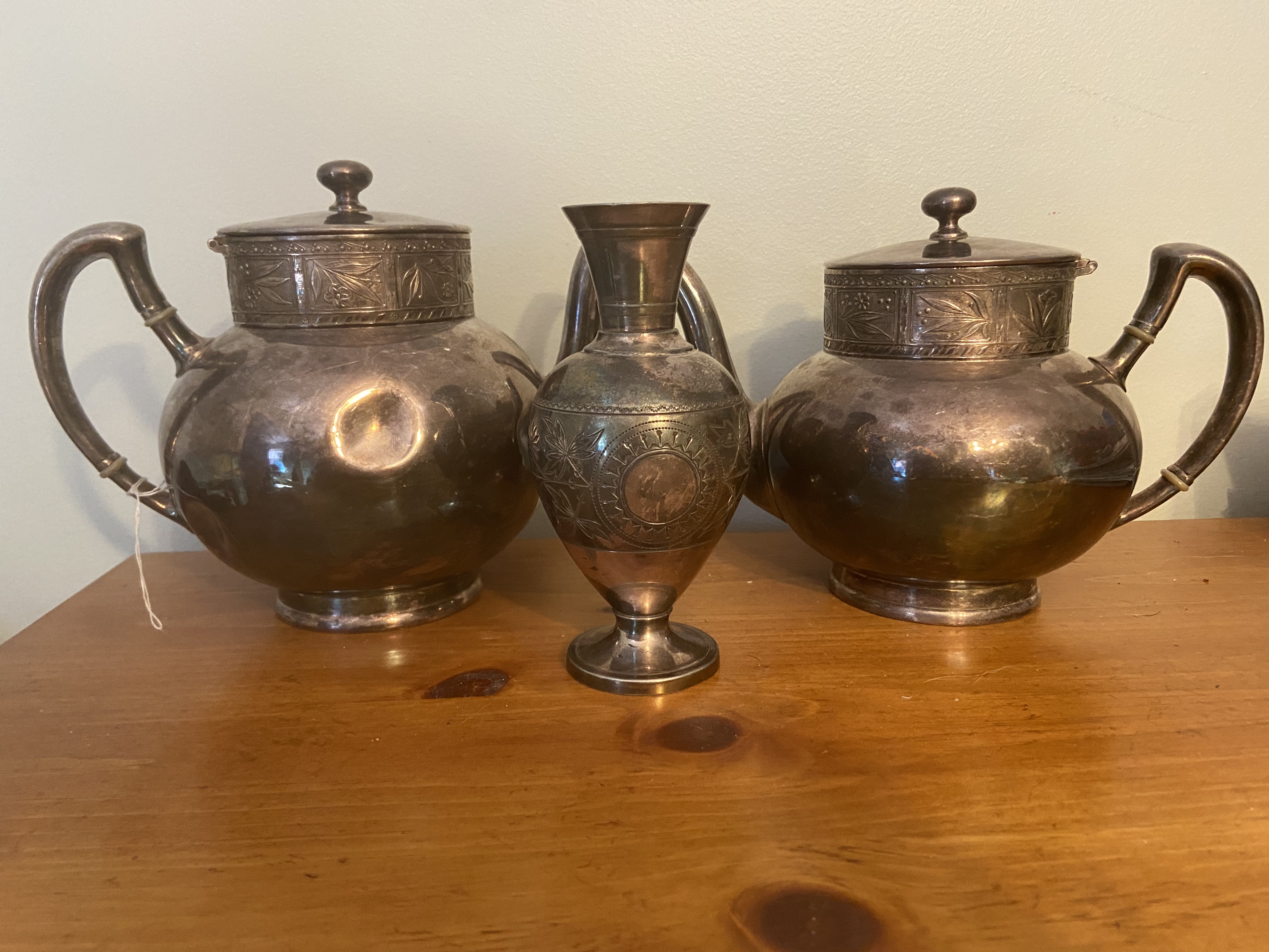 I recently purchased these two teapots and an urn as a set. The urn is marked with I think James W Tuft. The teapots are unmarked but have numbers on the bottom. I was curious about value and if they do go together or not.