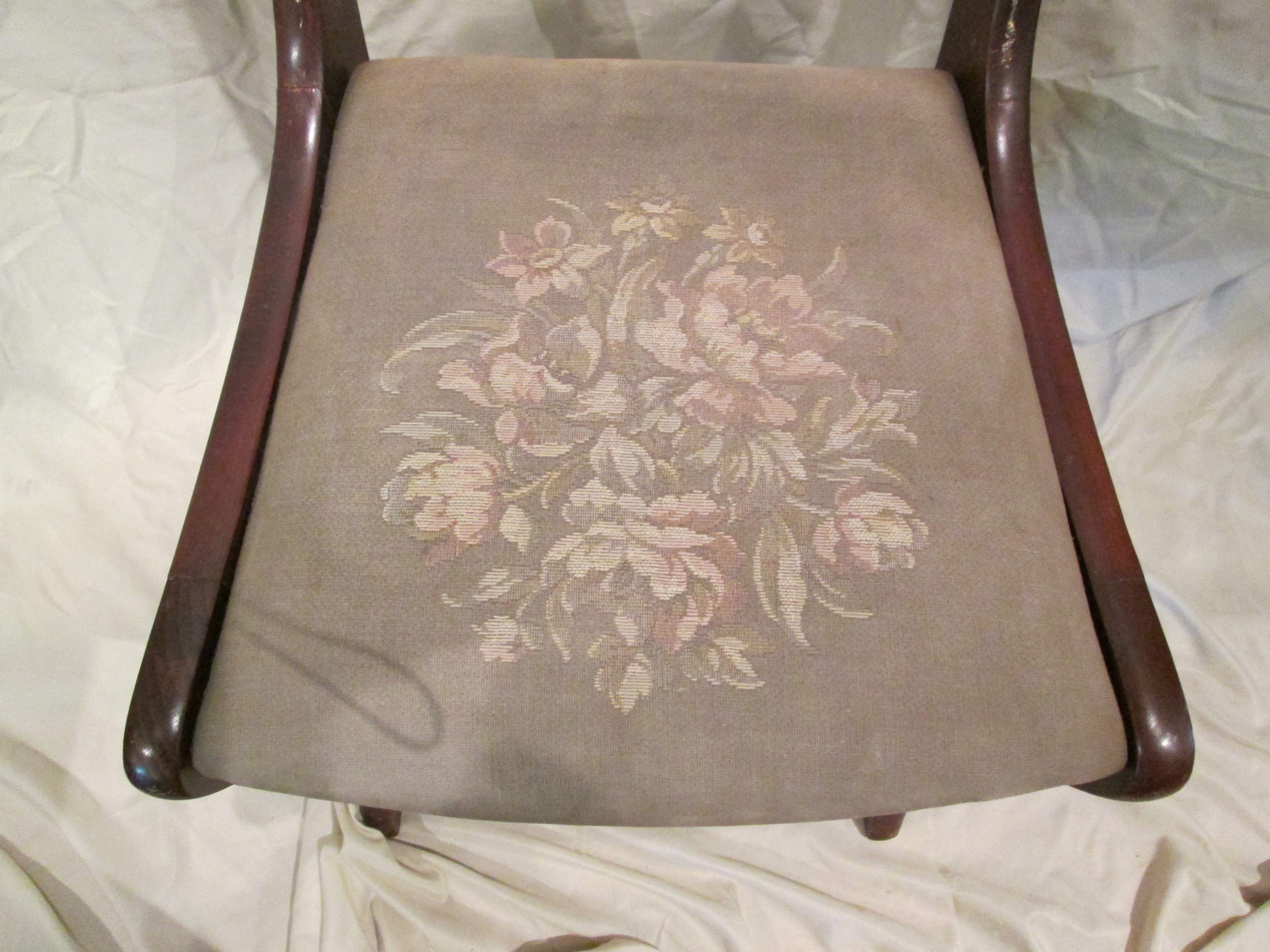 Appears to have original upholstery that is extremely faded because underneath it appears to have been either navy or dark black.