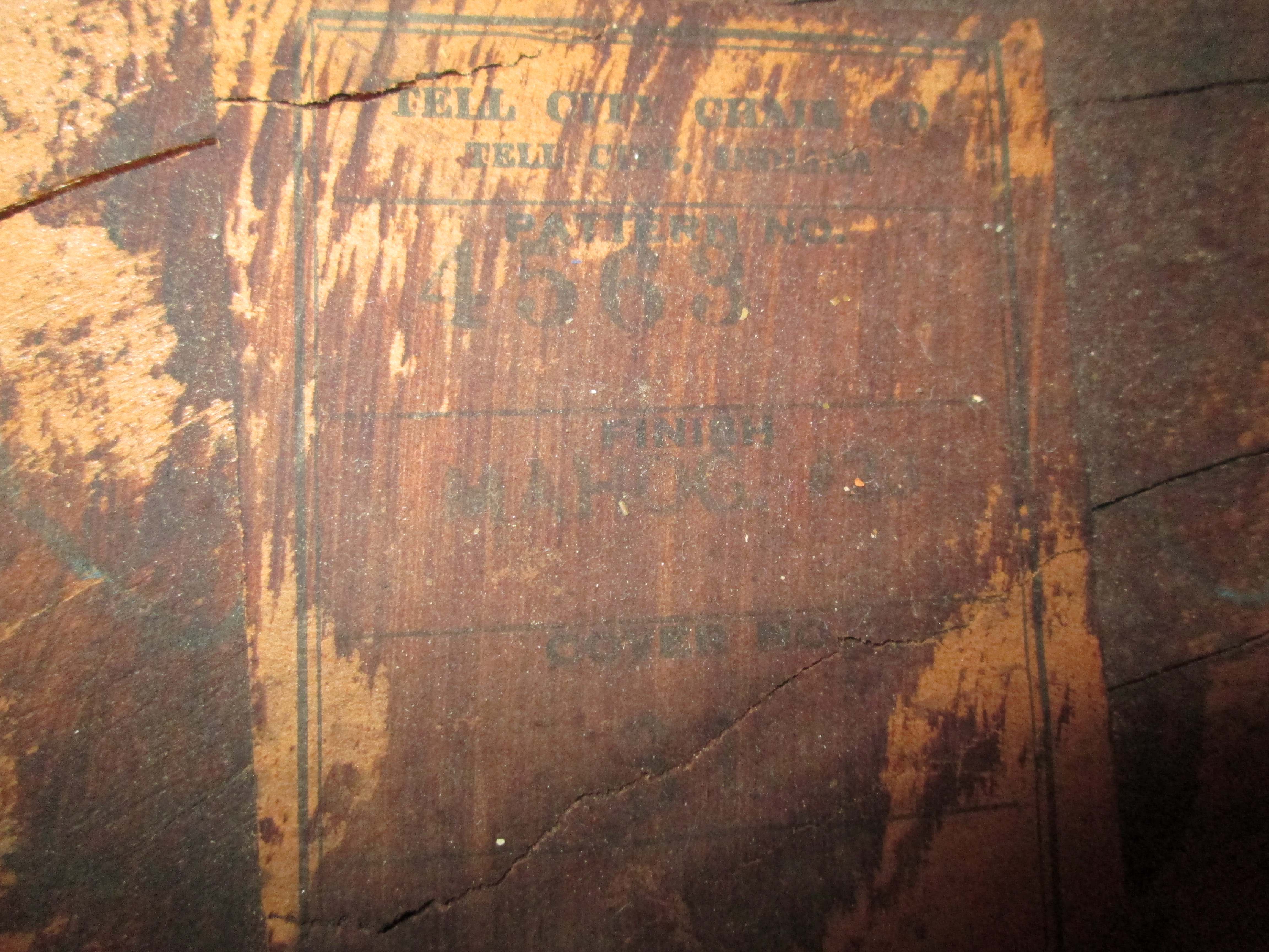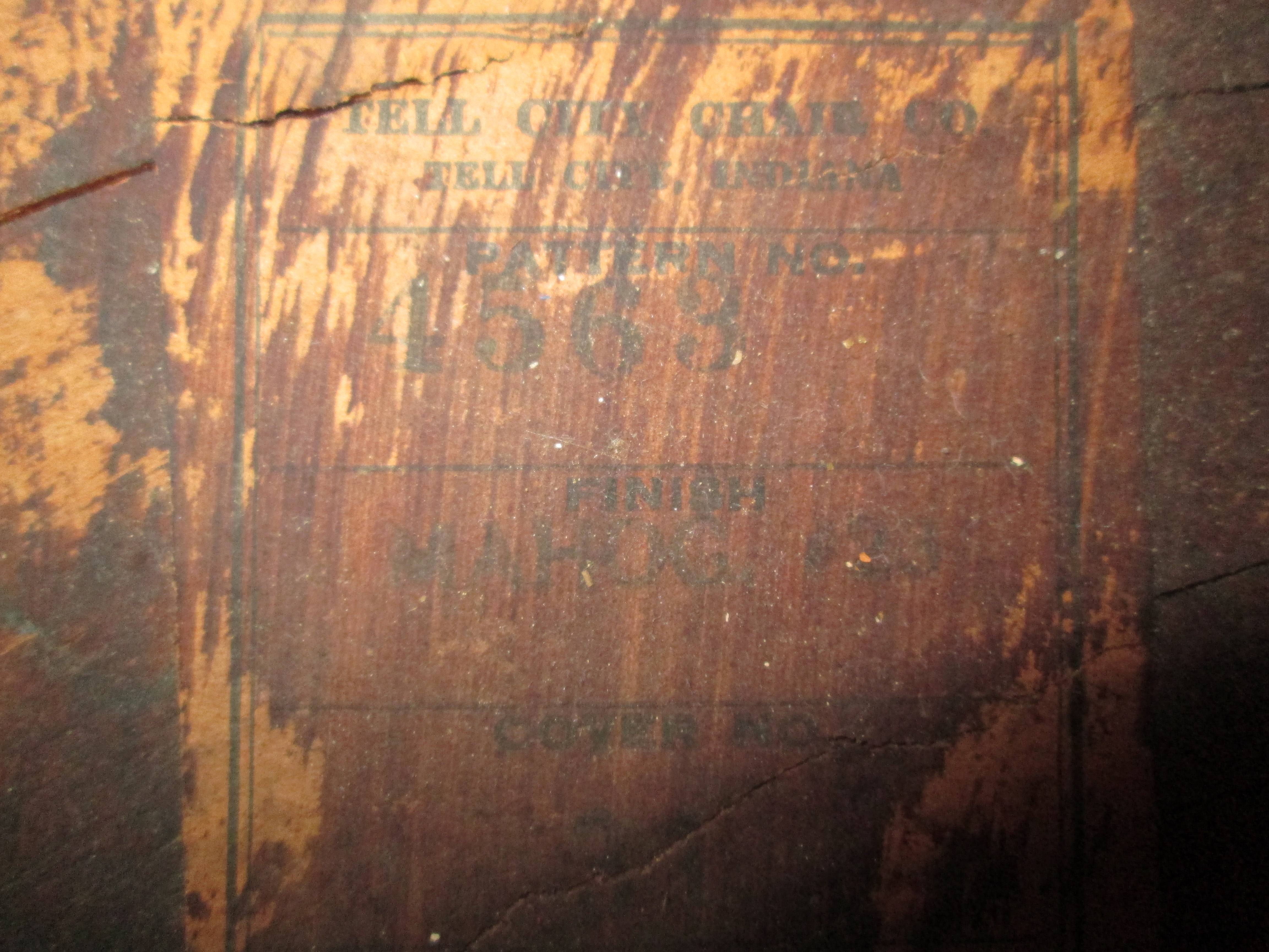 Small chair with dark wood, possibly walnut, labeled underneath with Tell City Chair Company, Tell City, Indiana. Pattern number 4563. Finish Mahogany #23. Cover # 31.
