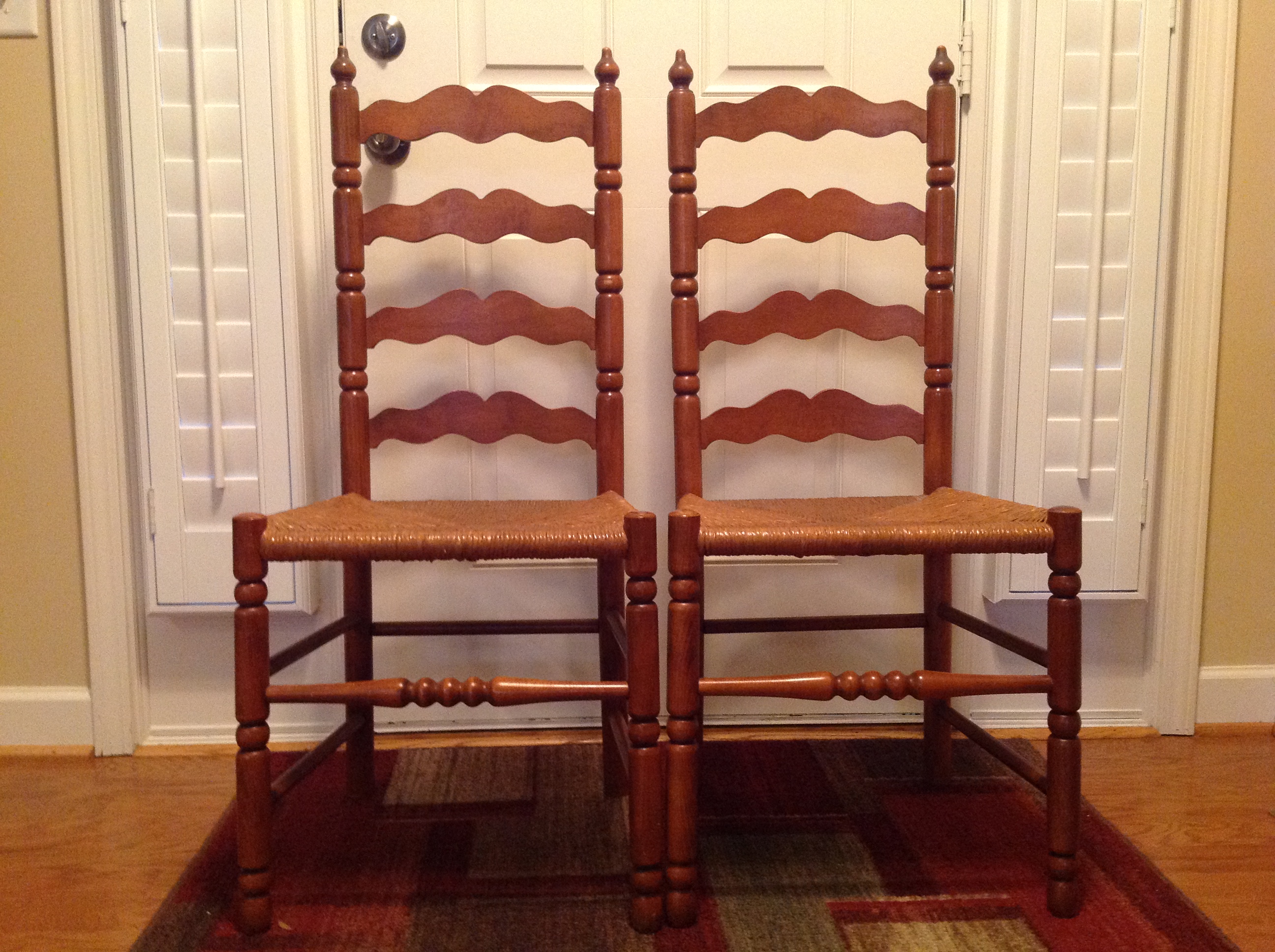 These are fairly modern reproductions of 18th Century ladderback chairs. as of September 1 2011, Tell City Chair Co. furniture is no longer being manufactured. These chairs originally retailed for $175.00 each, we sell comparables for about $75.00- $100.00 in very good condition, but they often go at auction for far less.