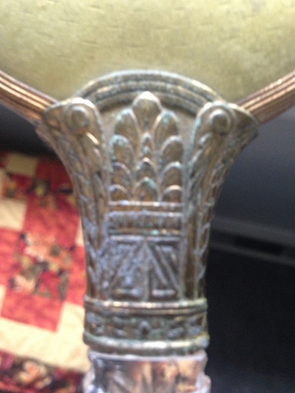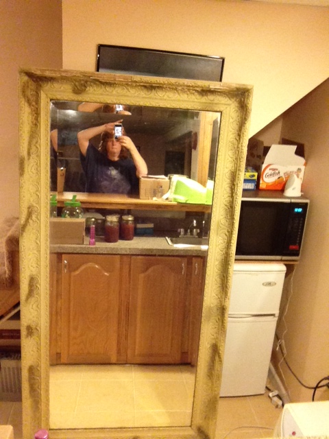 I found this mirror at a local garage sale. It is slightly less than 12" long. The handle seems to be made of glass (possibly Lucite?). The mirror is beveled and framed with a gold-plated metal, and there is a small flower embellishment on the back of the mirror. It definitely looks old, but what is its approximate age and/or value?