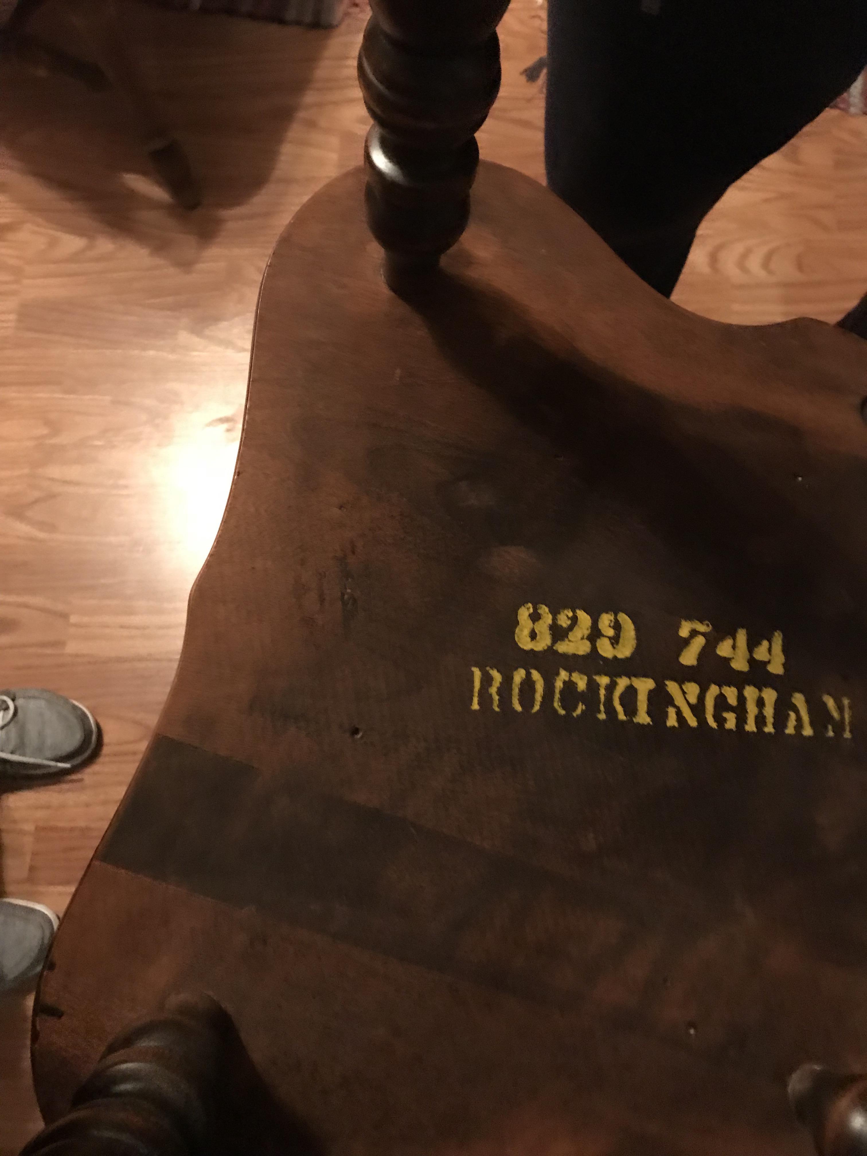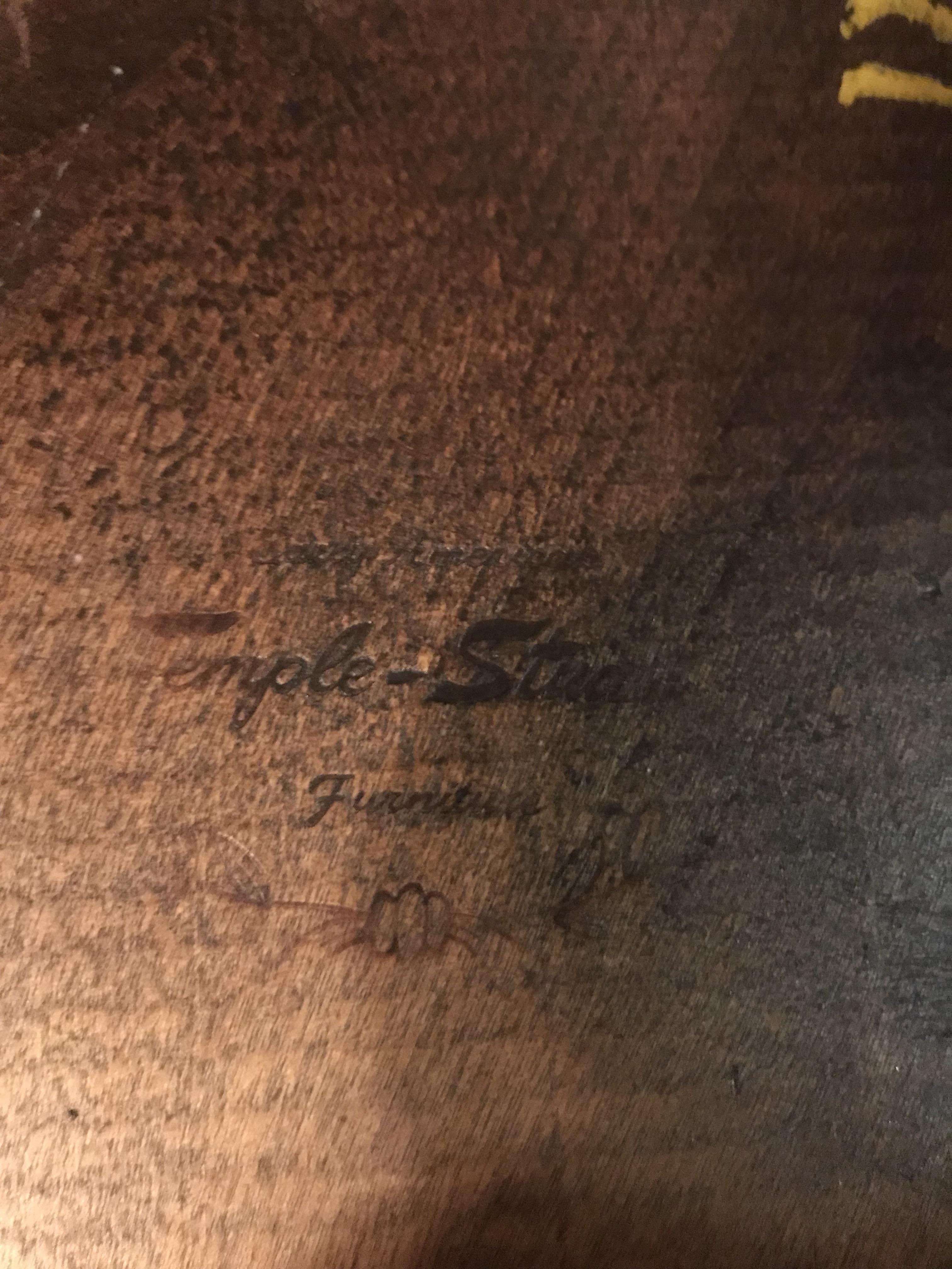 Set of 6 Wooden Temple Stuart Furniture antique chairs. Bottom of chairs has a stamp with 6 numbers and word Rockingham under the set of numbers. 4 Side Chairs and 2 End Chairs which have arm rests. Temple Stuart Furniture Logo is branded into wood on bottom of chair.