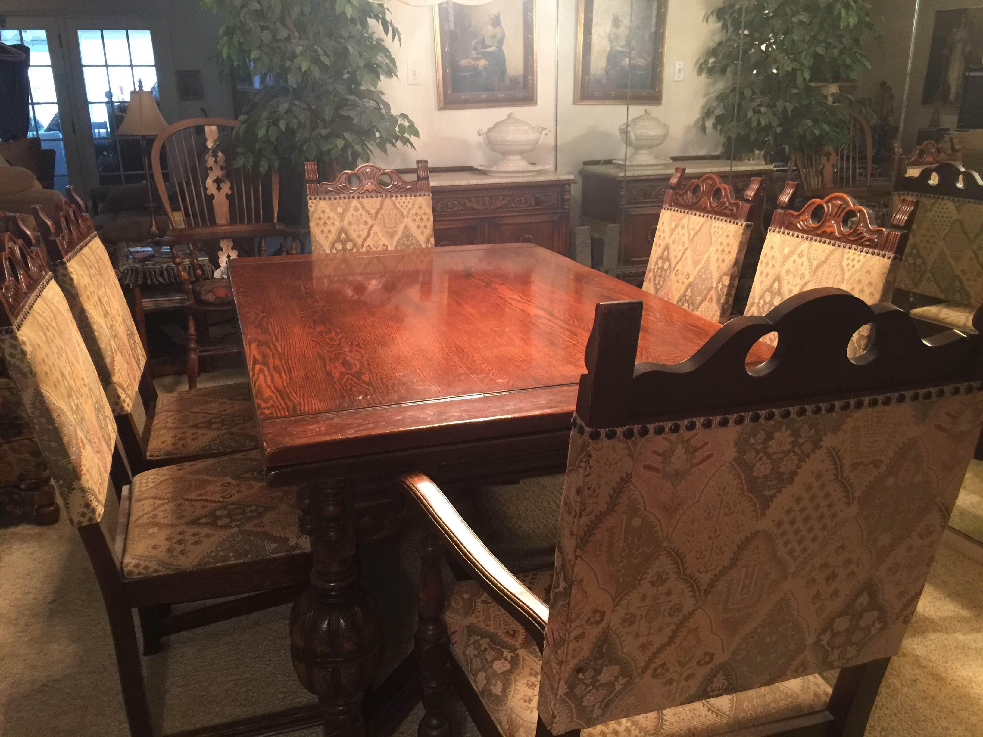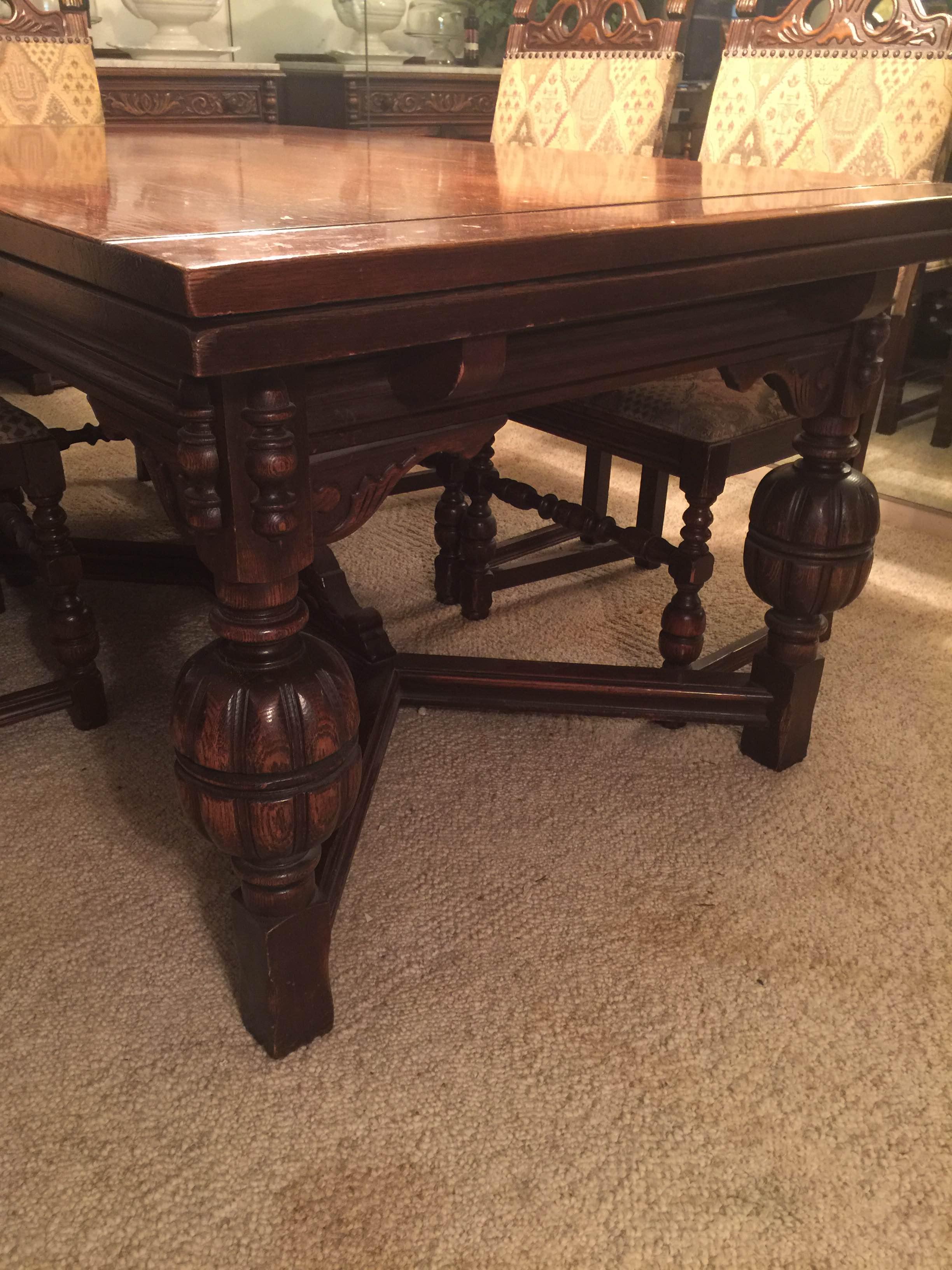 Ten pieces, white oak, circa 1889 per the Bernhardt site. (Bernhardt Furniture, Lenoir, North Carolina) Table, two end leaves that slide from under the table, do not remove, 18" deep each; 6 chairs (five dining chairs, one captains chair), Server, Wine closet, buffet with carved bear at the corner that is a carved part of the buffet top. It was never separate and attached. Excellent condition.