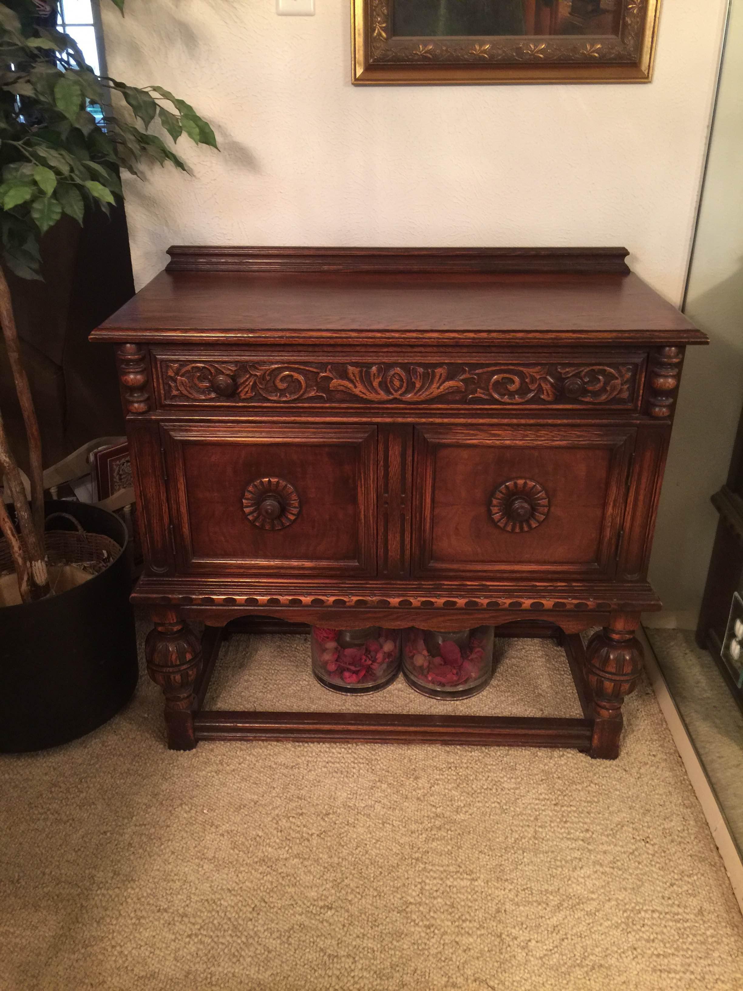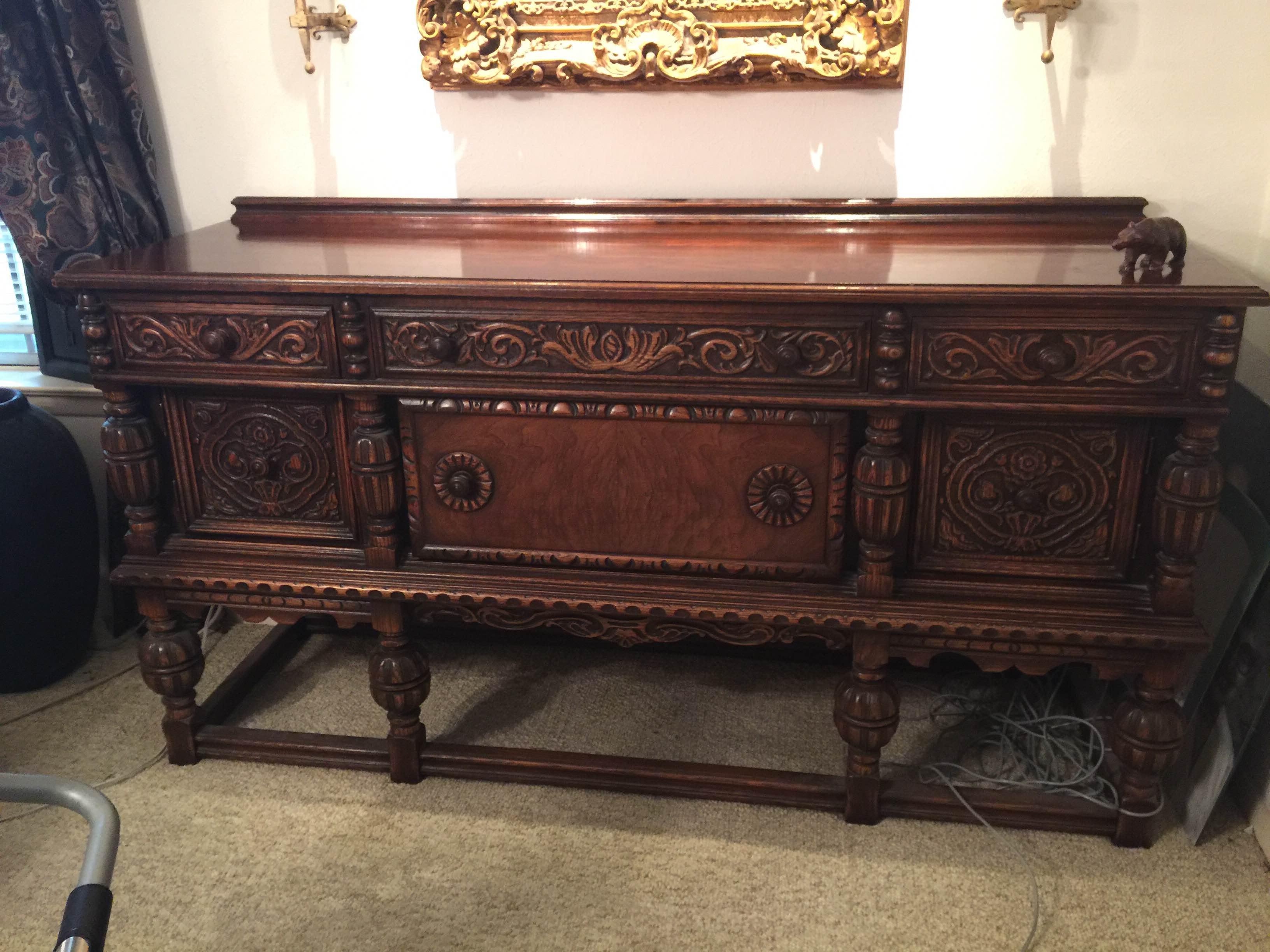 Distinguishing marks Hand carved bear on the right corner of the buffet, same wood as buffet, not separate then attached.