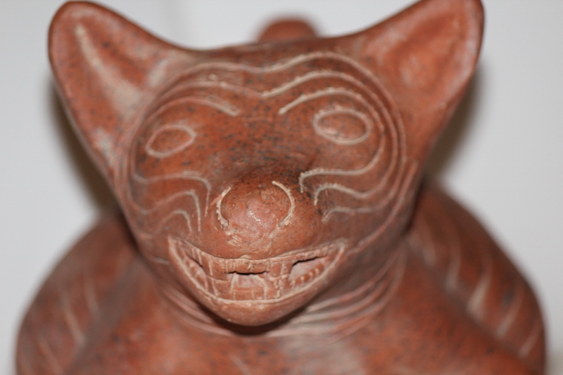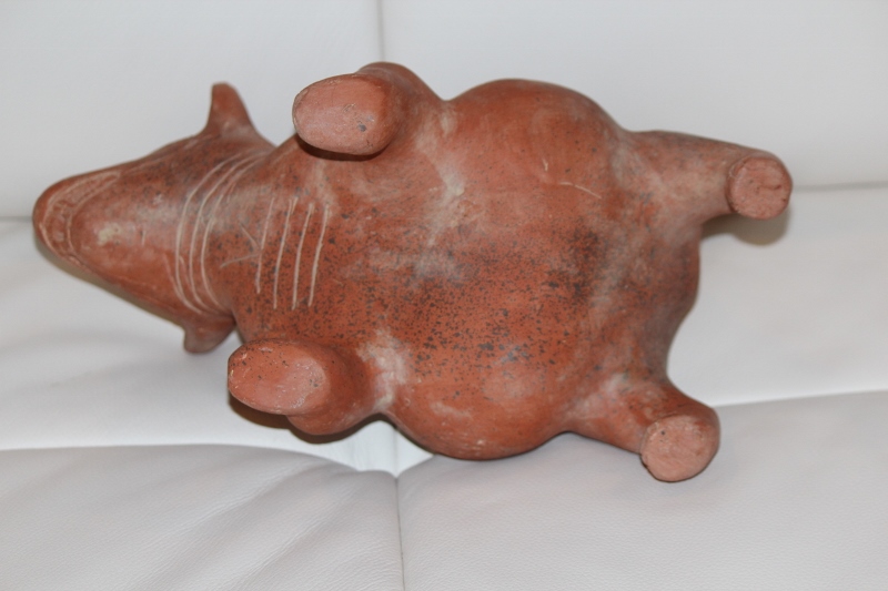 This little dog is 13"tall, 7 inches wide and 8" long.  He weighs about 2-3 pounds. As you can see, he has dark scattered spots and some lighter areas.  He appears to be hollow and has spaces between his teeth, but his mouth is not completely opened. He has no chips or cracks.  There are details scratched into the clay. Update: I found very faint words scratched into his side: repro, Mexico, and something I cannot read.