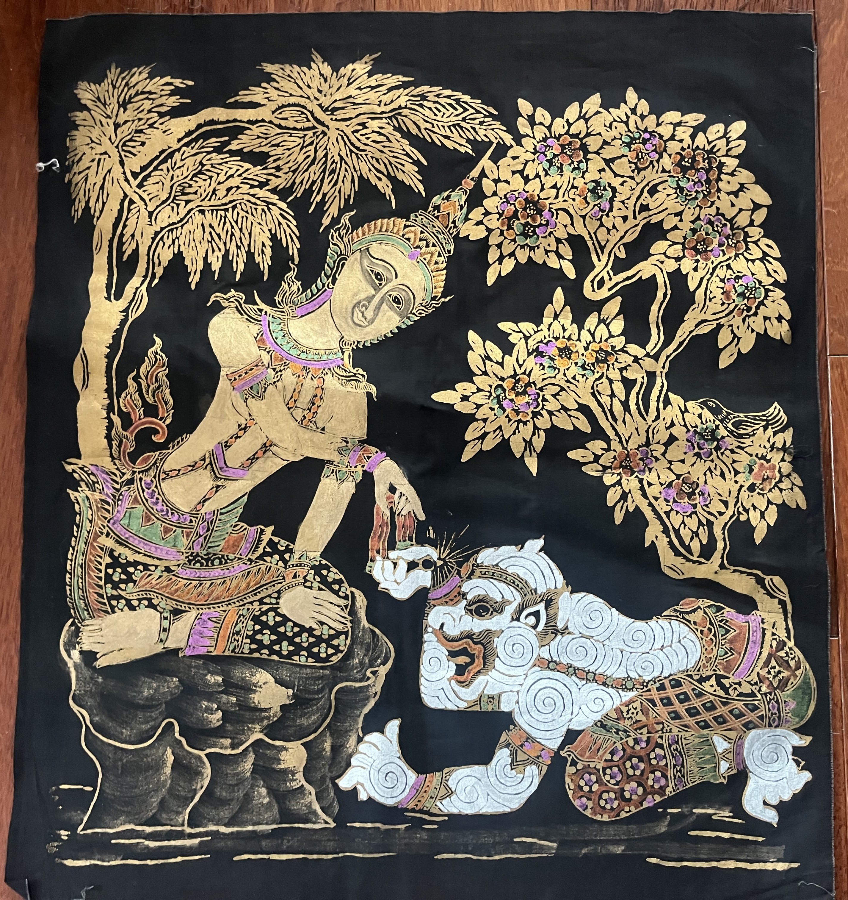 Thai Mid 19th Century Hand-Painted Art on Silk. Made by Anonymous Thai Artisan. Dating to c. 1850-1870. Materials: Silk, natural dyes, gold leaf. Estimated value: $300 – $500. Condition: Very Good. The market for traditional Thai art is currently stable, with a moderate interest among collectors. Prices for similar pieces have shown a slight increase in recent years.