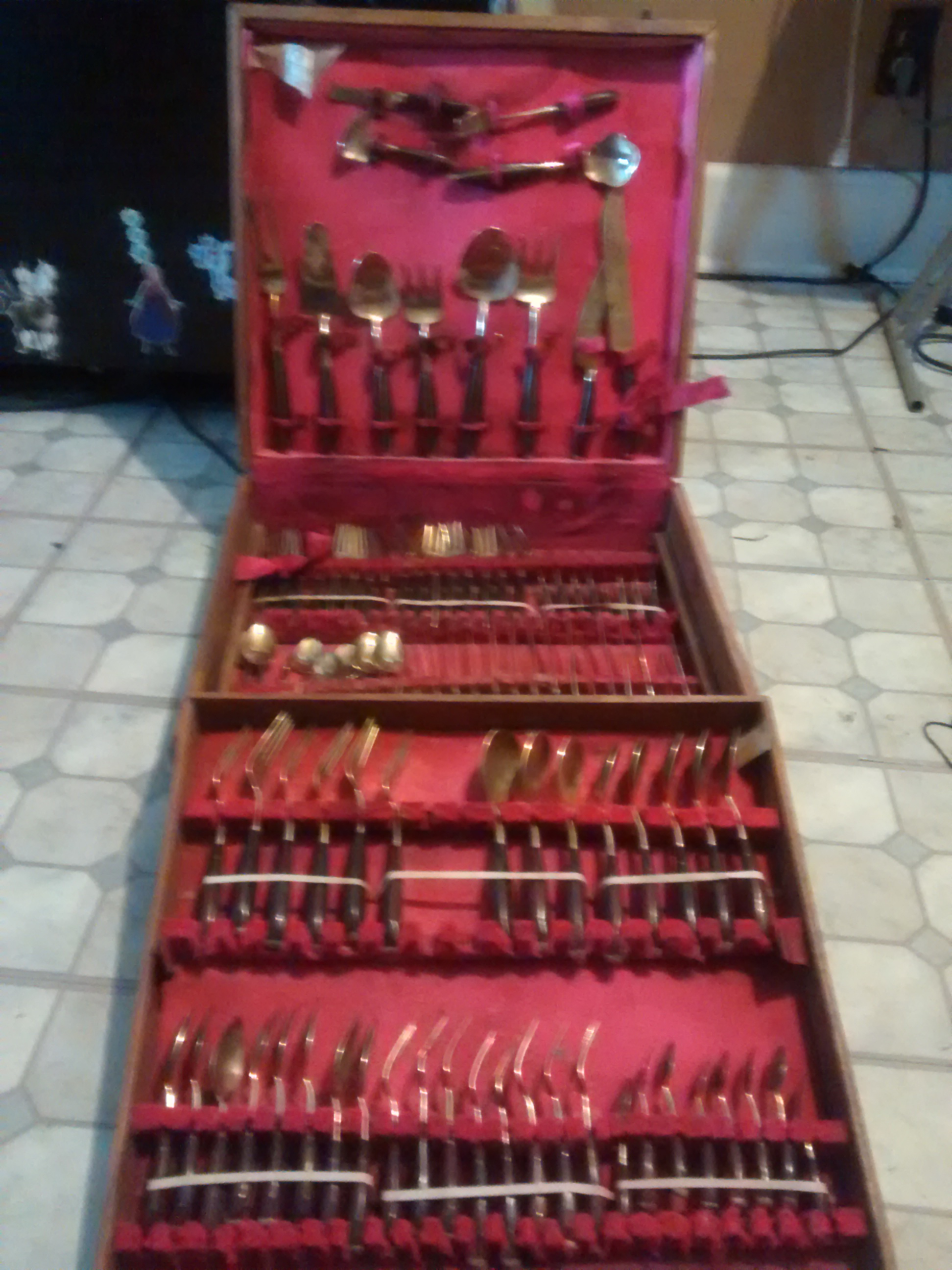 Description this is a 8 person bronze rose wood flatware set. it is missing one fork, it has one broken fork.other than that the set is in top shape