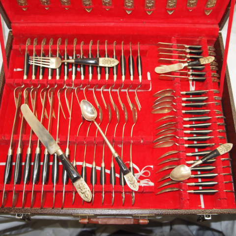 gold looking with maybe bone on handle in a lockable case.