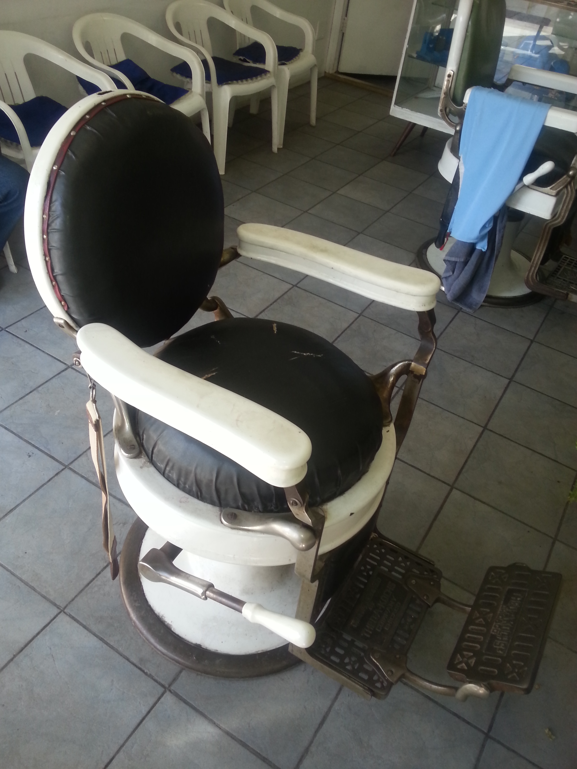 Theo A Kochs Barber chair. in good condition. Leather on seat and backrest has been replaced. Original manufacture label on back of seat.