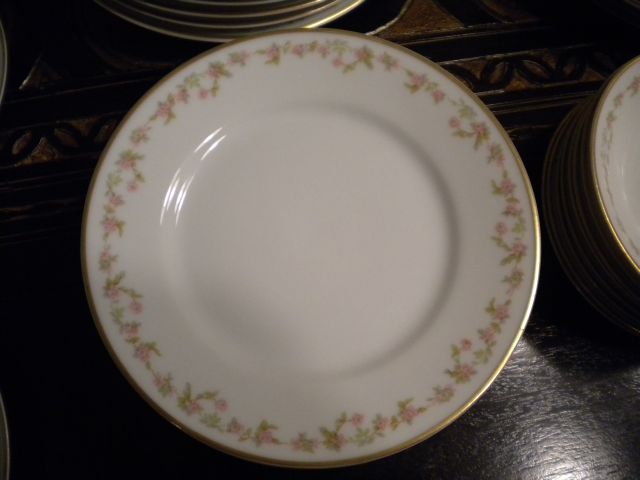Pattern is pink flowers around the edges, and pieces are rimmed in gold plating. Cup handles and casserole lid handles are painted gold.