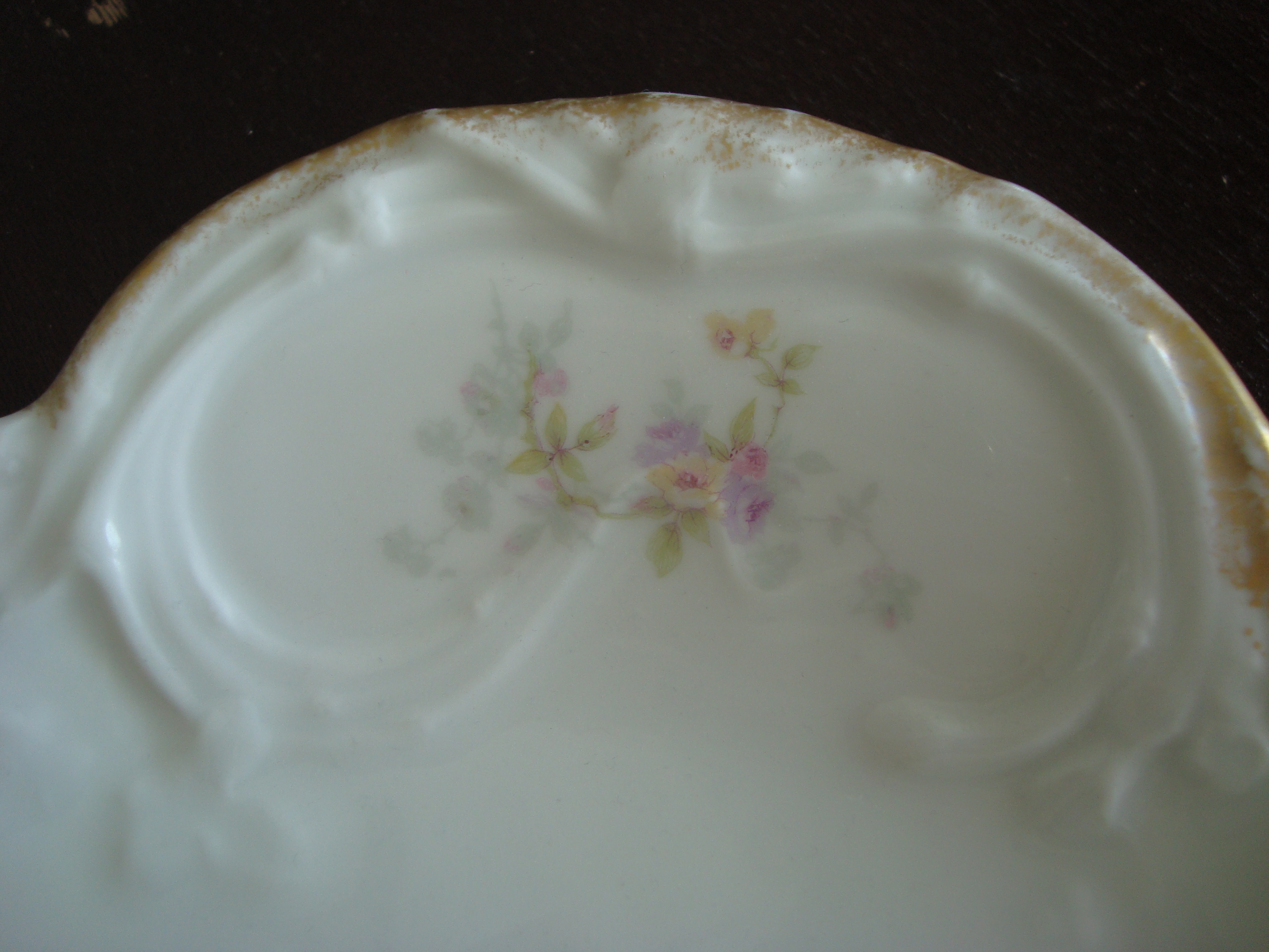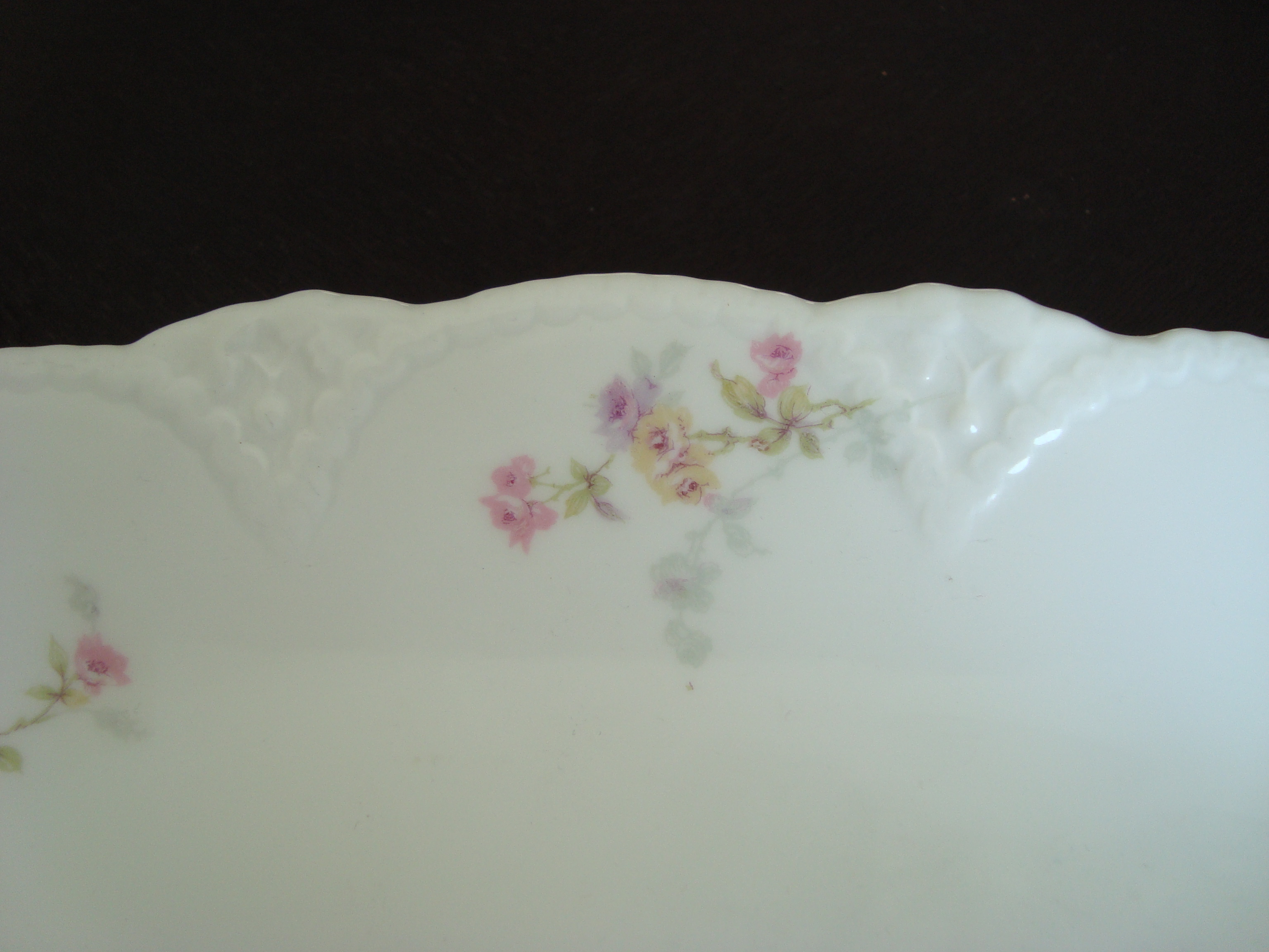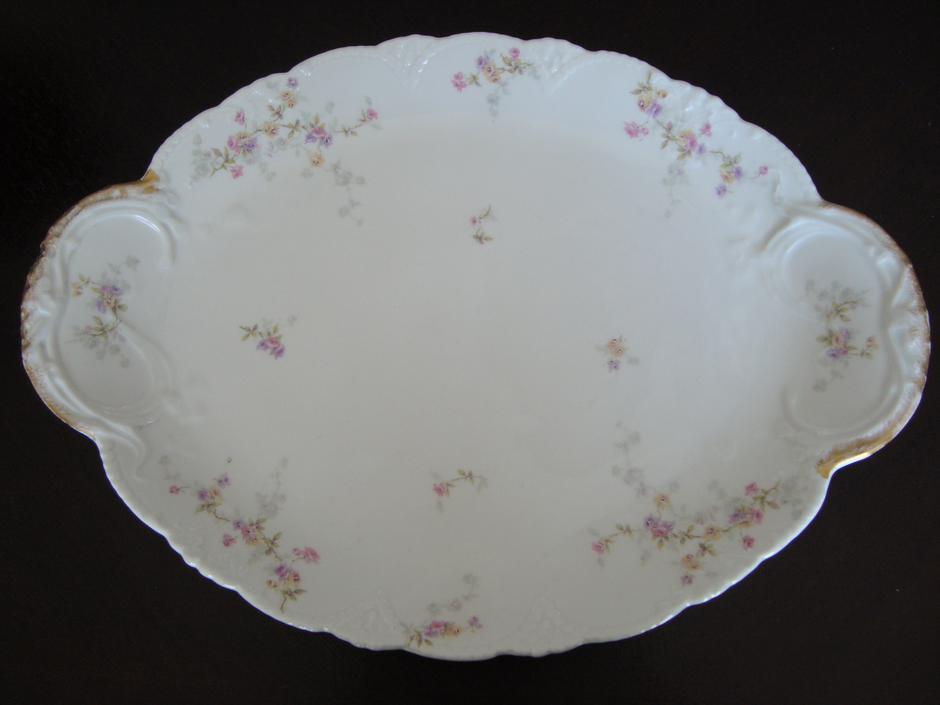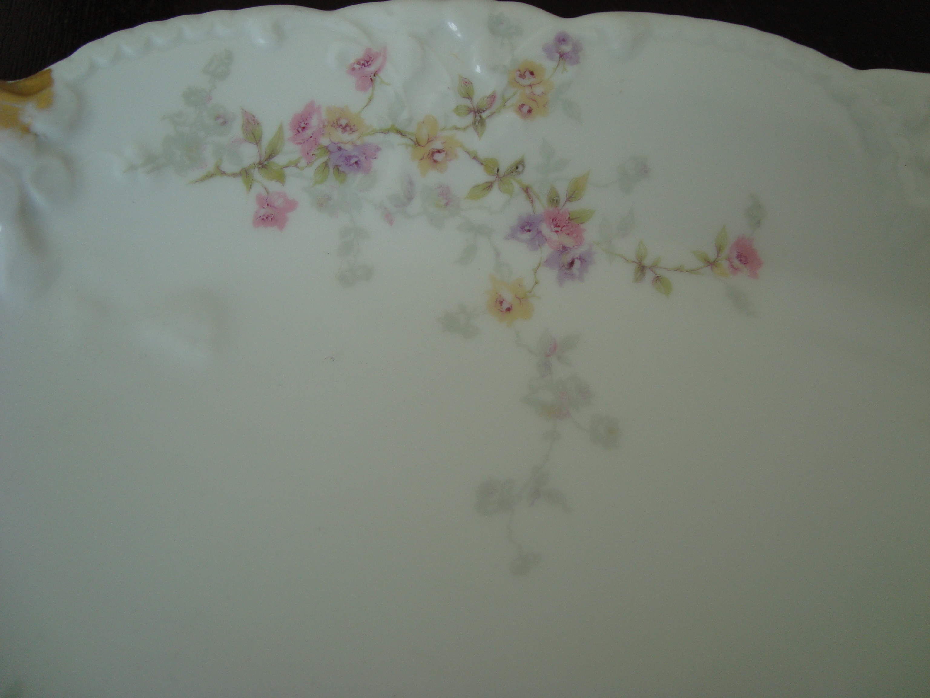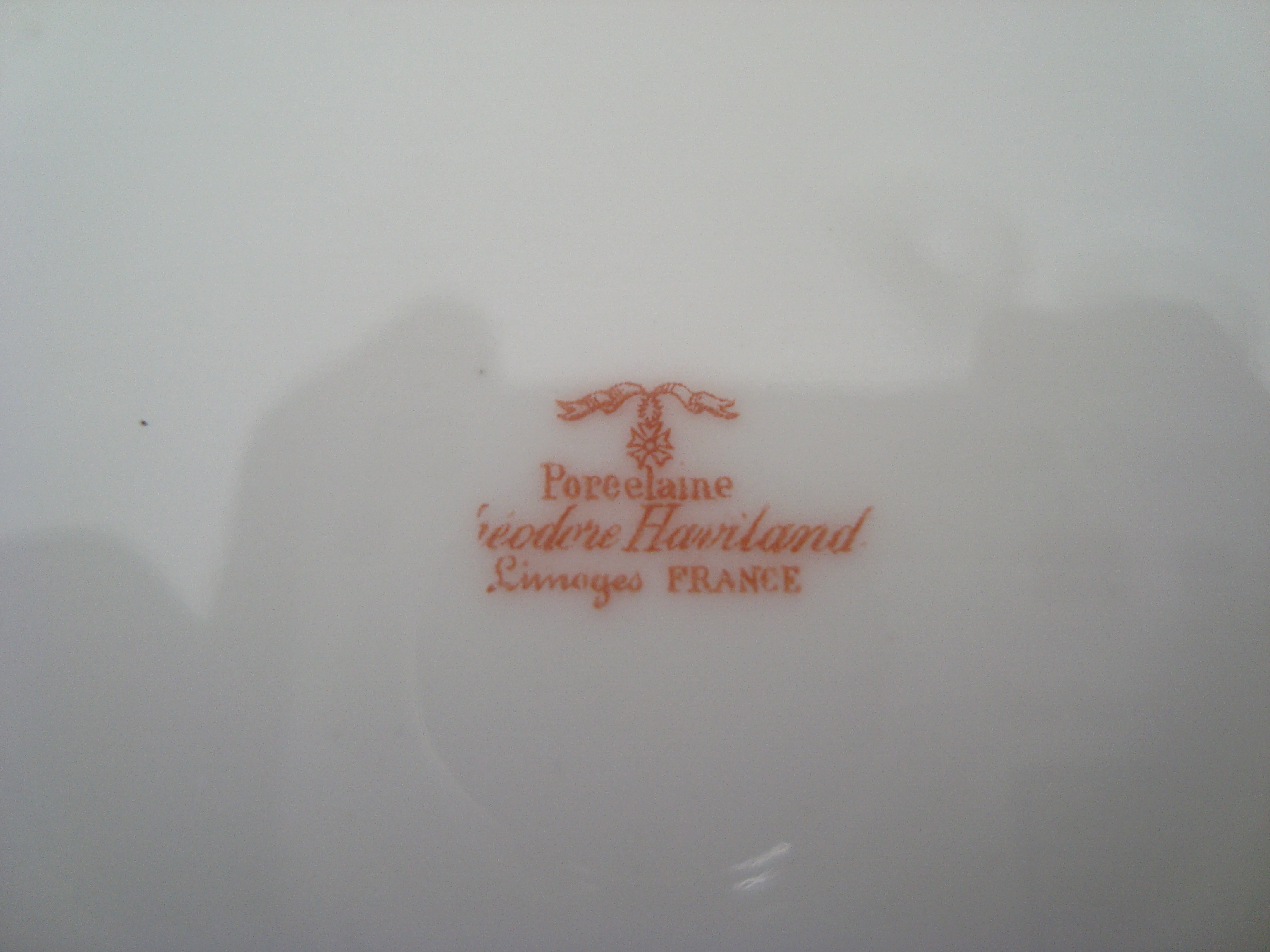 I'm afraid I don't know too much. I have researched this for hours. The casting indictates it was made between 1894-1957. The decorators mark isn't like anything that I have found. The closest mark reads Theo Haviland in red, and dates back to 1895. However, the mark on this platter is his full name in red. The painting is tough to narrow down as they are 30K potential patterns.