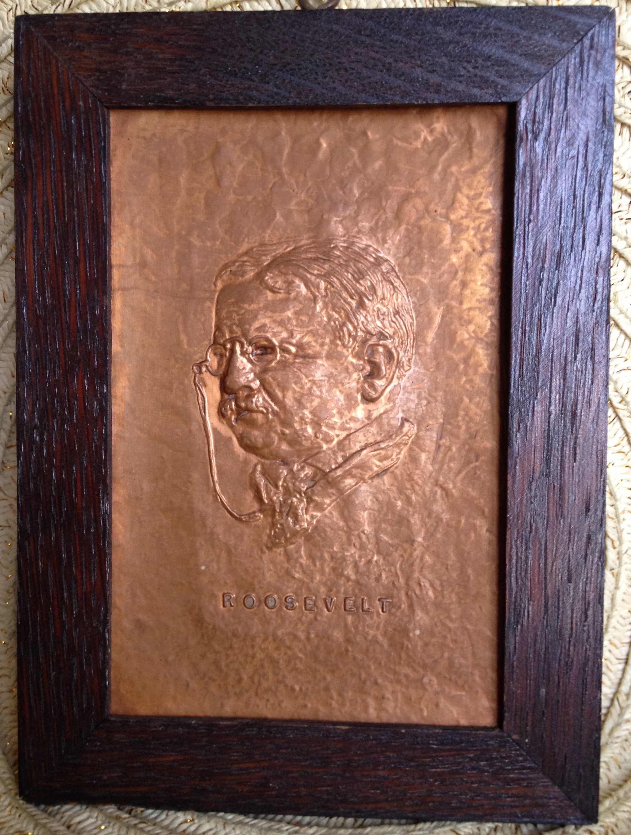 Hand Hammered copper over wood plaque of Teddy Roosevelt in wood frame. Measures 6 1/2" H x