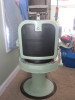 The chair is upholstered in red leather, has a mint green trim, with foot plate, head rest, and child booster seat. The hydraulics is in full working order.