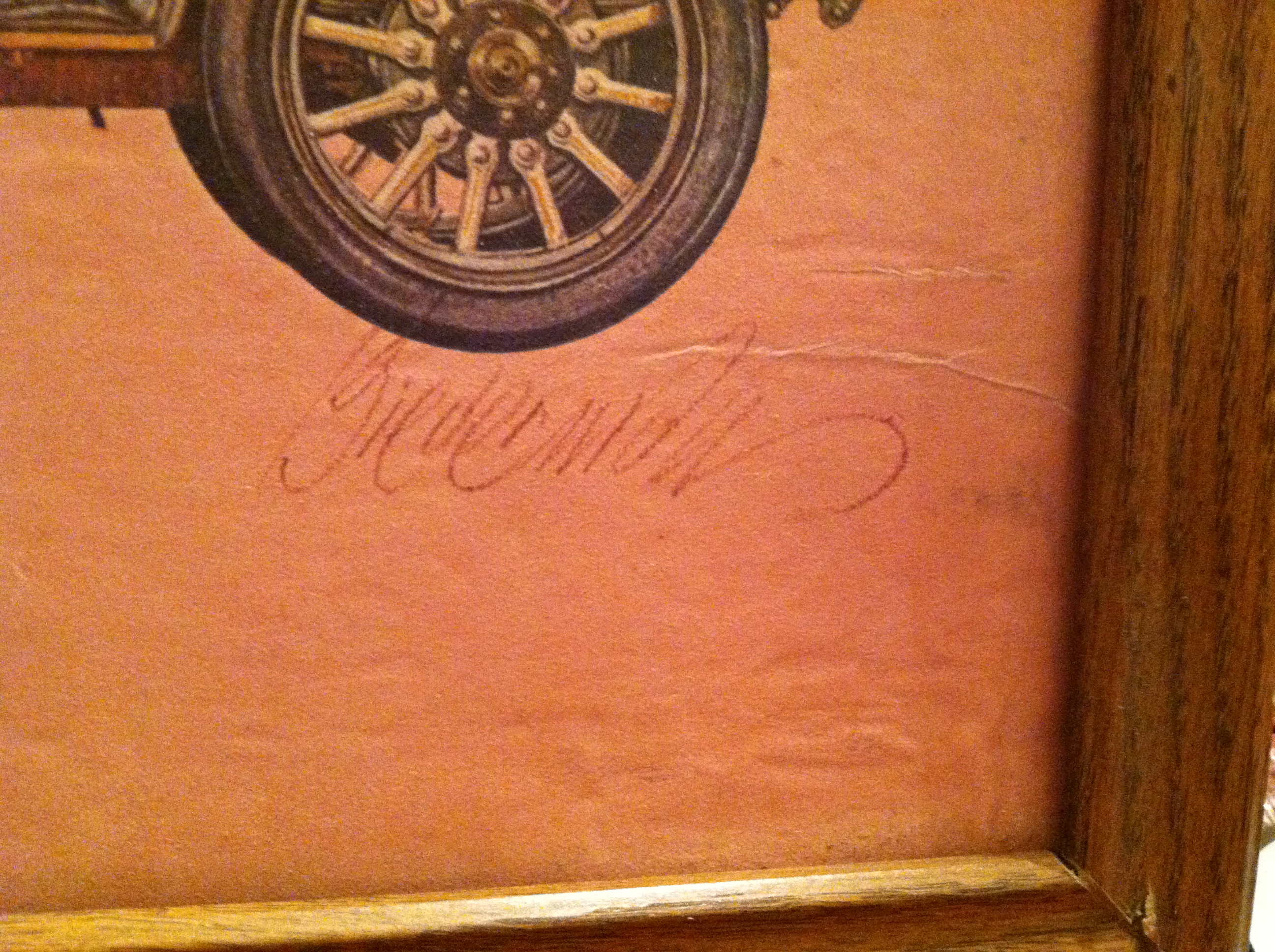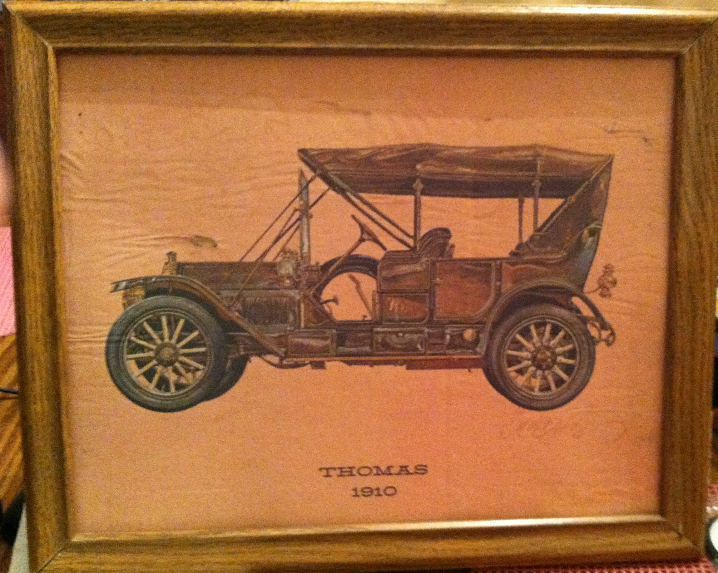 I believe i got this from my Great Grandpa's house who had passed years ago. My name is Thomas, so i thought it was a great idea to have a print/photo of an old car with my name. I really dont know anything about this, nor could i find anything online/ebay that was simlar. I noticed a signature in the lower right corner. I couldnt really figure out who it was though. Any help would be great! Please email if possible