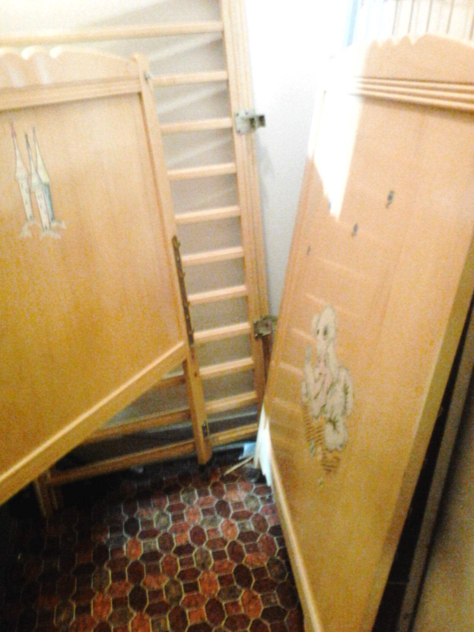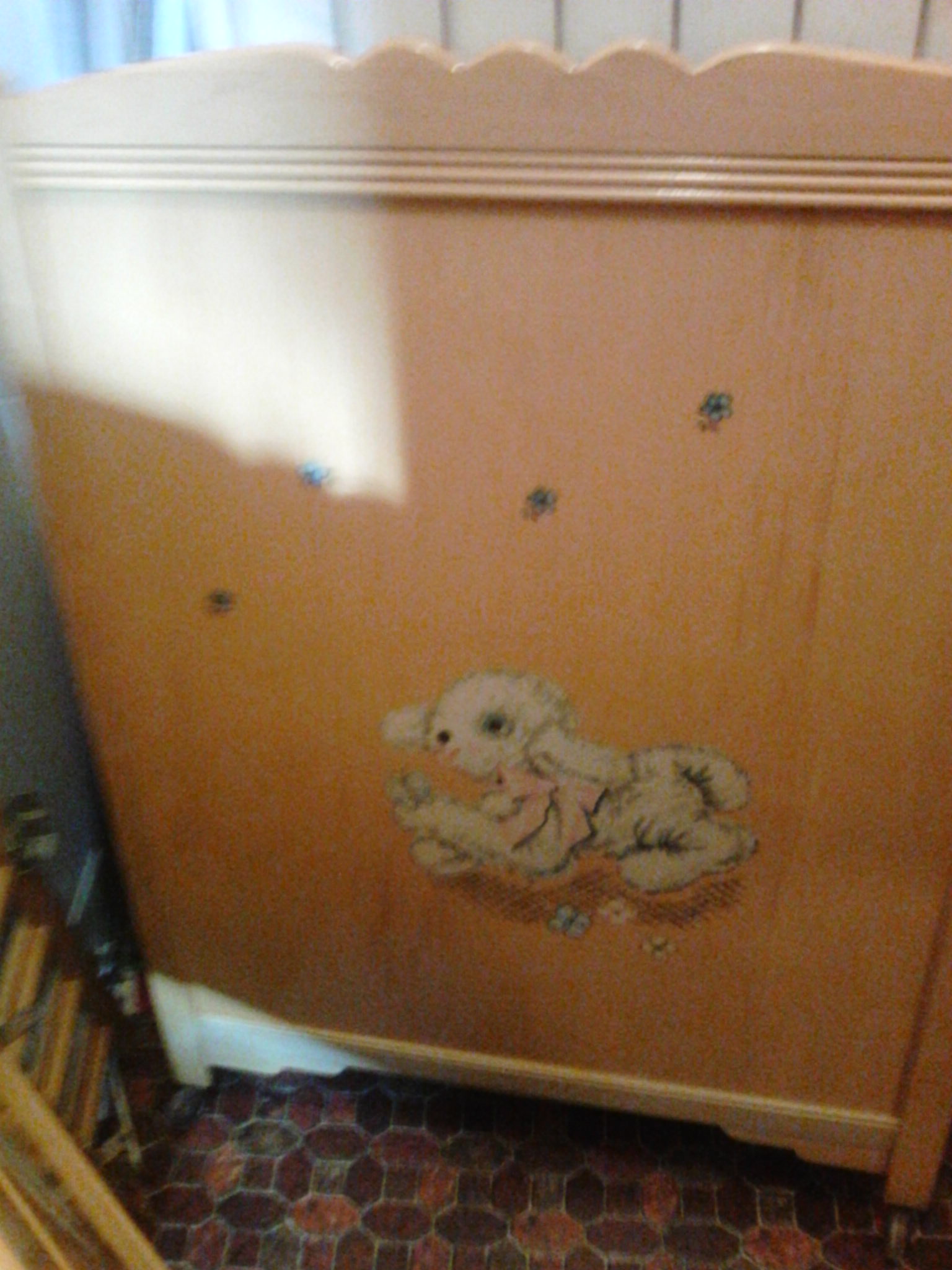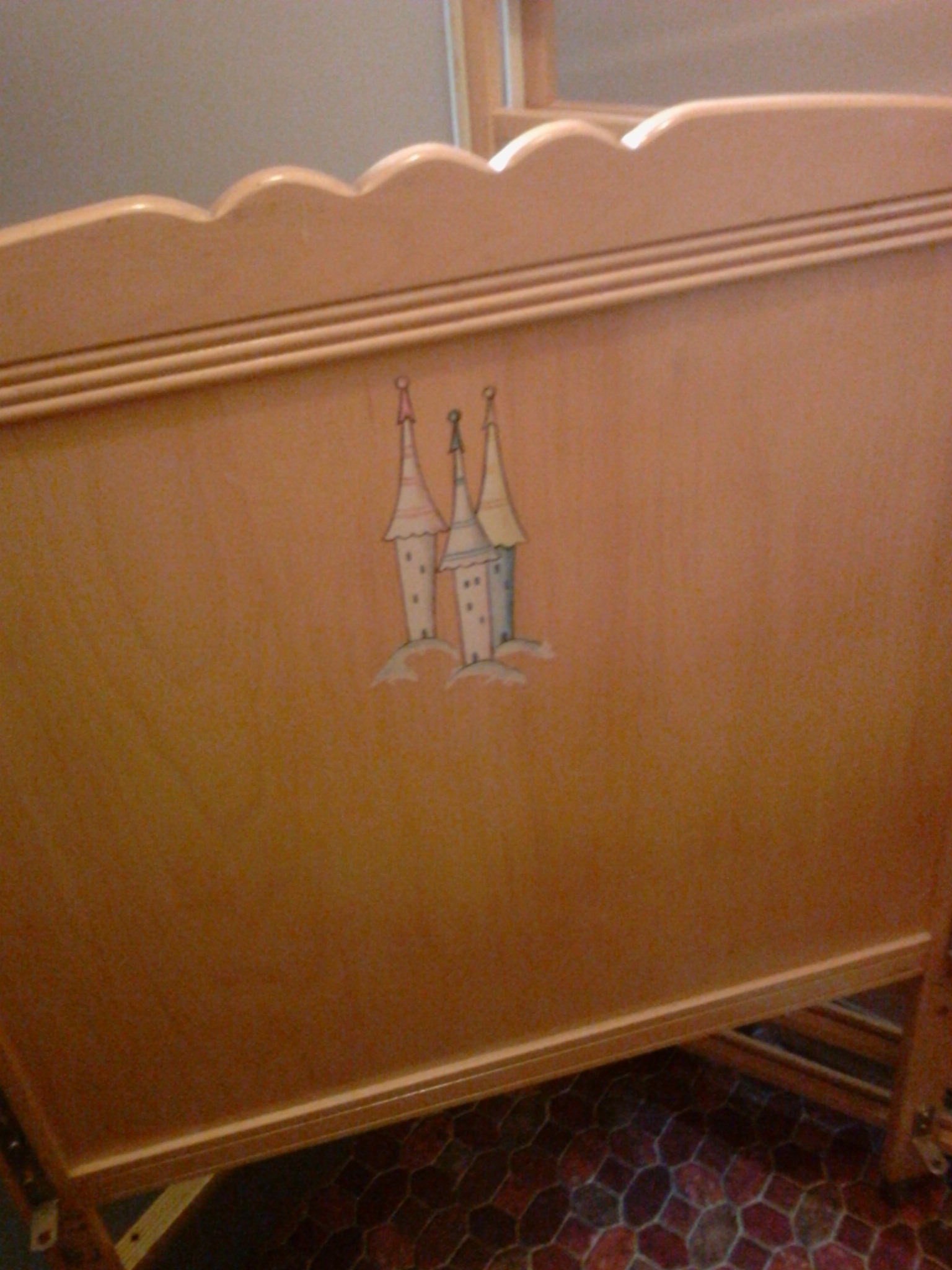 Light wood colored crib I believe to be around 1900s little sheep and castle fairly good condition.