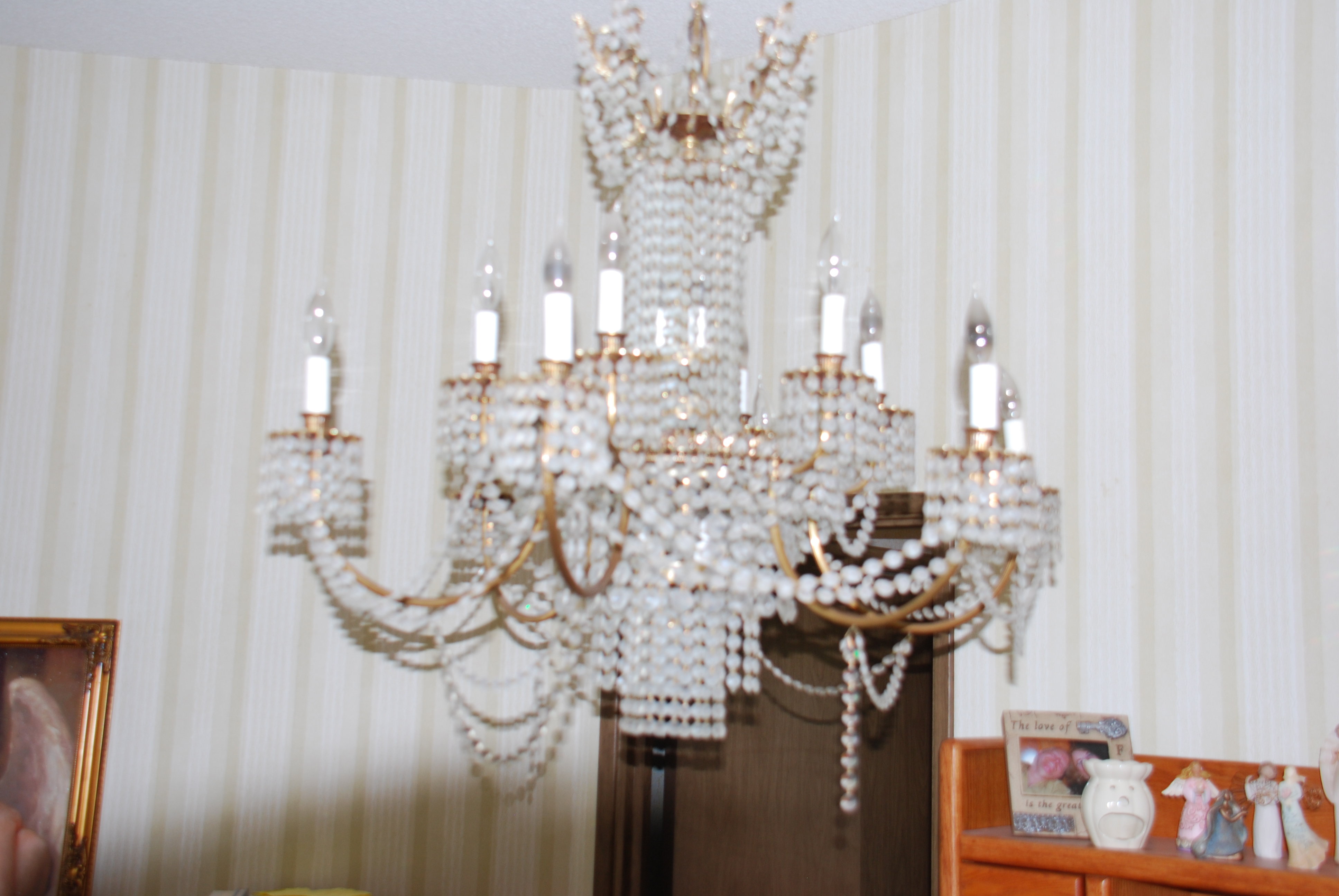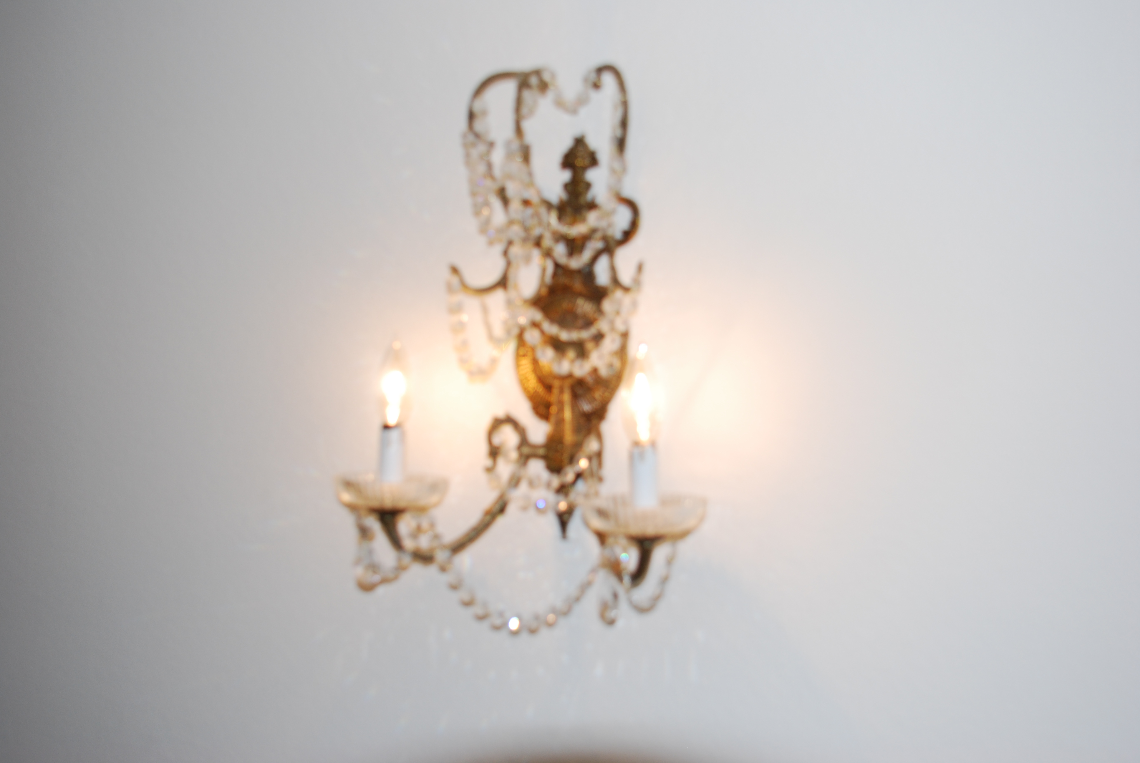 set of three chandeliers one about 3 feet acress 1 about 2 feet across and one wall sconce made