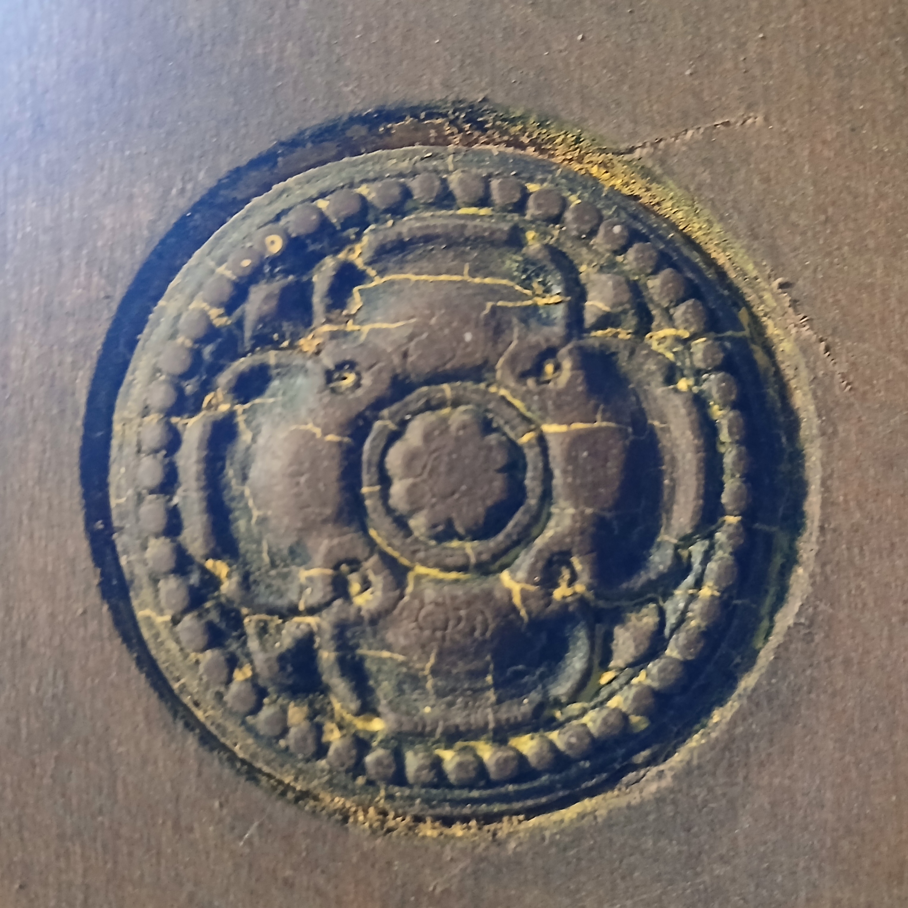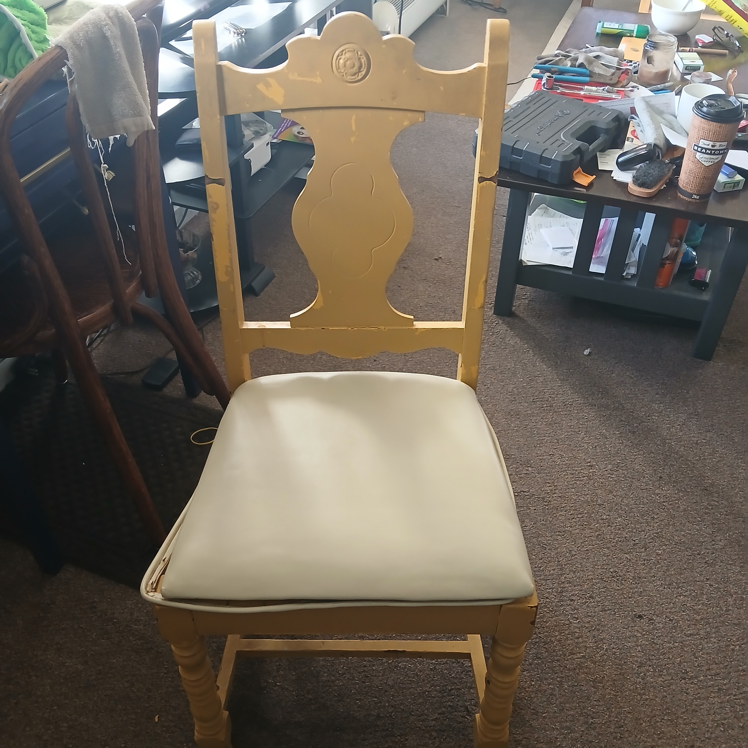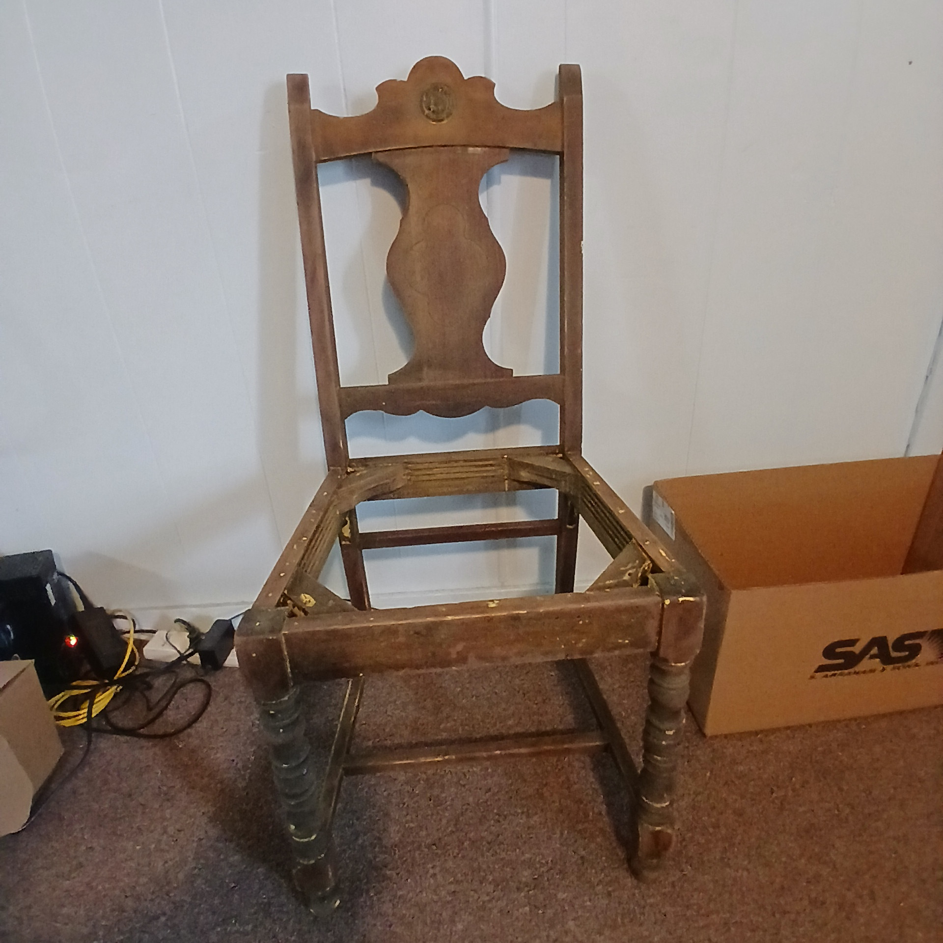Condition Assessment: The chair is in fair condition, showing signs of previous restoration, including several layers of paint that have been removed. There are visible wear marks and scratches on the wood, particularly around the emblem and the edges of the seat. The original hardware, including tacks and screws, remains intact, which is a positive aspect for collectors.