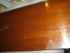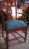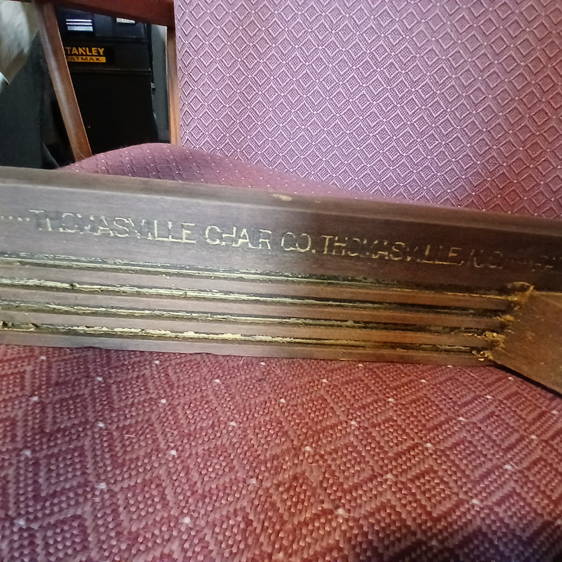 The chair looks to be arts and craft Thomasville chair. Several layers of paint were removed to expose the metal emblem on the top front of the chair back. Also revealed was a cross design on the front, center of the back. Wood is mahogany wit a very nice petina. I want to finish the piece with the correct priod finish and period fabric if possible. All the hardware is original down to the tacks and screws. I want to keep the chair's value and charm.