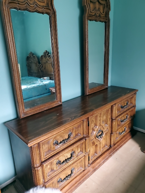 Thomasville Double Mirror Dresser 2 nightstands , Headboard Says 2080 -247 epic pecan
