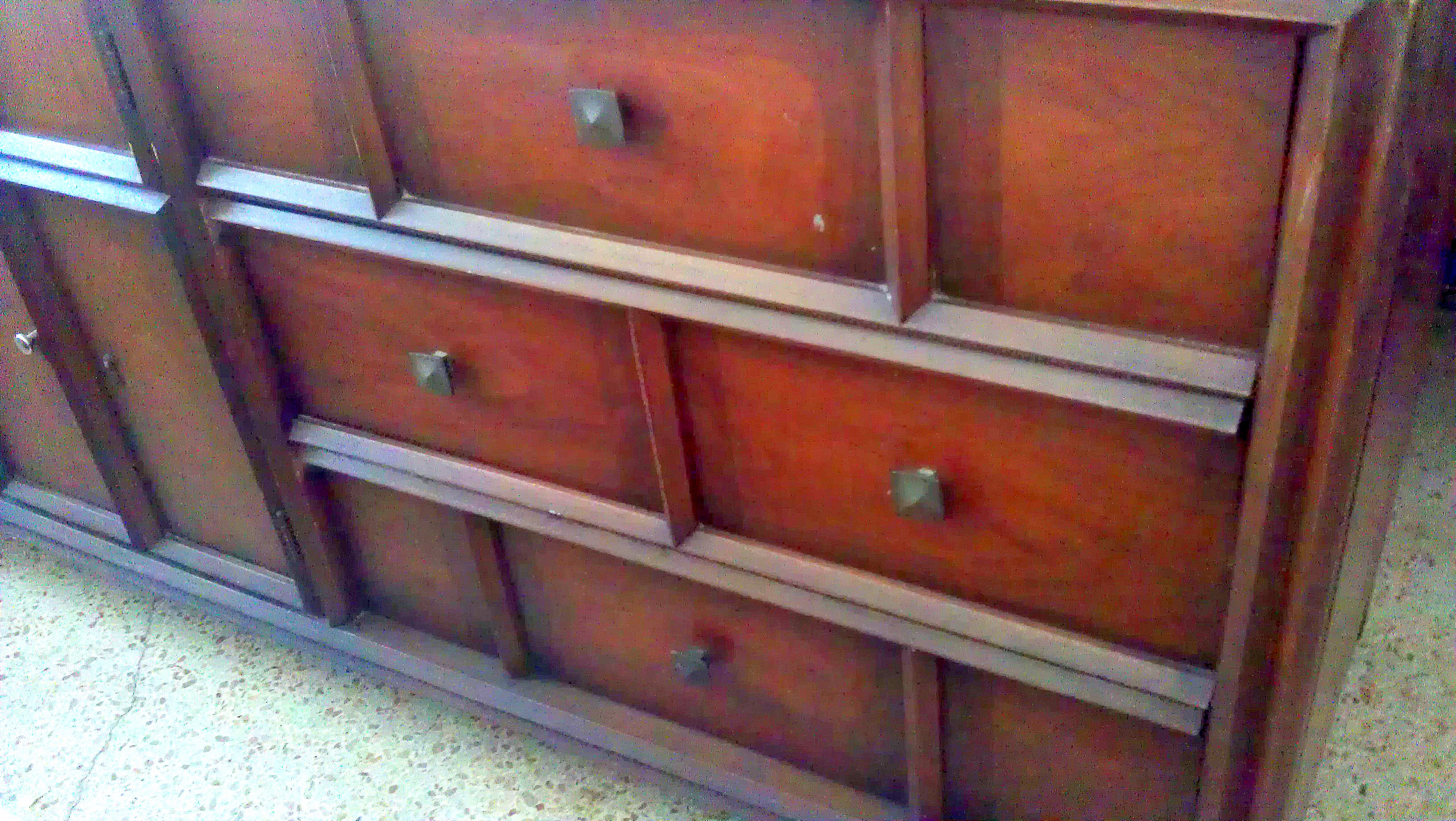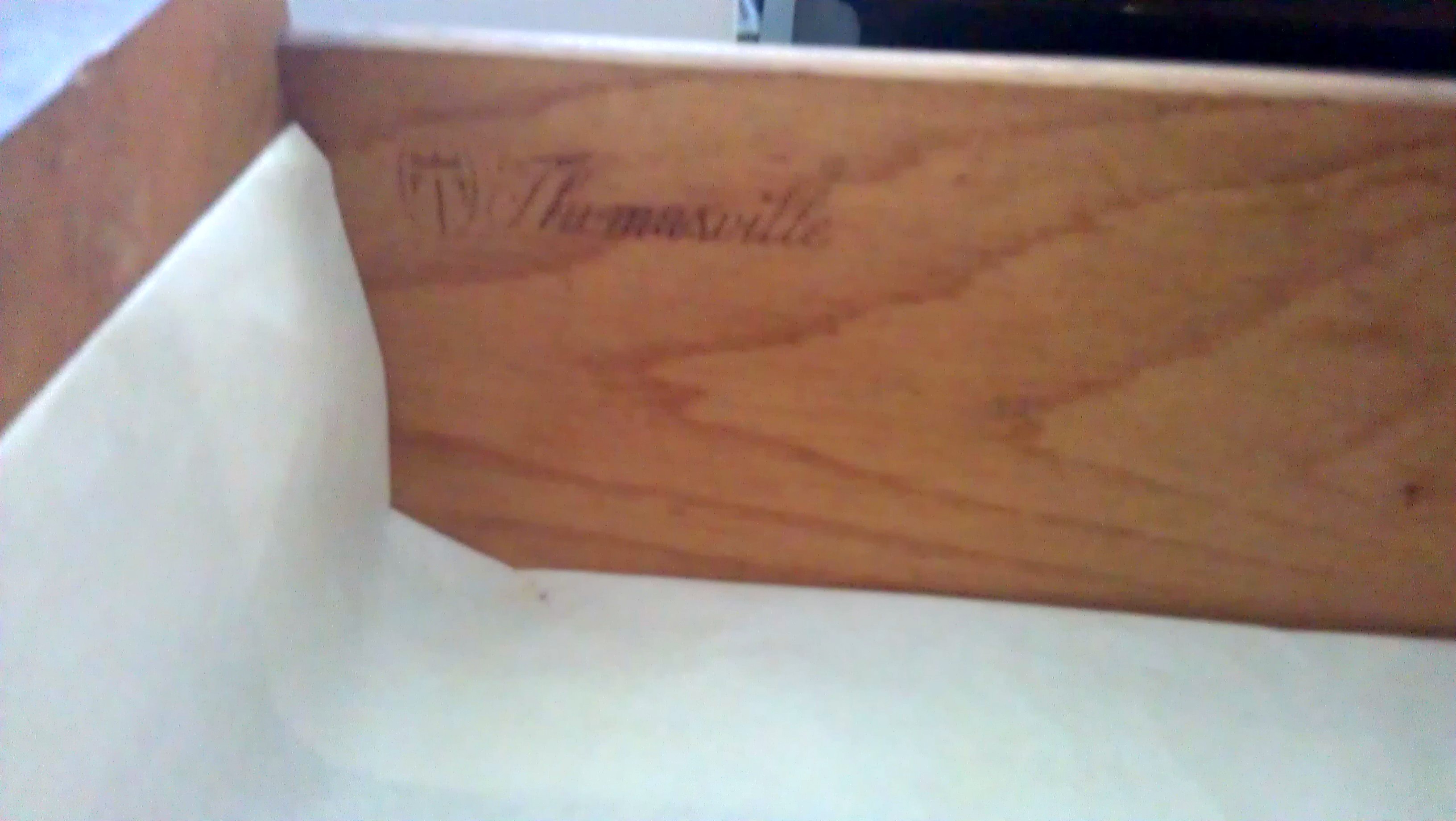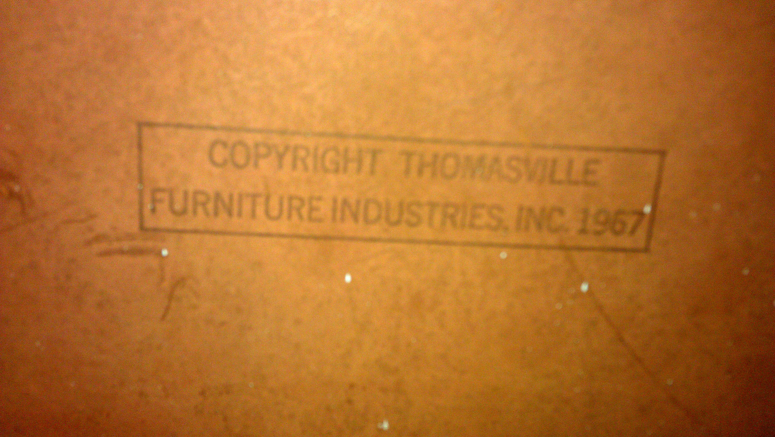 Thomasville Furniture Corporation c. 1967 imprinted on the back, pictured below. Thomasville logo imprinted on left hand door, pictured below. 9 drawers in total, 3 smaller drawers are behind 2 doors in the middle. Upper right drawer has wooden change organizer. Middle right drawer has wooden drawer divider. Solid Wood with dovetail joints. VERY HEAVY. Just got it home from thrift store to find the nice surprise imprinted on left hand drawer "Thomasville" now I am curious about the value, pictured below is as-is condition. I would like to restore. What is the appraisal value as-is and restored? Any recommendations concerning restoration greatly appreciated. Thank you!