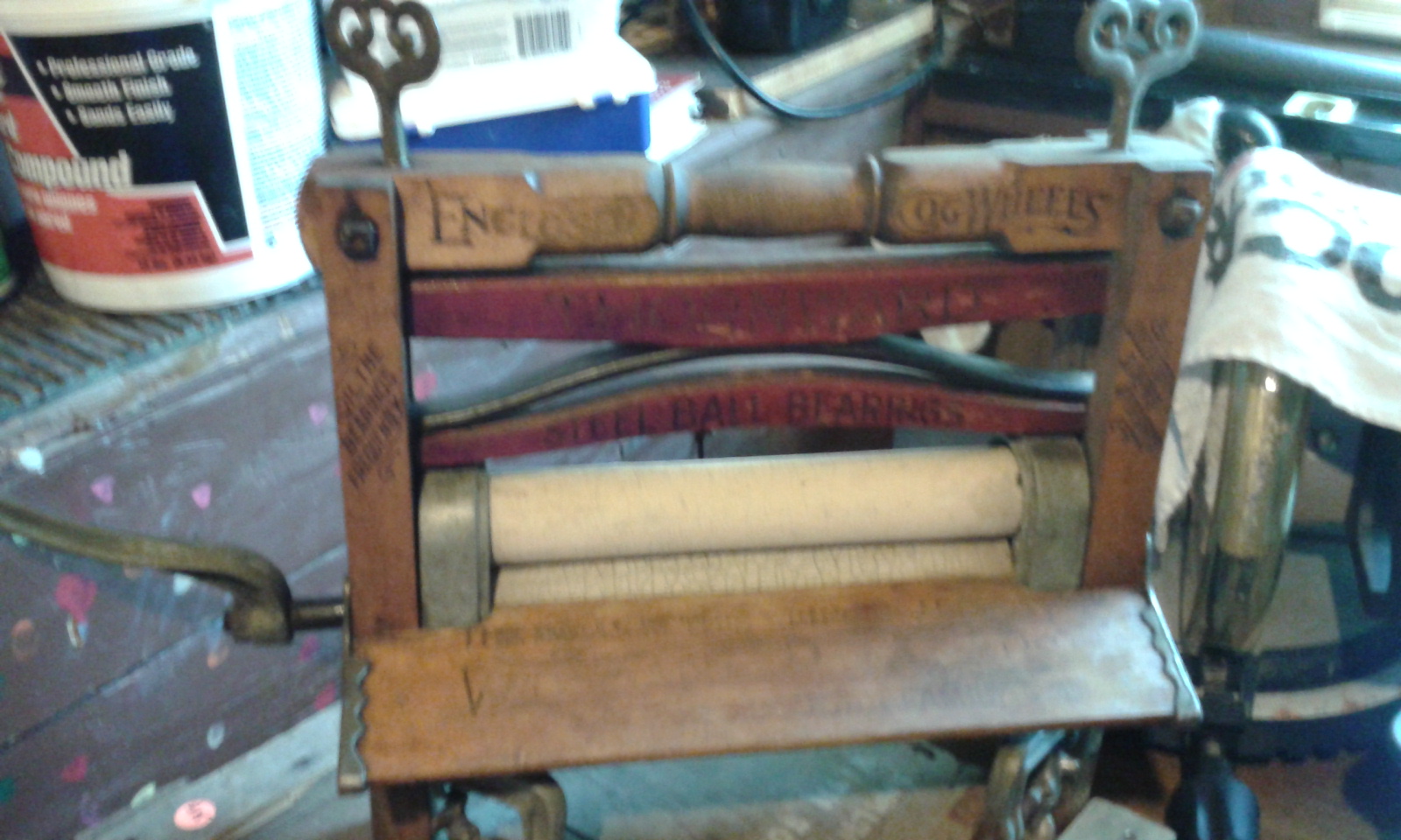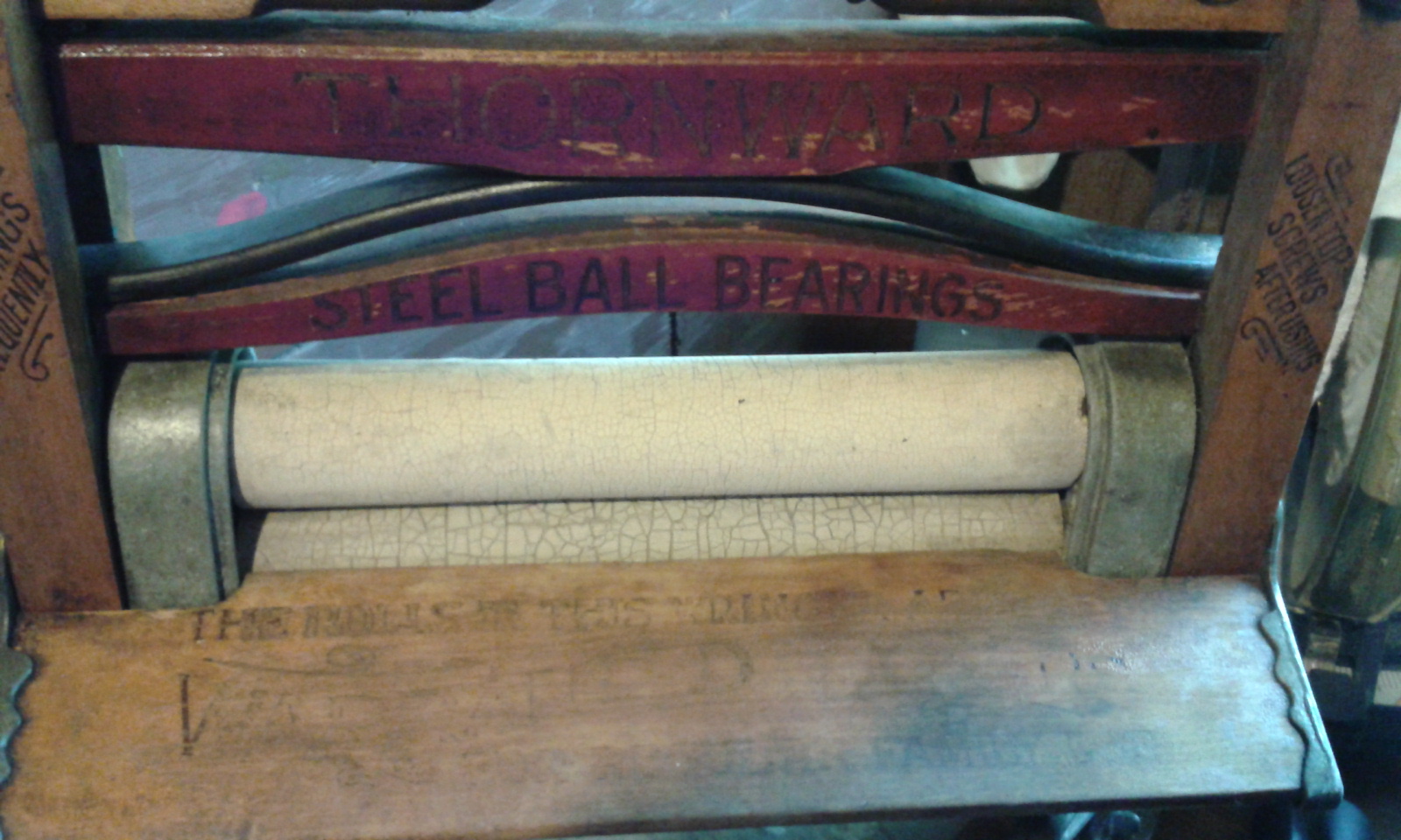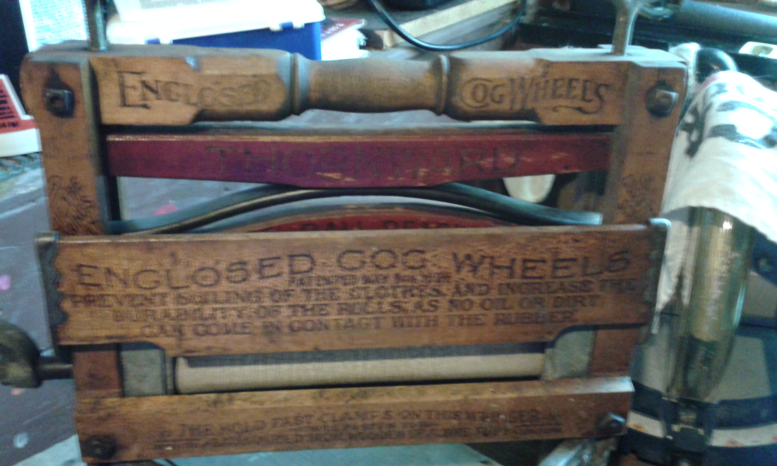 Thornward No. 790 wringer, enclosed cog wheels, steel ball bearings.  Moveable hinges on bottom (for round tub?)